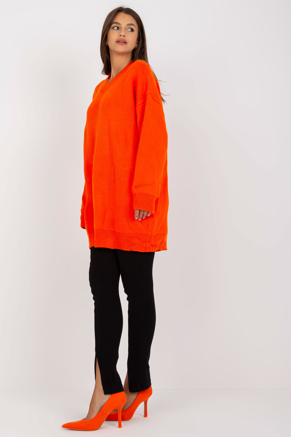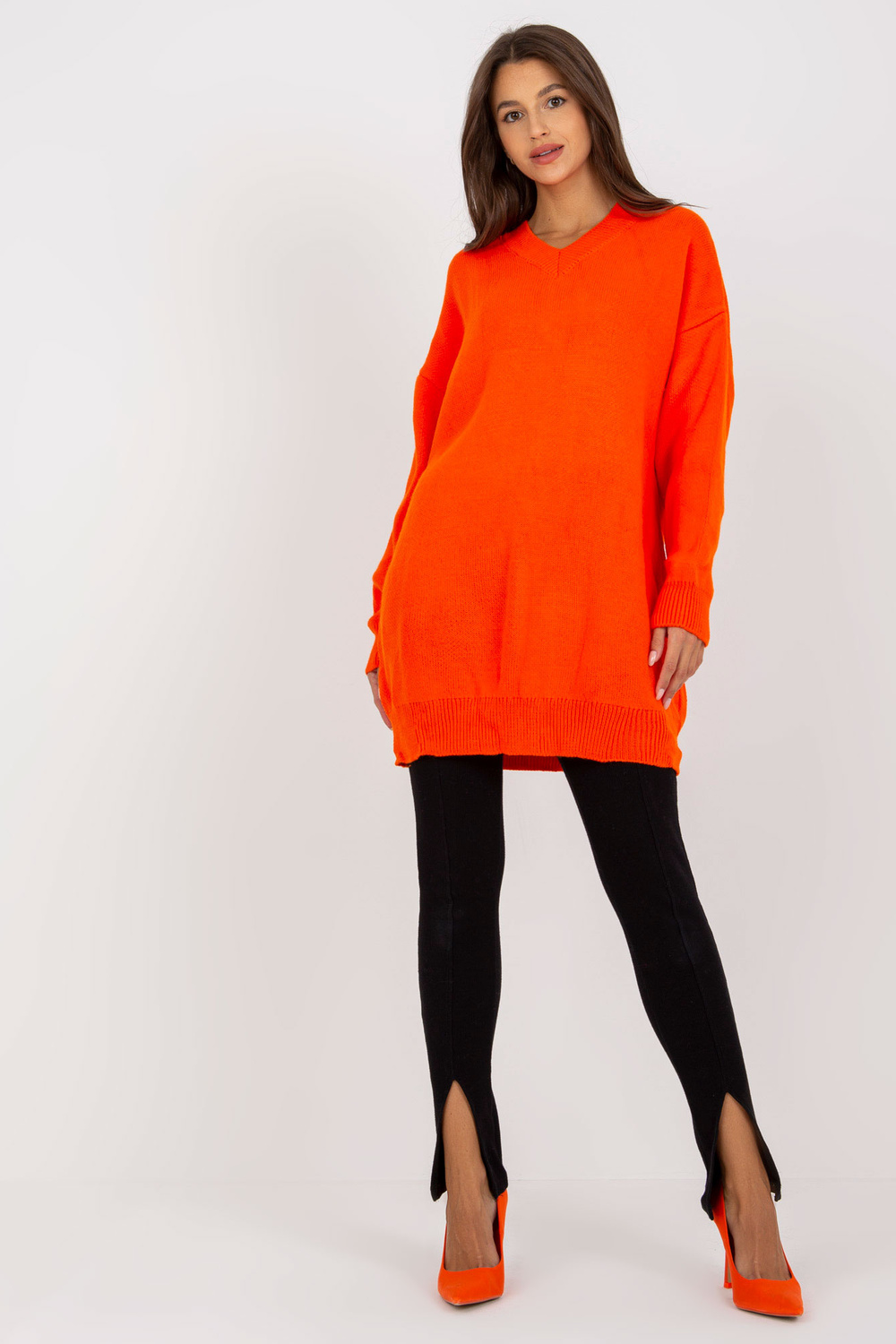 Oranža trikotāžas kleita ar V RUE PARIS kakla izgriezumu .