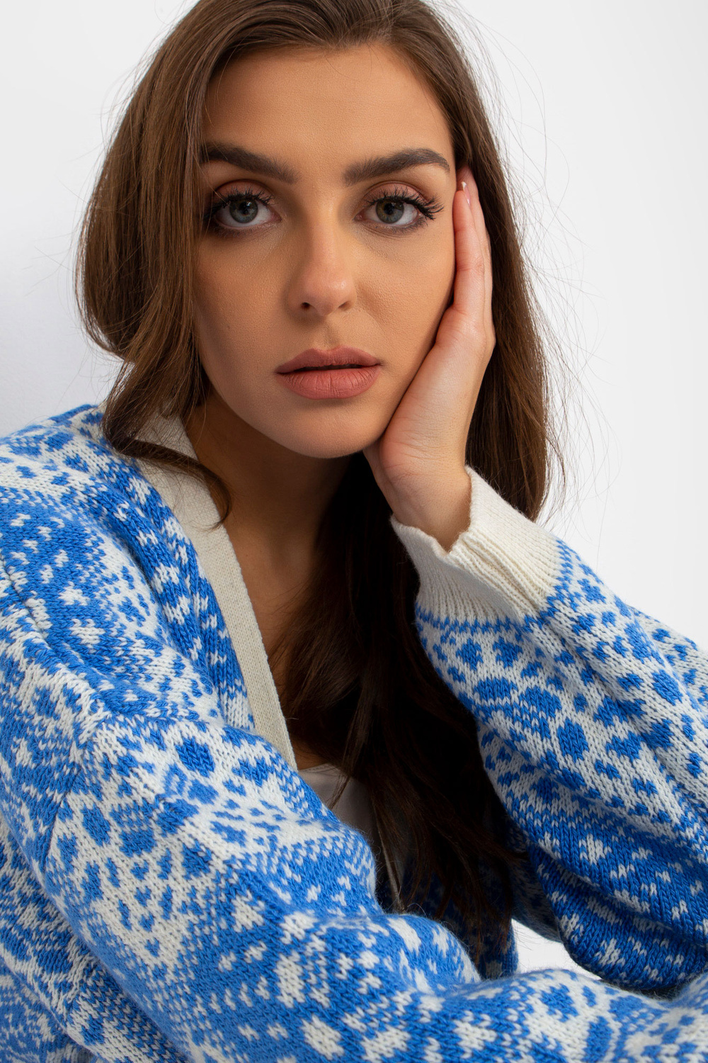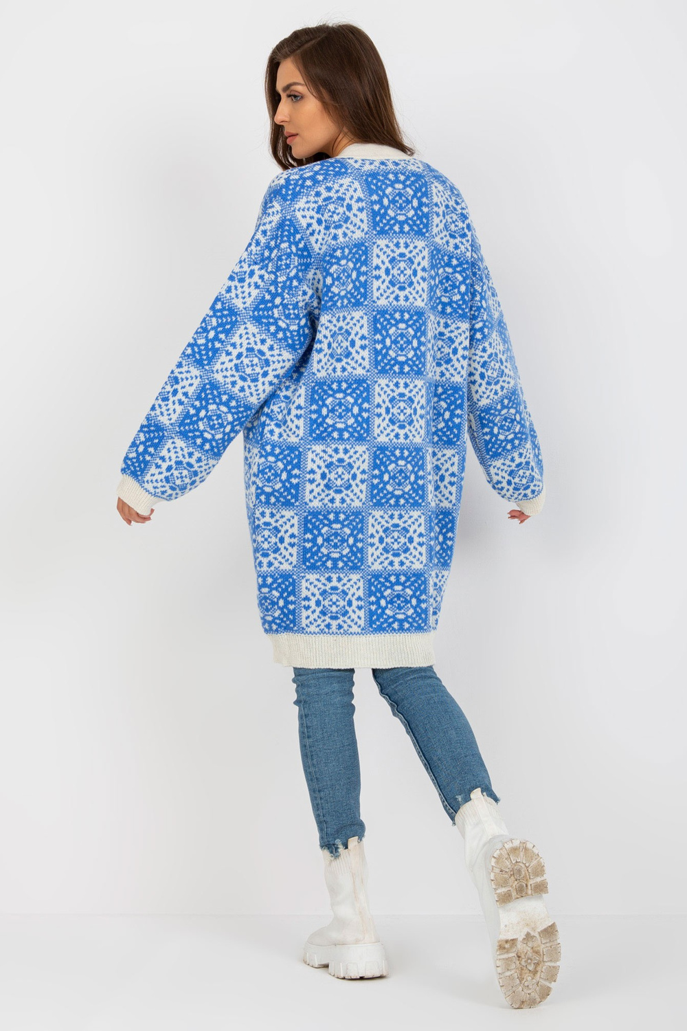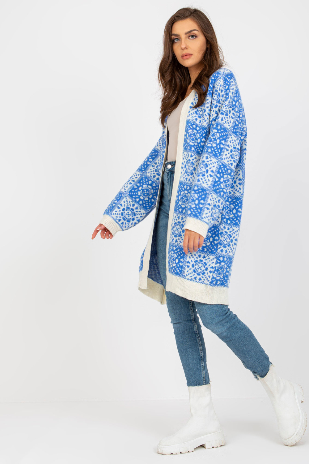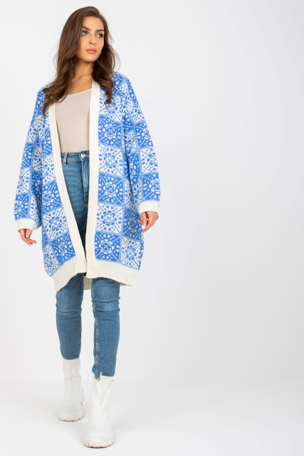 Sieviešu jaka ar baltu un zilu rakstu RUE PARIS . Produkta kods: LC-SW-0301.45P dominējošais raksts: gluds Stils: neformāls gadījums: ikdienišķs, ārpus pilsētas, pastaigāties, uz darbu Modelis valkā viena izmēra izmēru. Modeļa izmēri: augums 173 cm, krūtis 86 cm