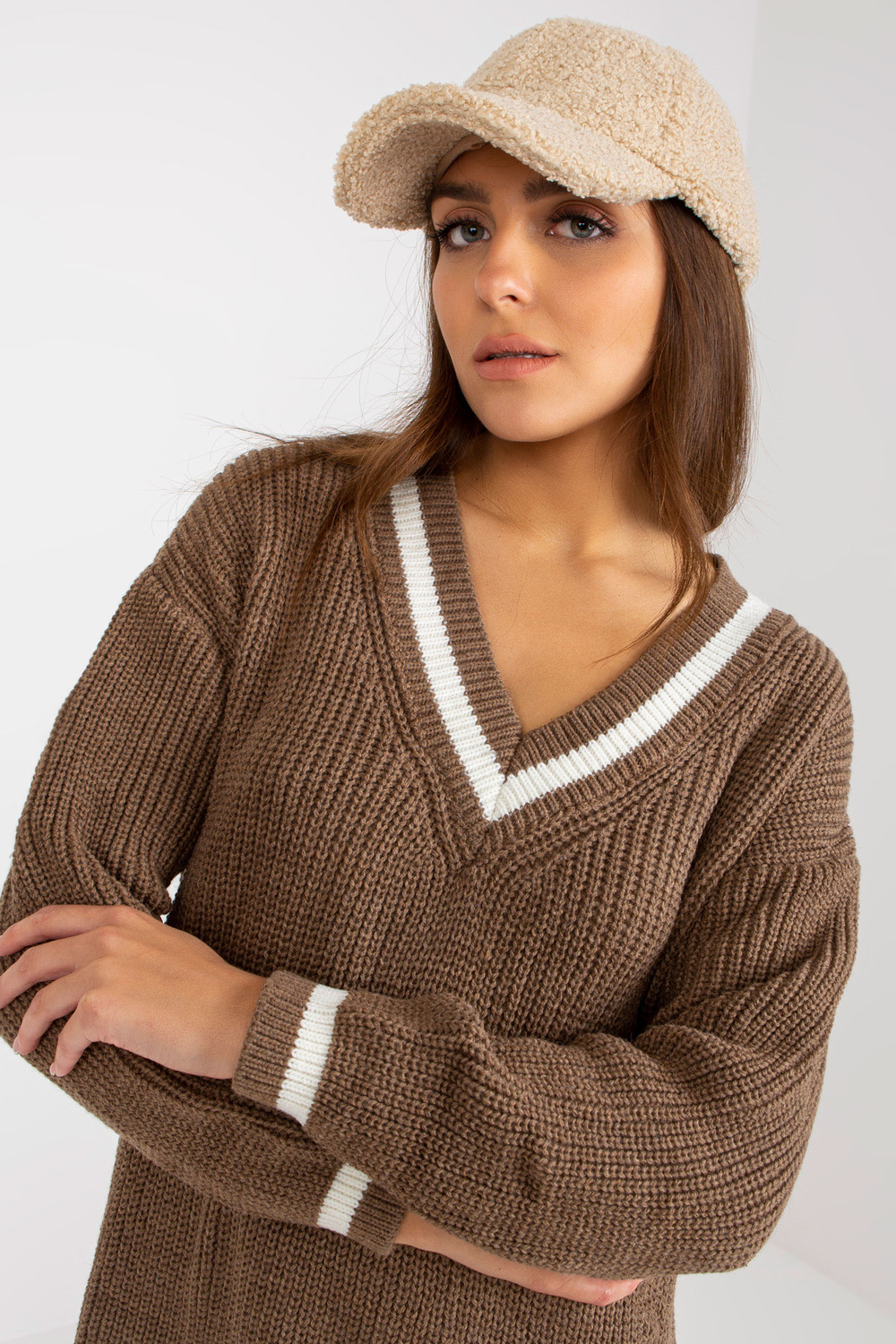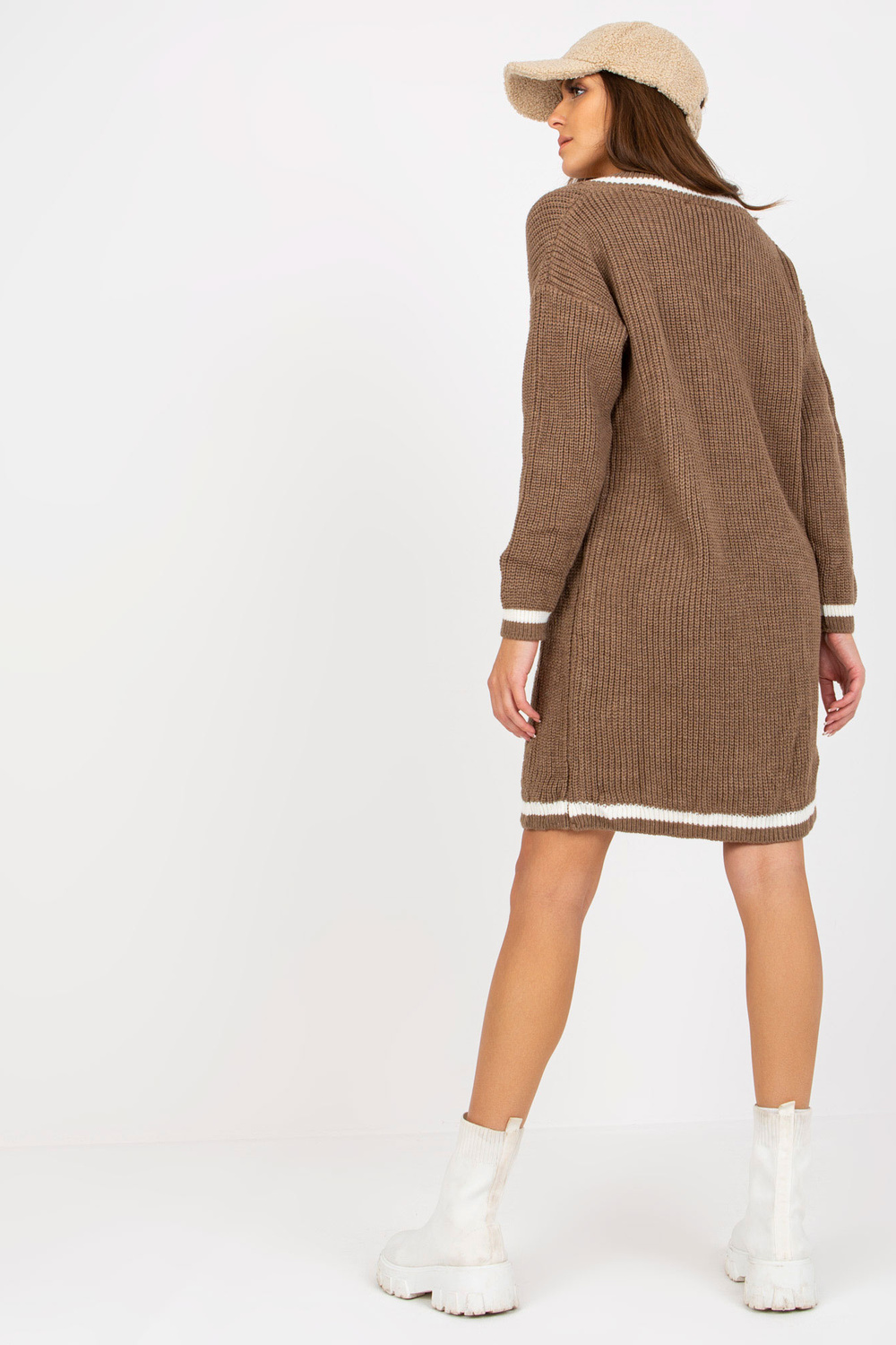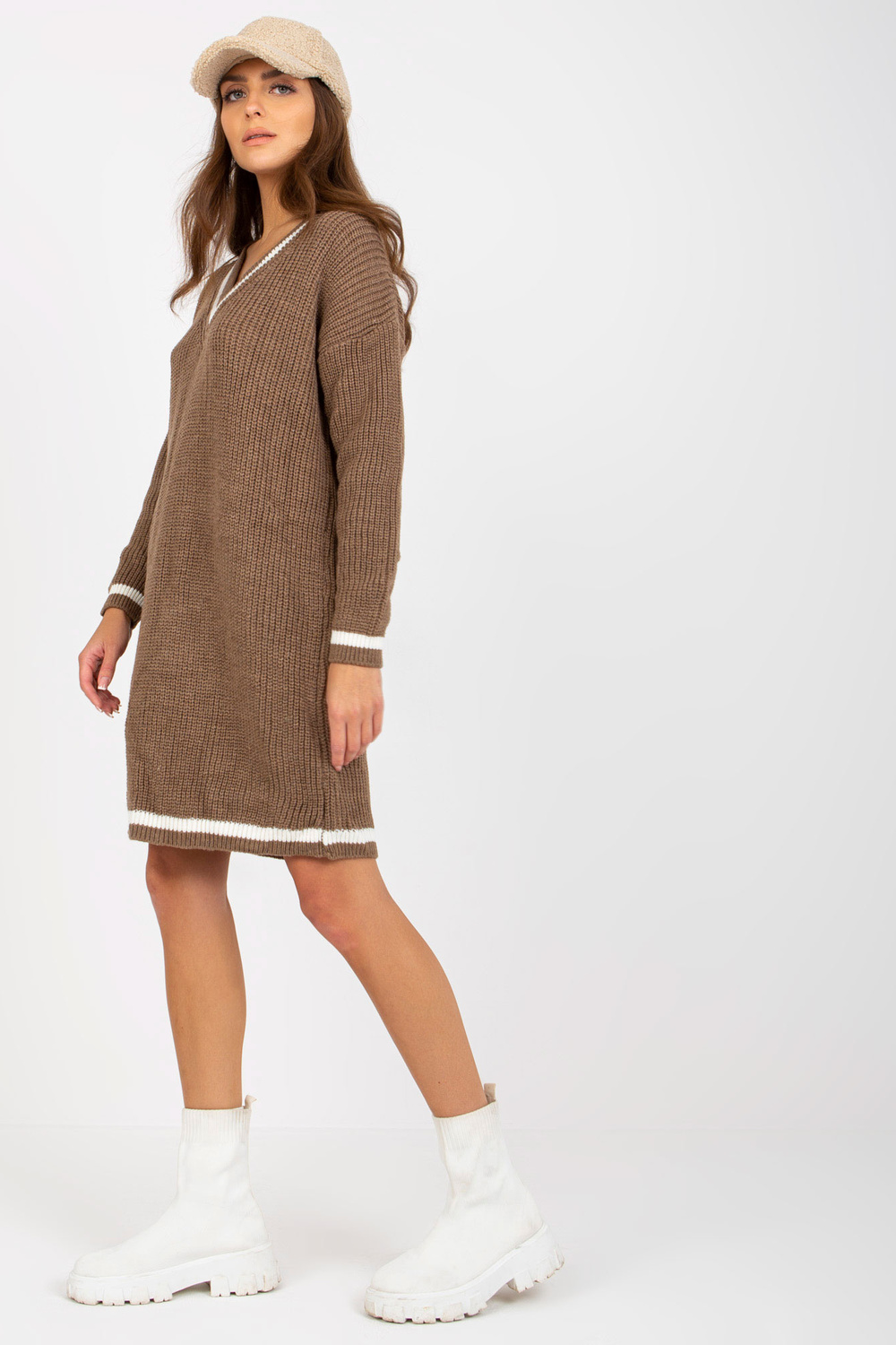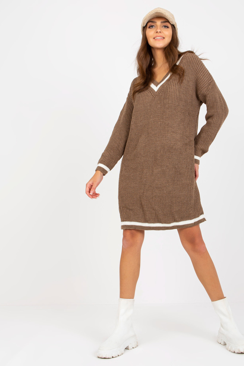 Brūna, brīva trikotāžas kleita ar V RUE PARIS kakla izgriezumu.