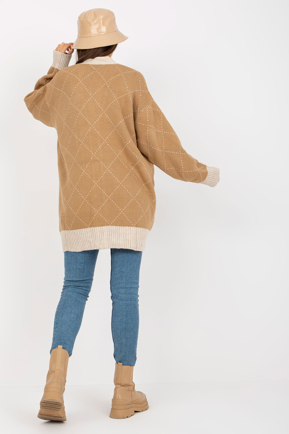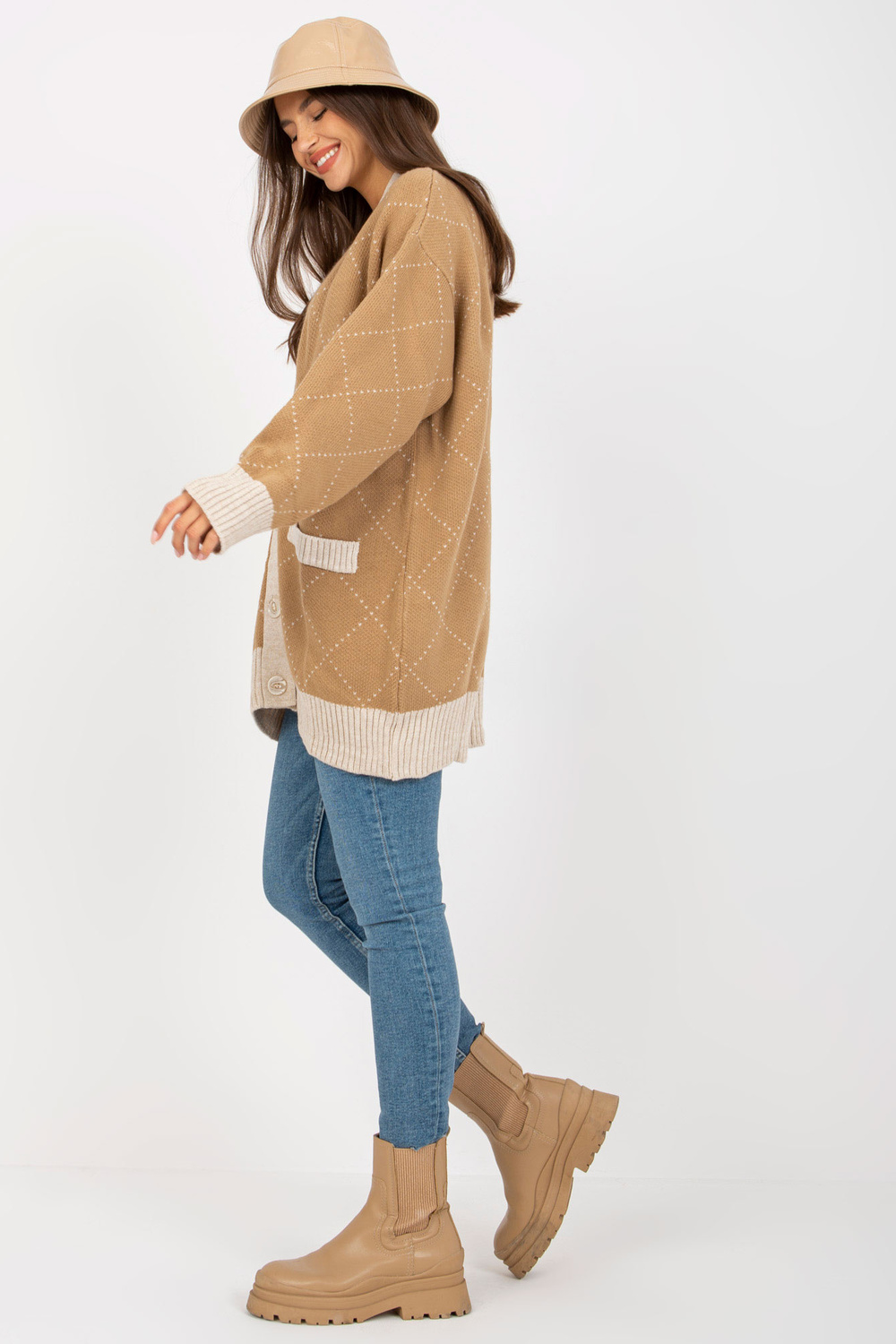 Camelcardigan ar pogas aizdari RUE PARIS . Produkta kods: LC-SW-0258.03P dominējošais raksts: gluds Stils: neformāls gadījums: ikdienišķs, ārpus pilsētas, pastaigāties, uz darbu Modelis valkā viena izmēra izmēru. Modeļa izmēri: augums 172 cm, krūtis 88 cm, viduklis