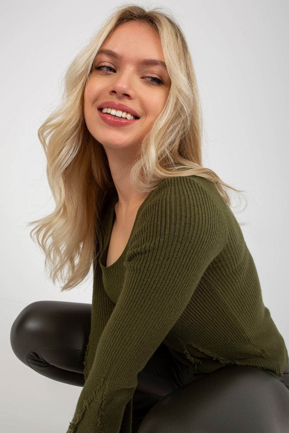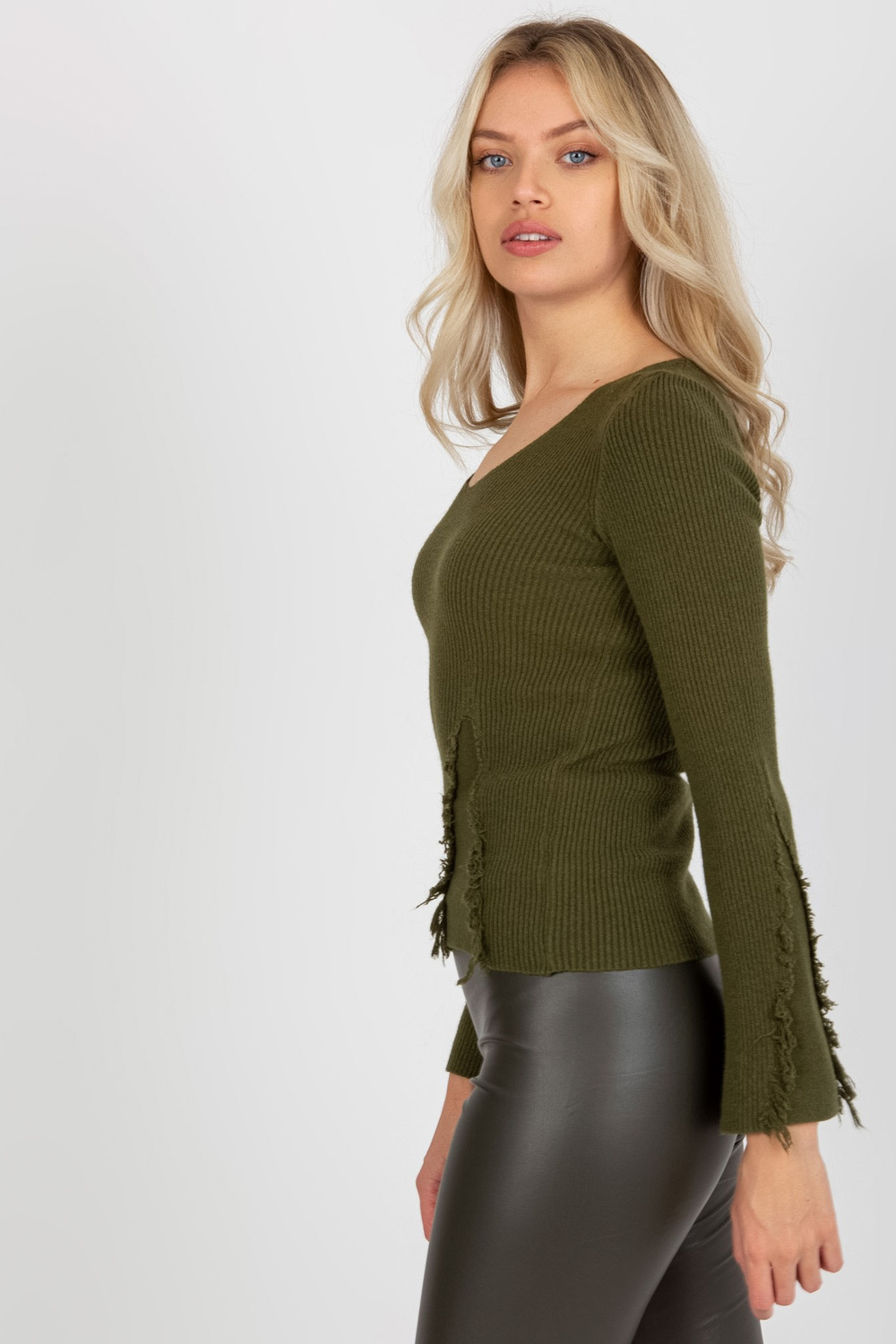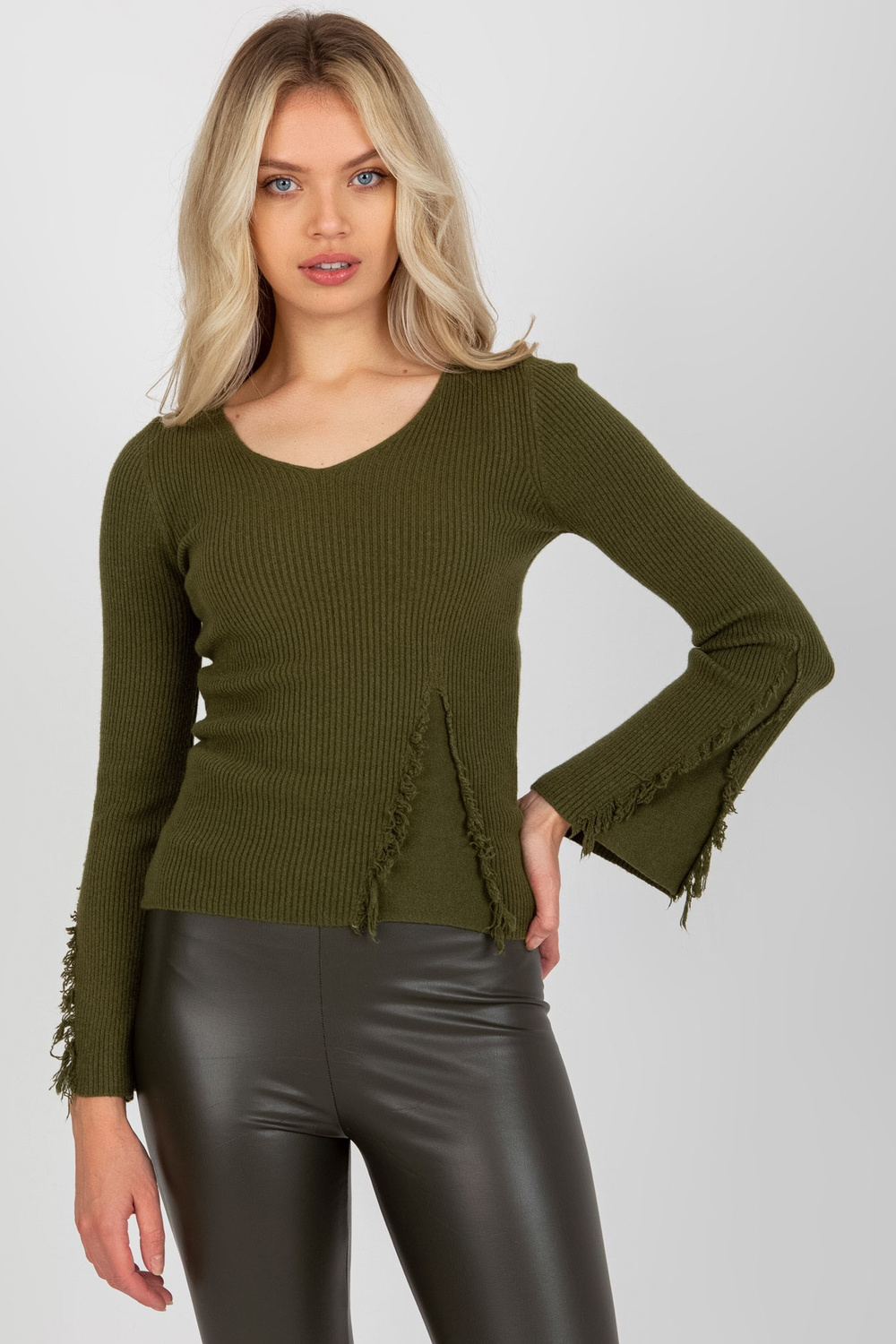 Khaki krāsas rievotu klasisks džemperis ar V veida kakla izgriezumu< /strong> .