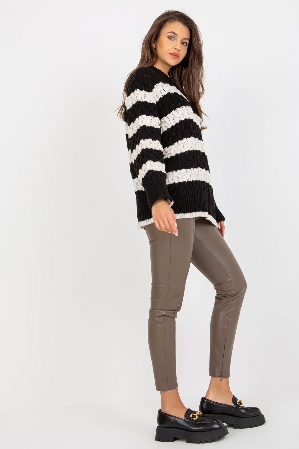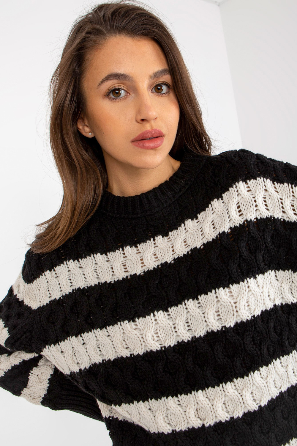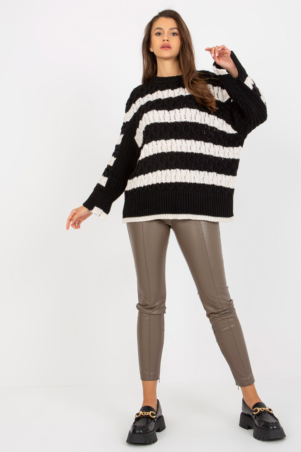 Schwarz-ecru gestrickter Oversize-Pullover ar Streifen.