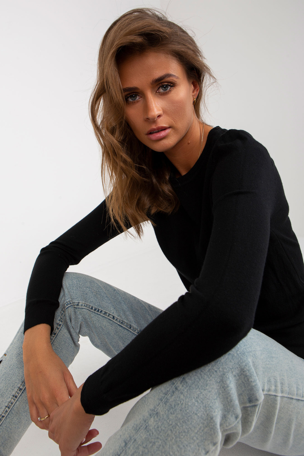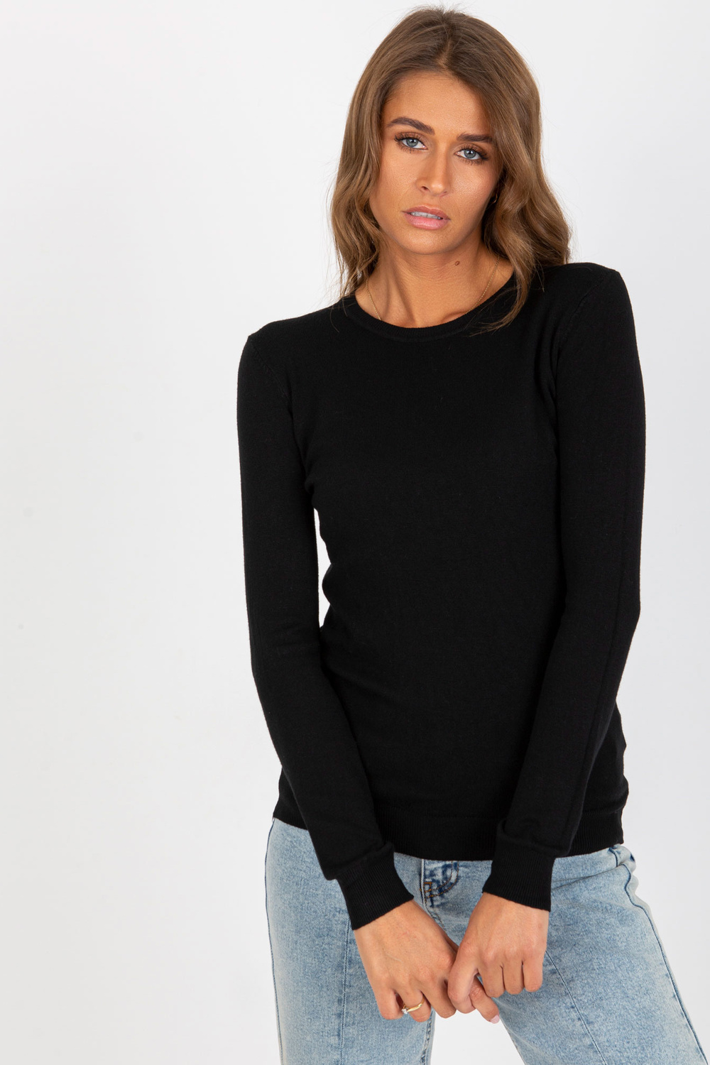 Melns klasisks džemperis ar apaļu kakla izgriezumu.