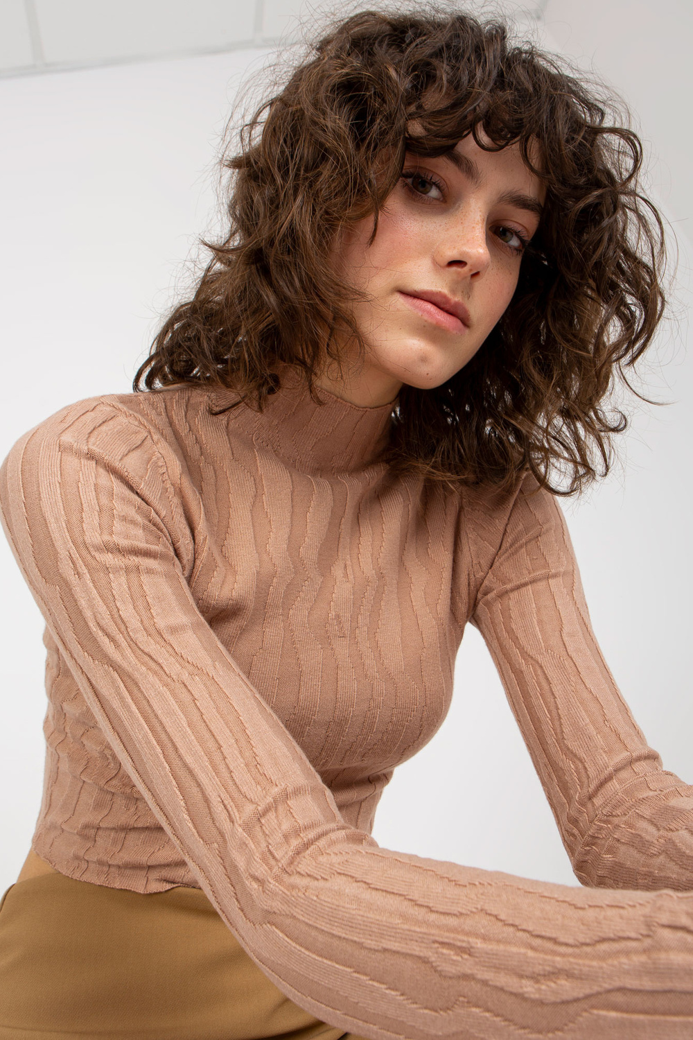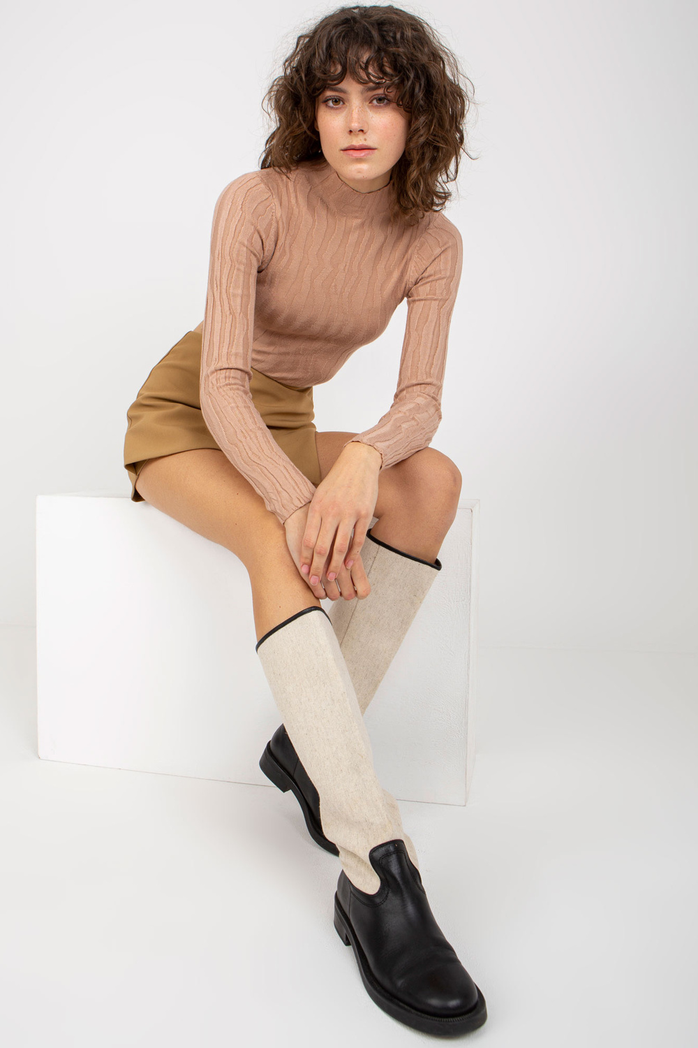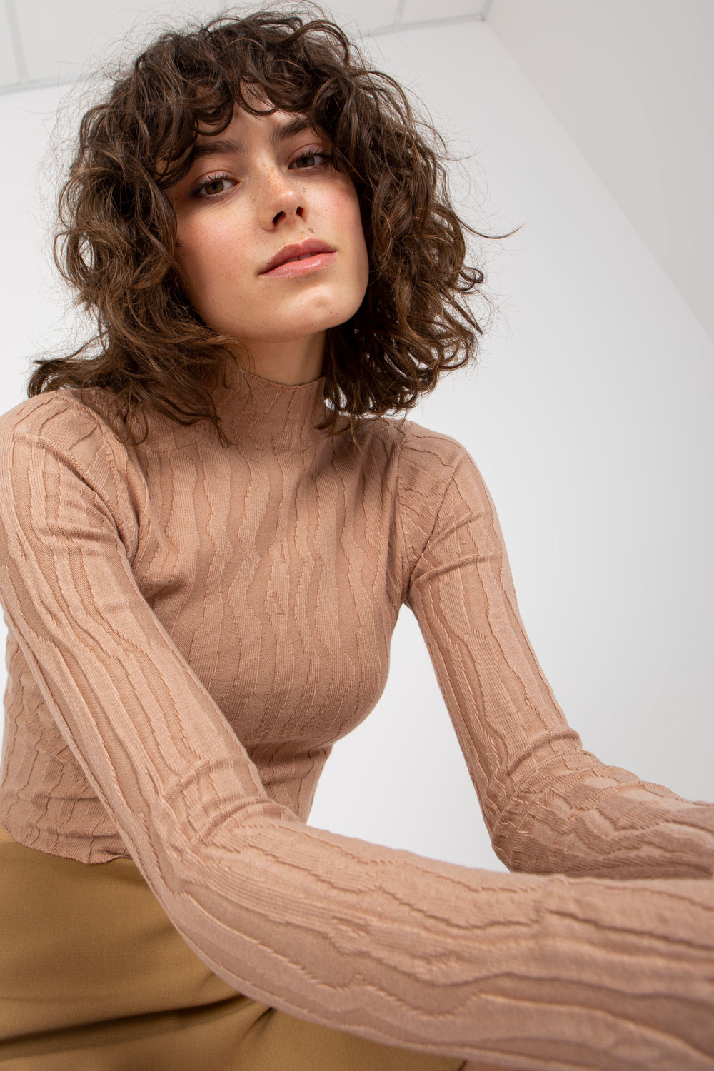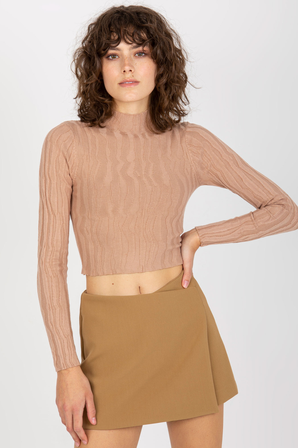 Īss, tumši smilškrāsas džemperis ar pieguļošu apkakli.