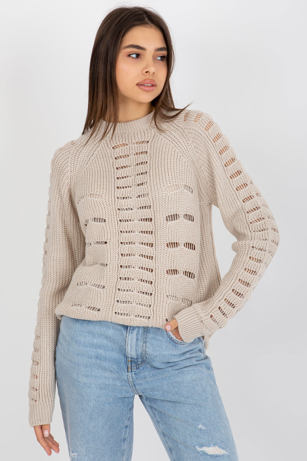 Bēšs, garāks oversize džemperis ar ažūra rakstu.