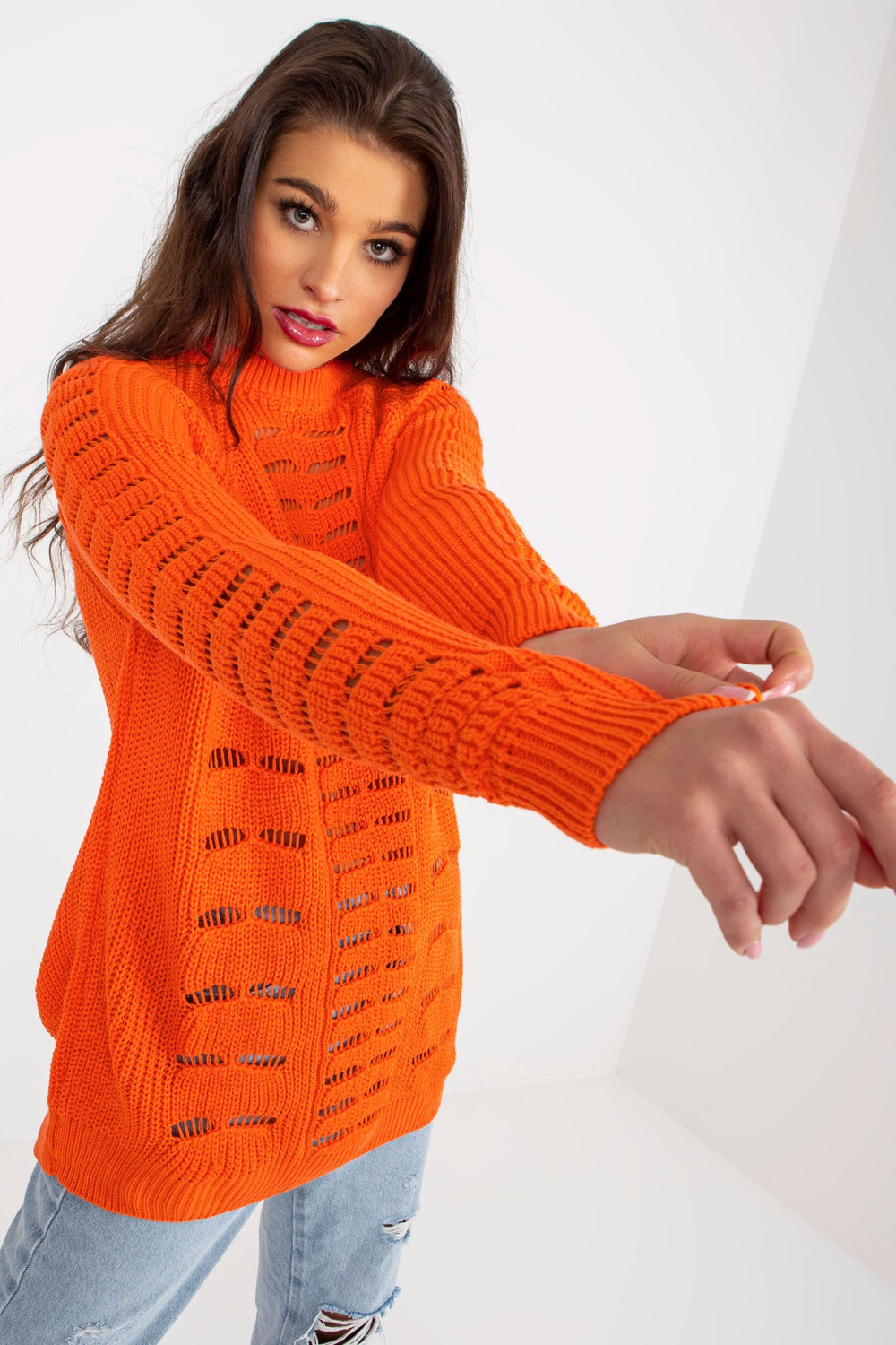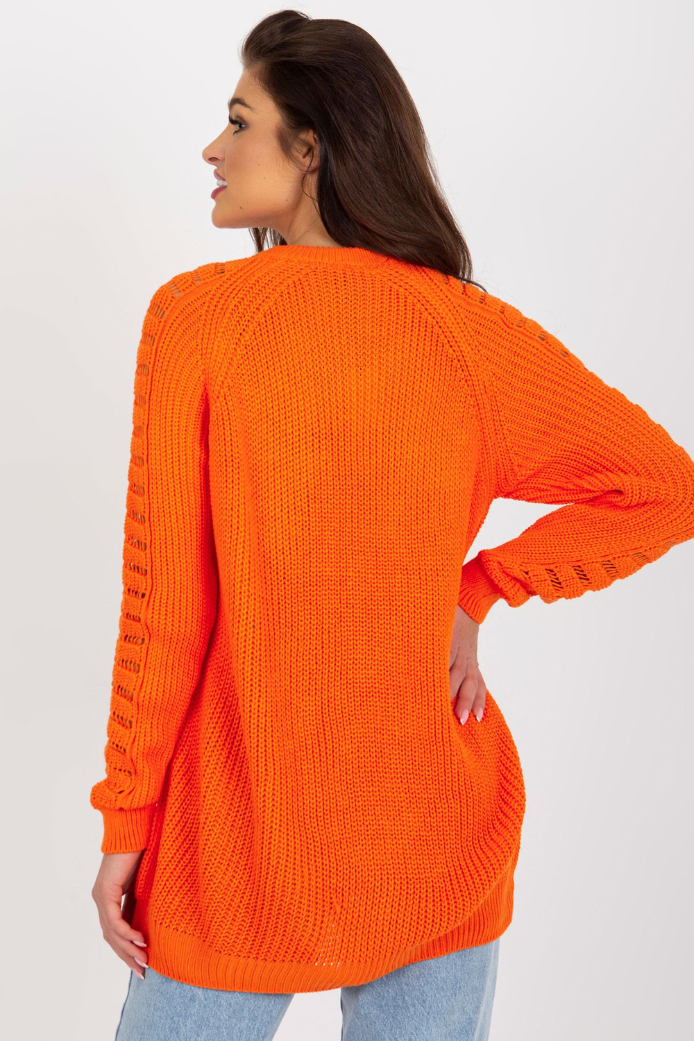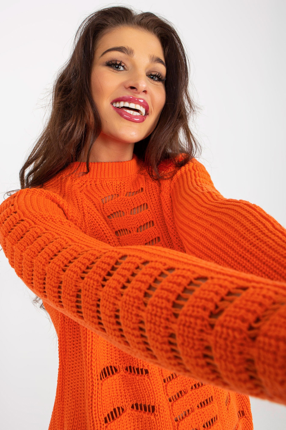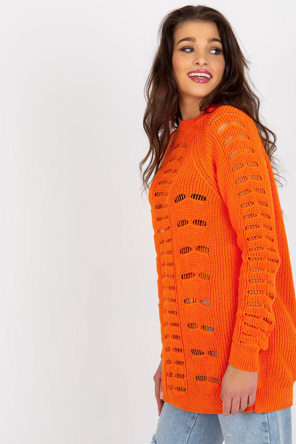 Oranžs sieviešu liela izmēra džemperis ar apaļu kakla izgriezumu. Produkta kods: BA-SW-8056.21P Dominējošais raksts: ažūrs Stils: ikdienišķs gadījums: ikdienišķs, ārpus pilsētas, pastaigāties Modele valkā viena izmēra izmēru. Modeļa izmēri: augums 173 cm, krūtis 90 cm, wai