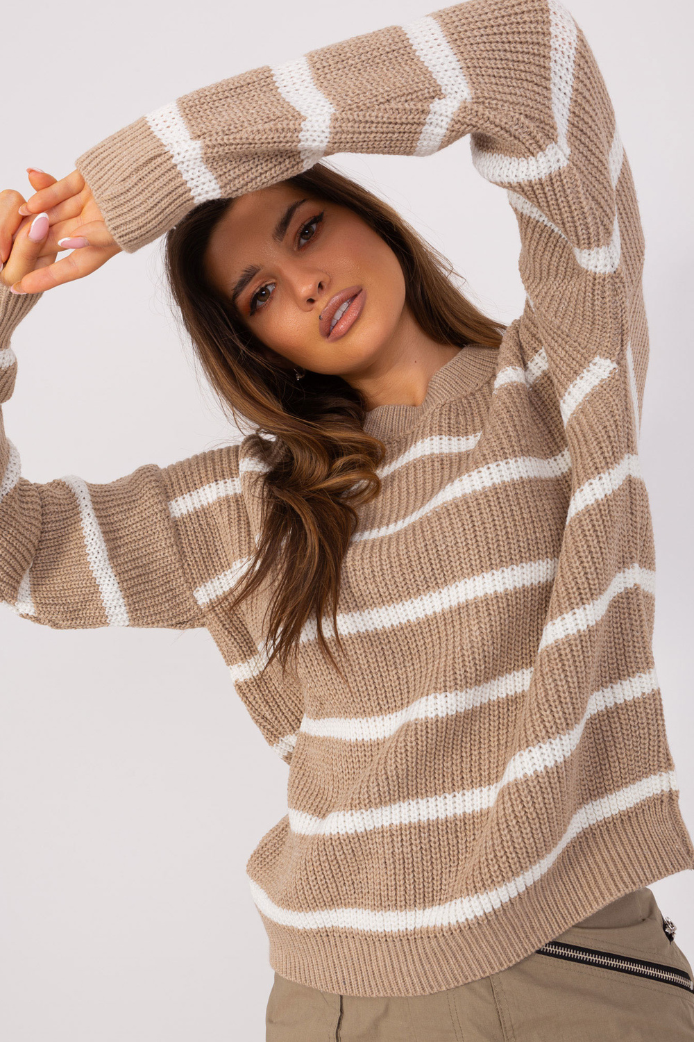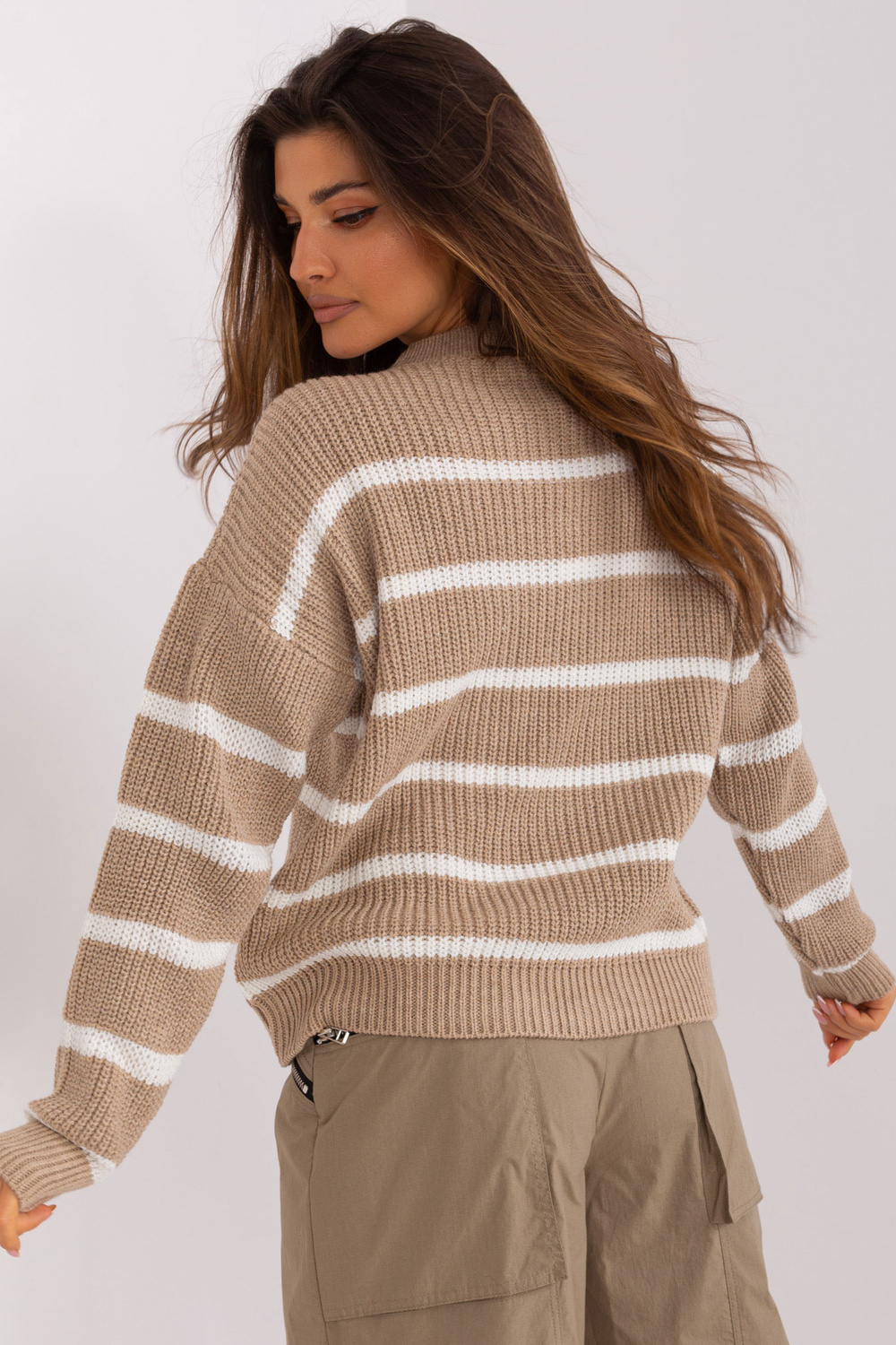 Džempera izmēri viena izmēra izmērā, mērot plakanā: platums zem rokām - 65 cm, piedurknes garums - 64 cm, kopējais garums - 59 cm.