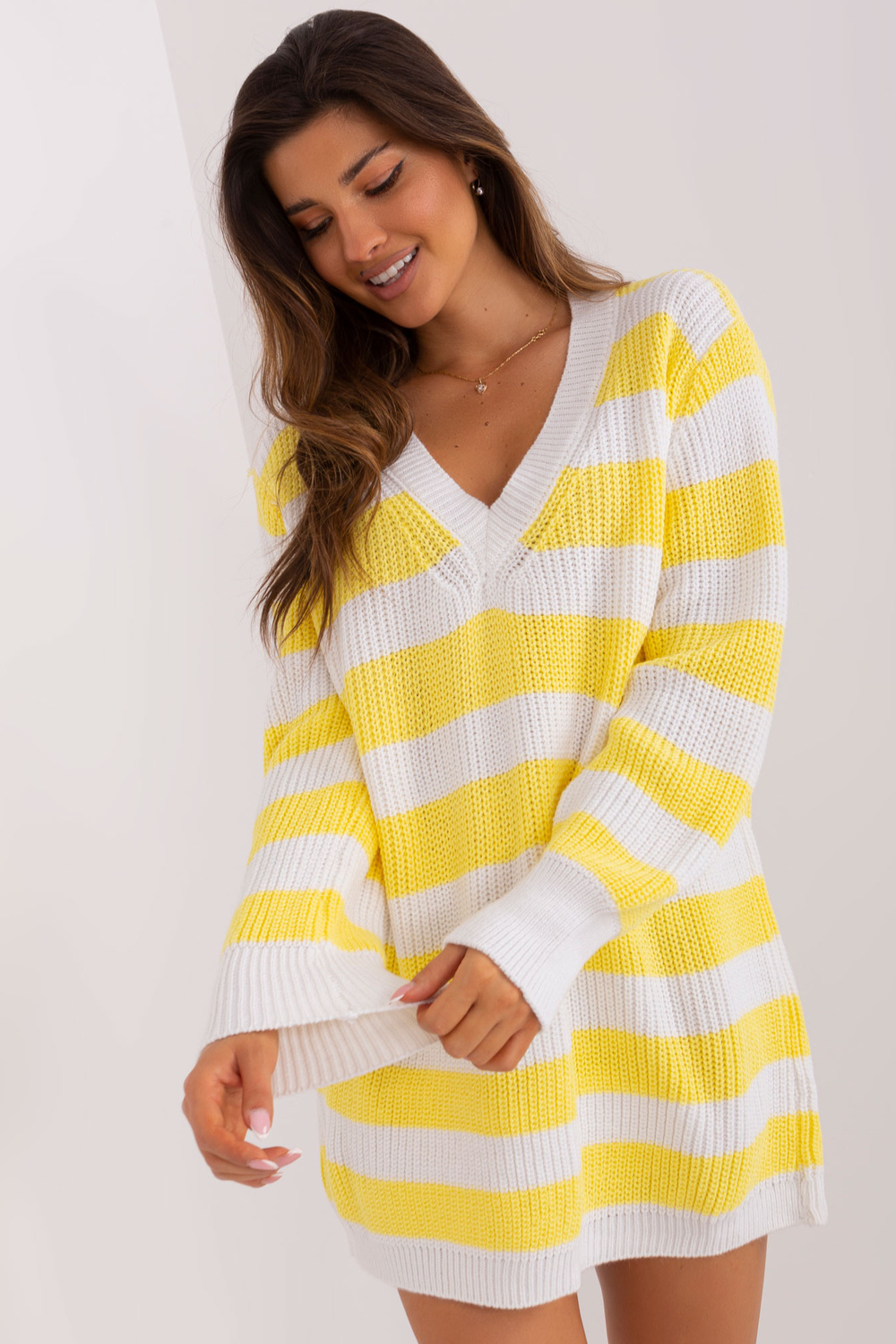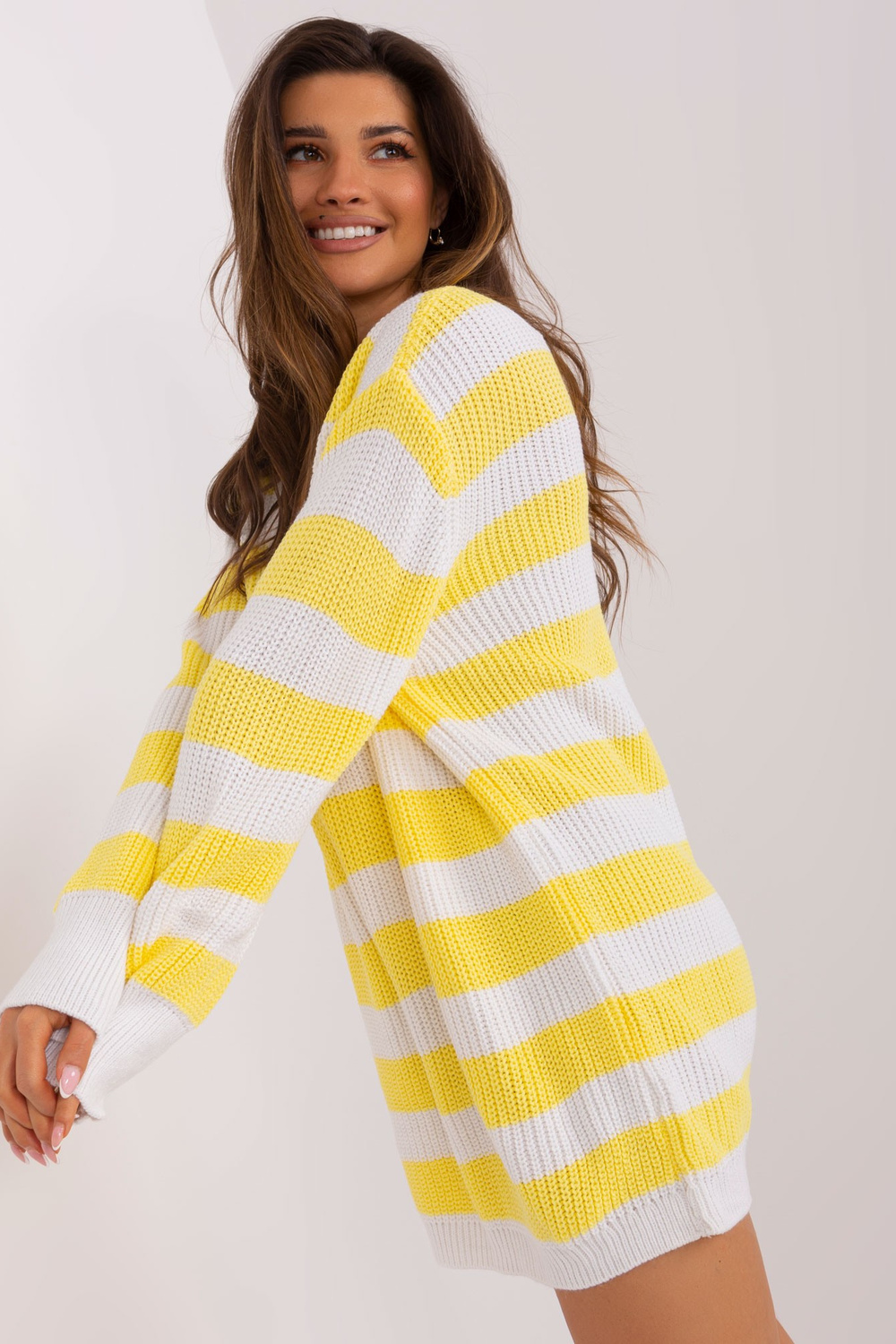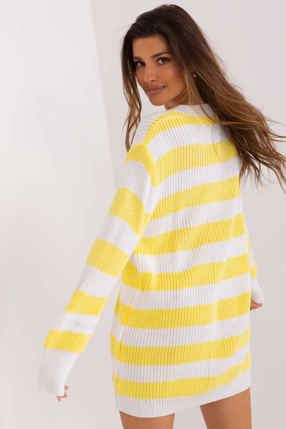 Džempera izmēri viena izmēra izmērā, mērot plakanā: platums zem rokām - 57 cm, piedurknes garums - 76 cm, kopējais garums - 82 cm.