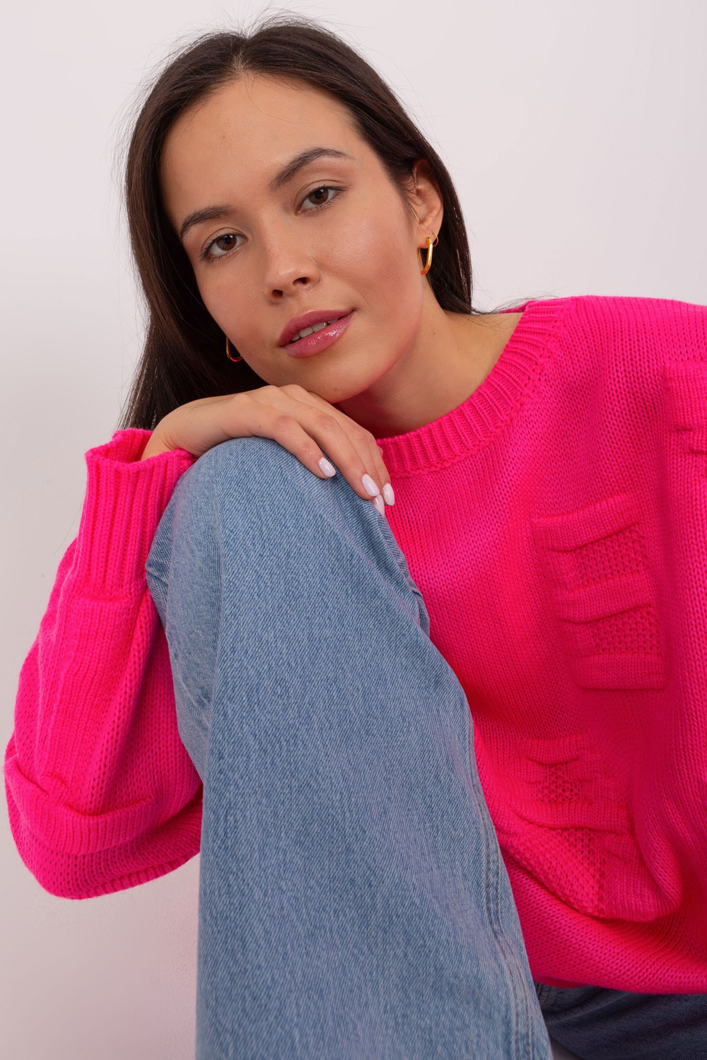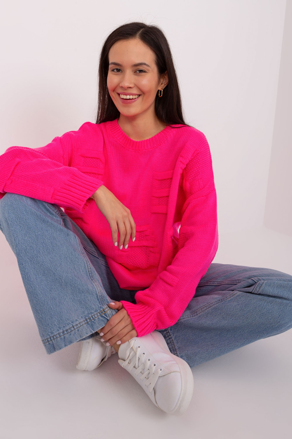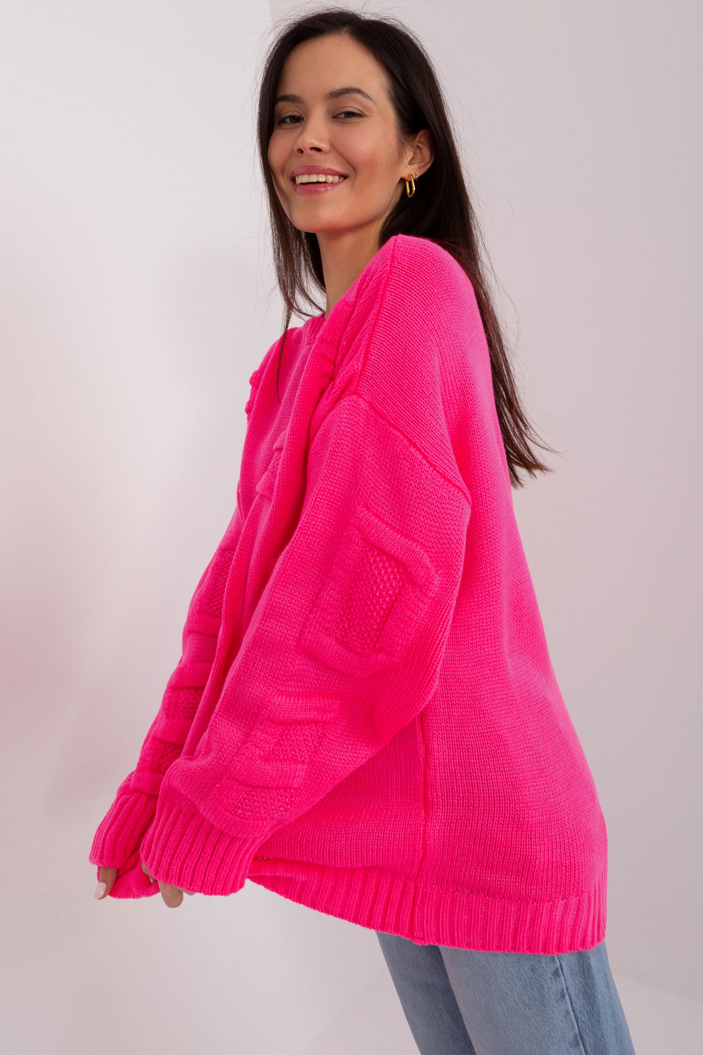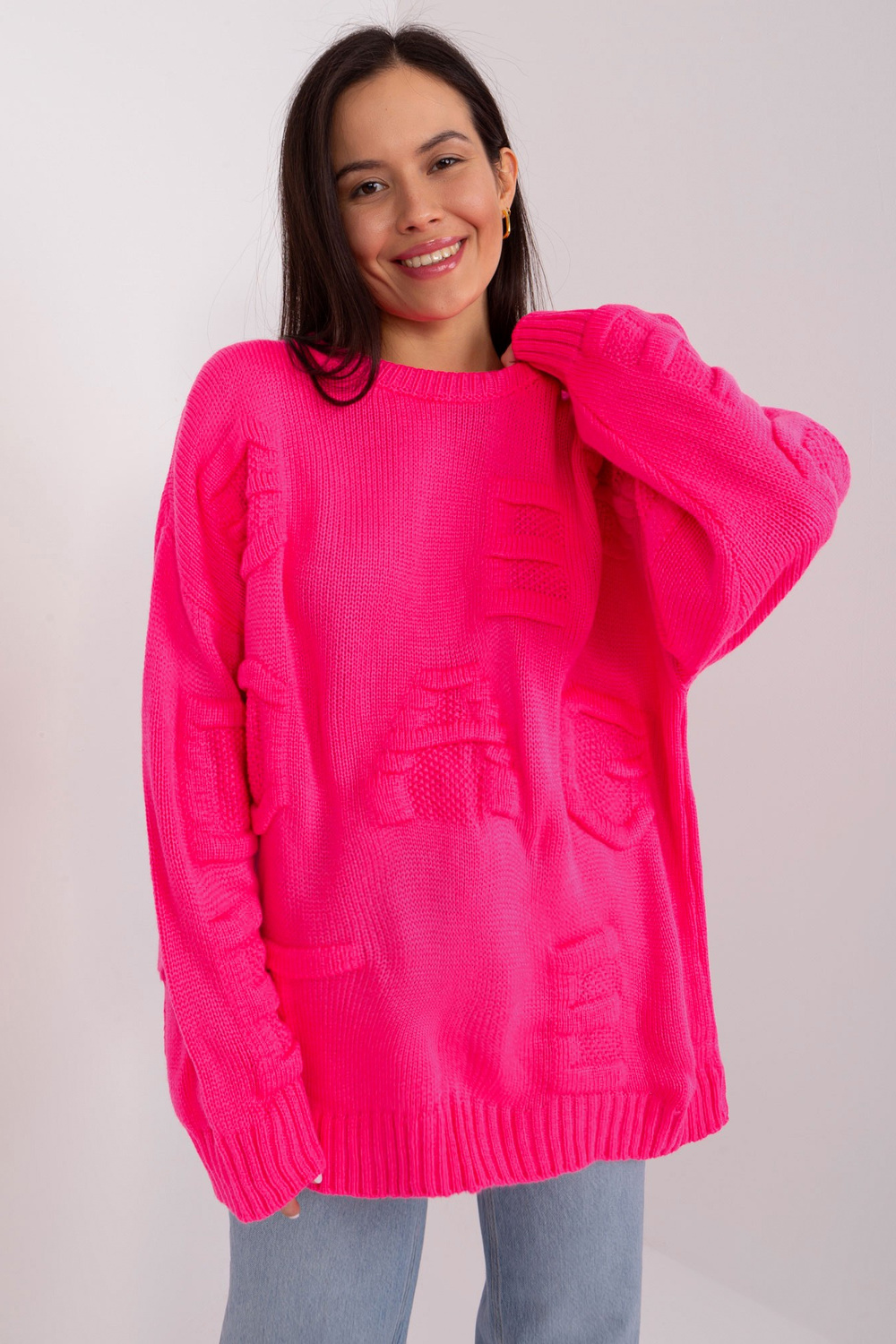 Fluo rozā liela izmēra džemperis ar apaļu kaklu.