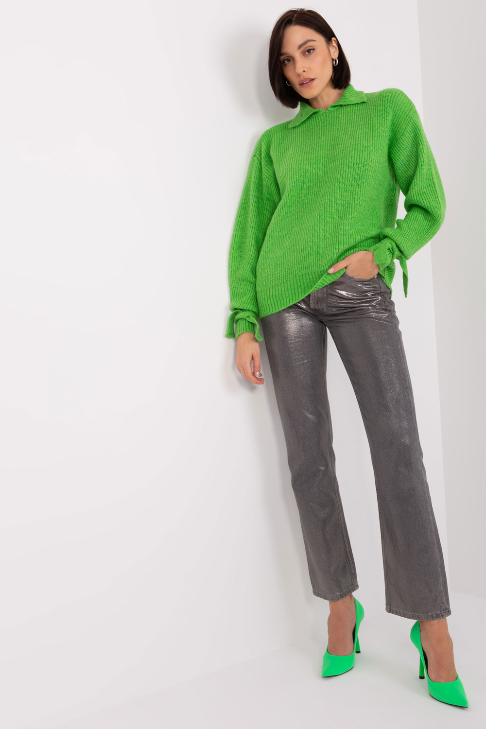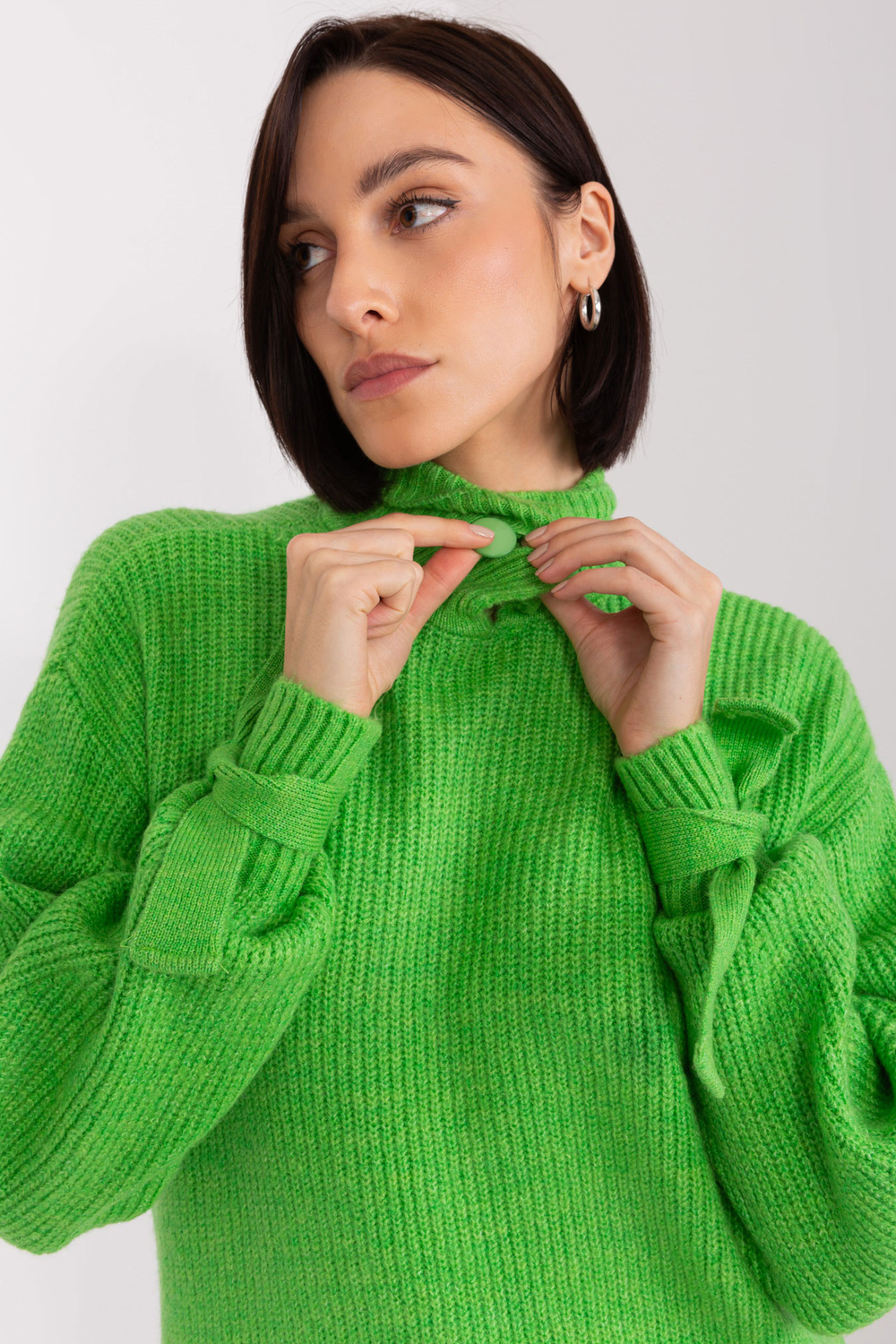 Gaiši zaļš džemperis ar bruņurupuču apkakli ar saitēm piedurknēs .