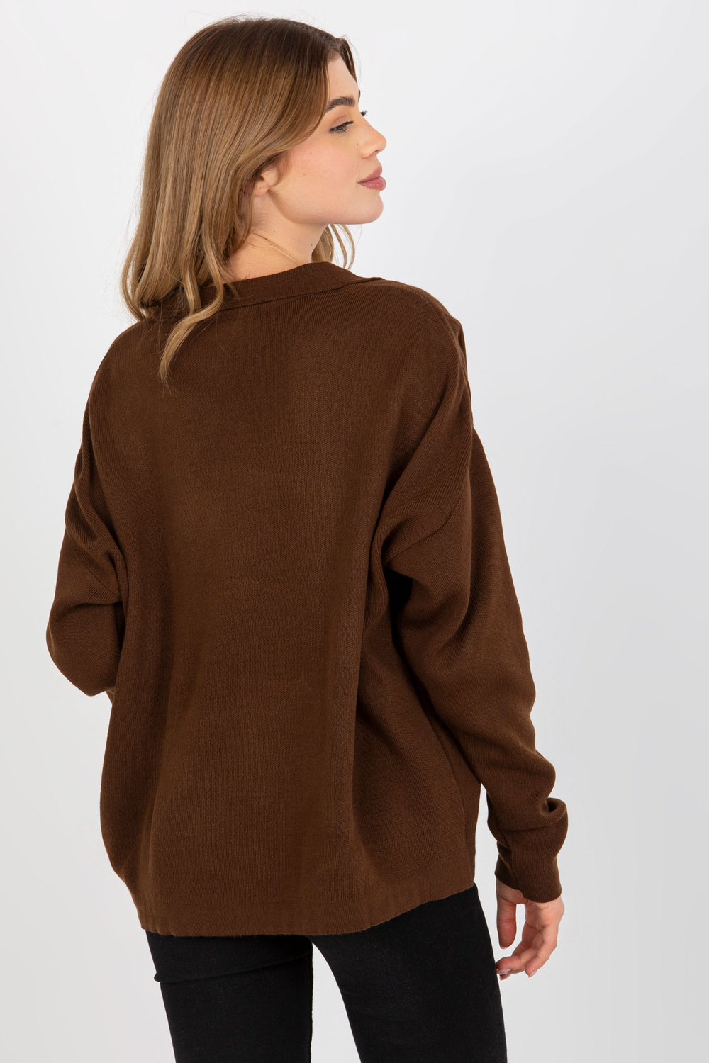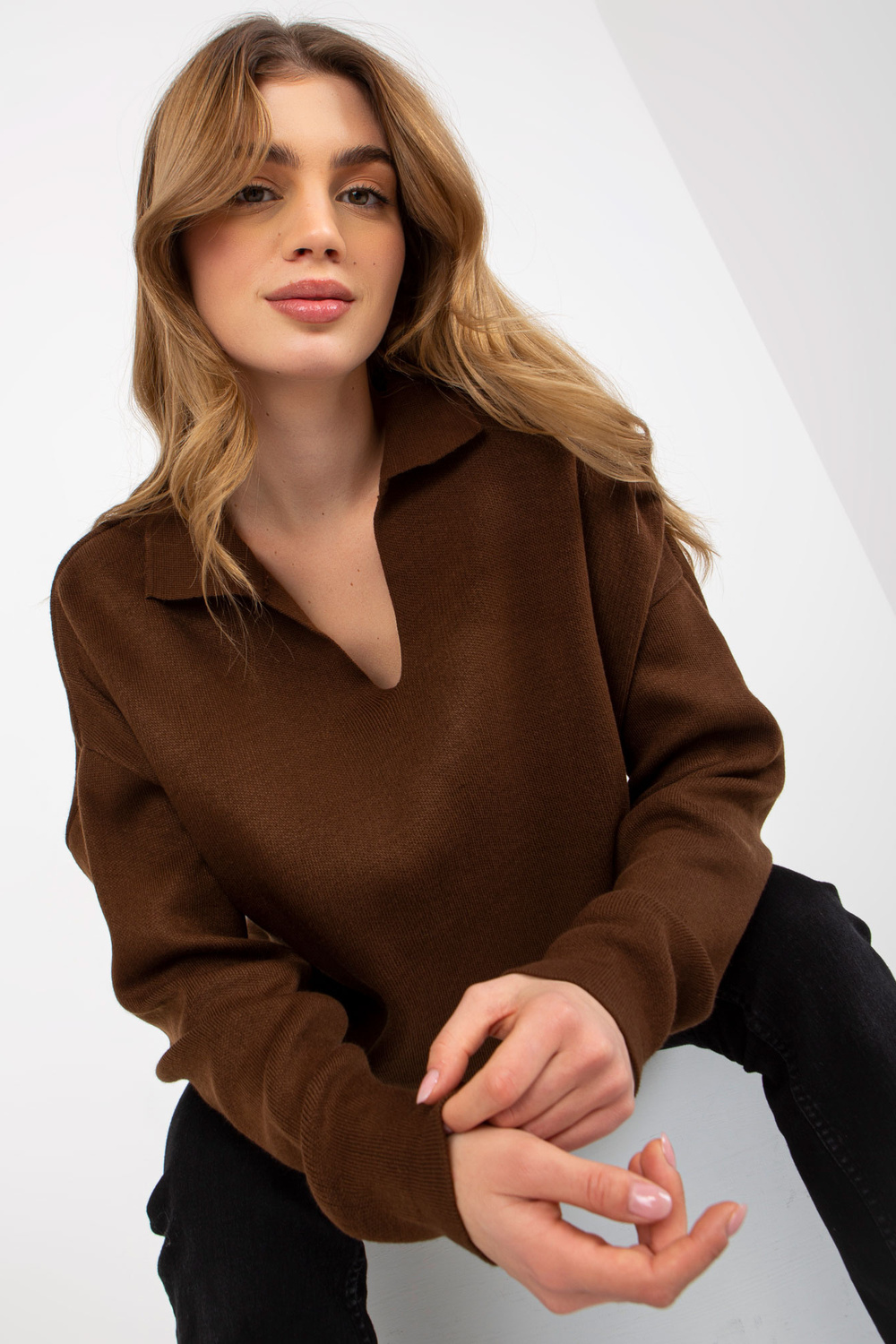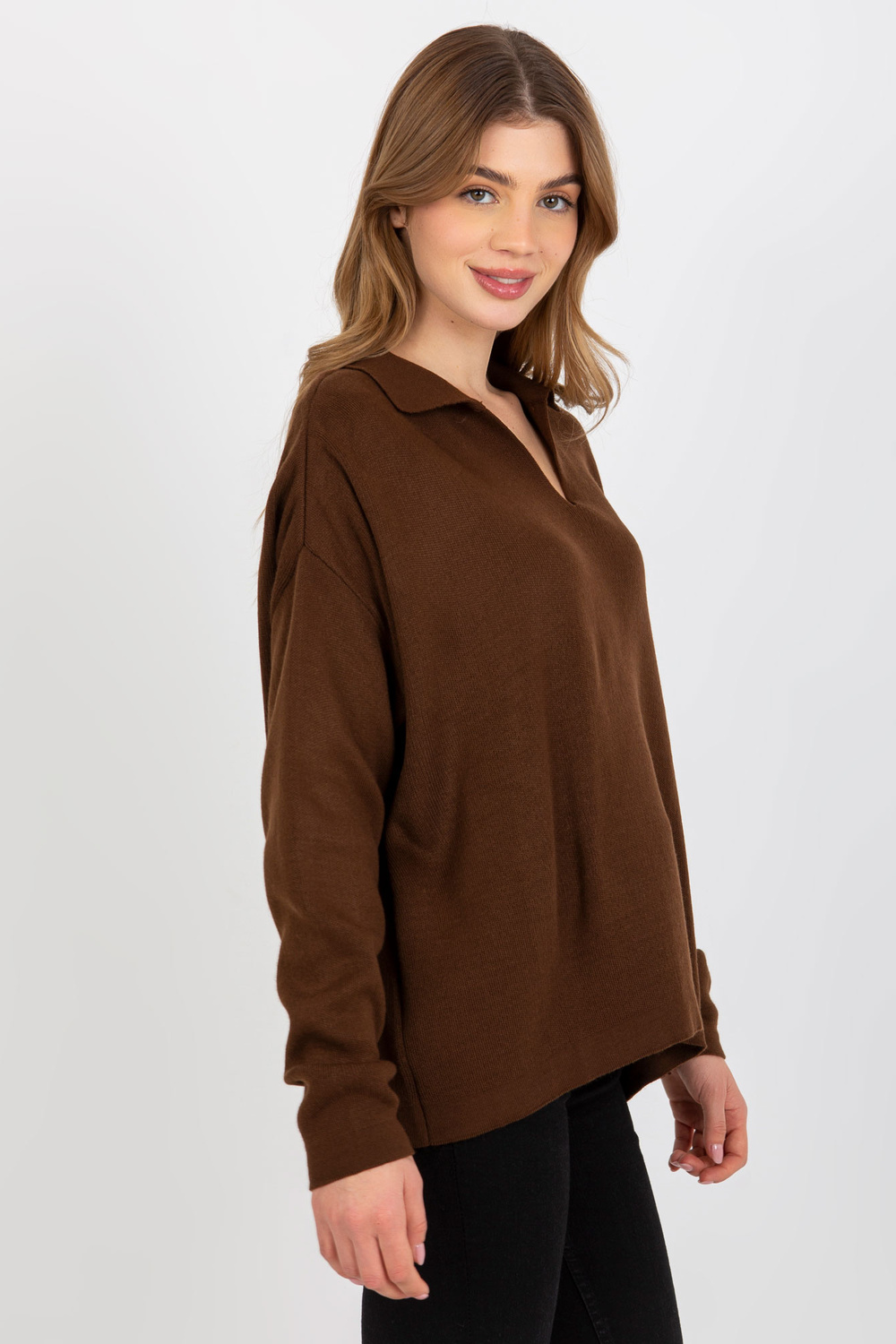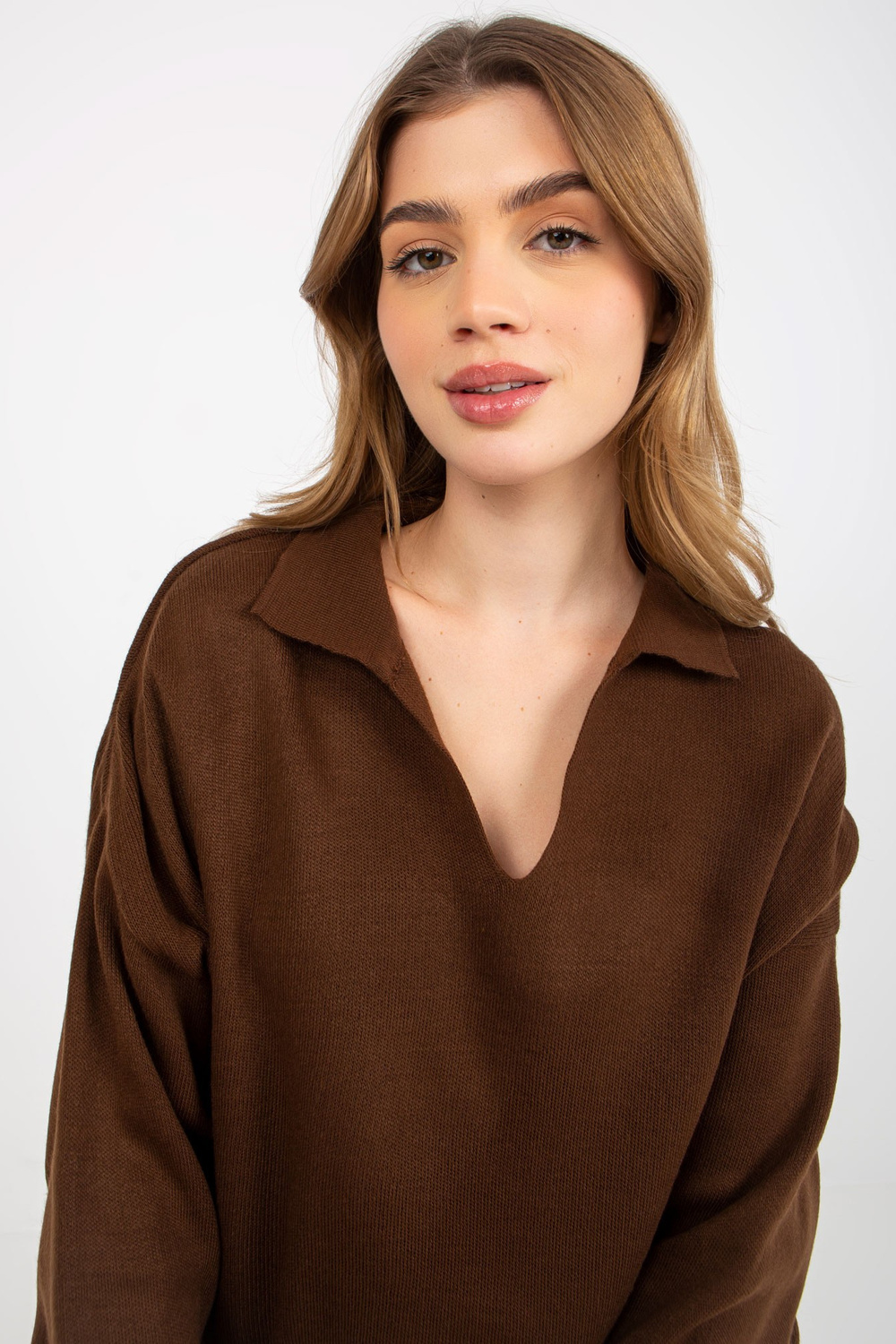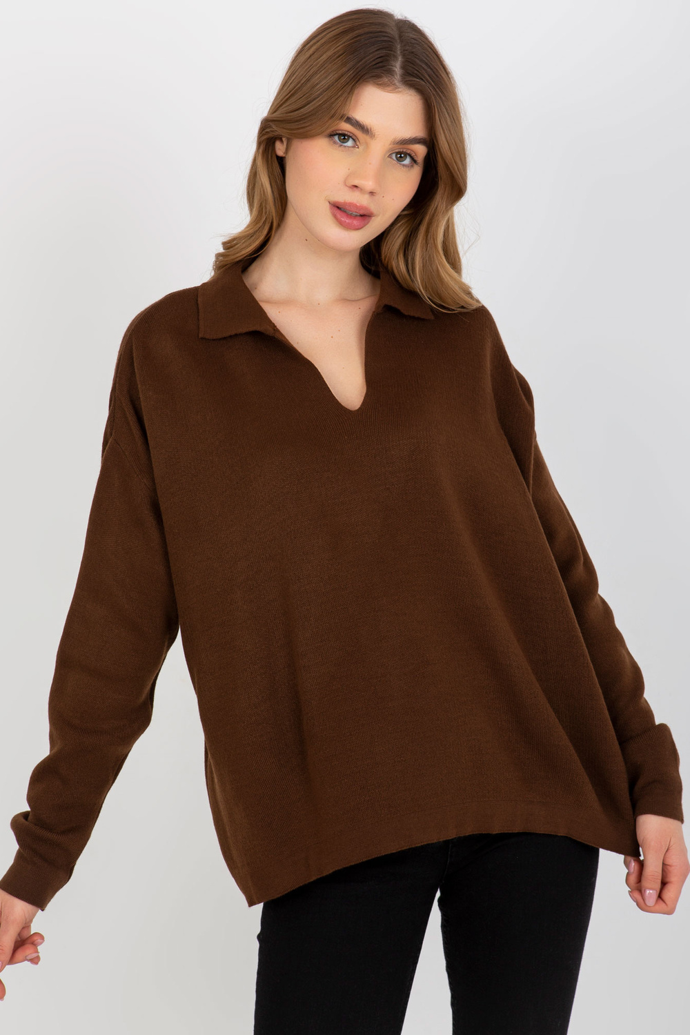 Tumši brūns gluds liela izmēra džemperis ar apkakli.