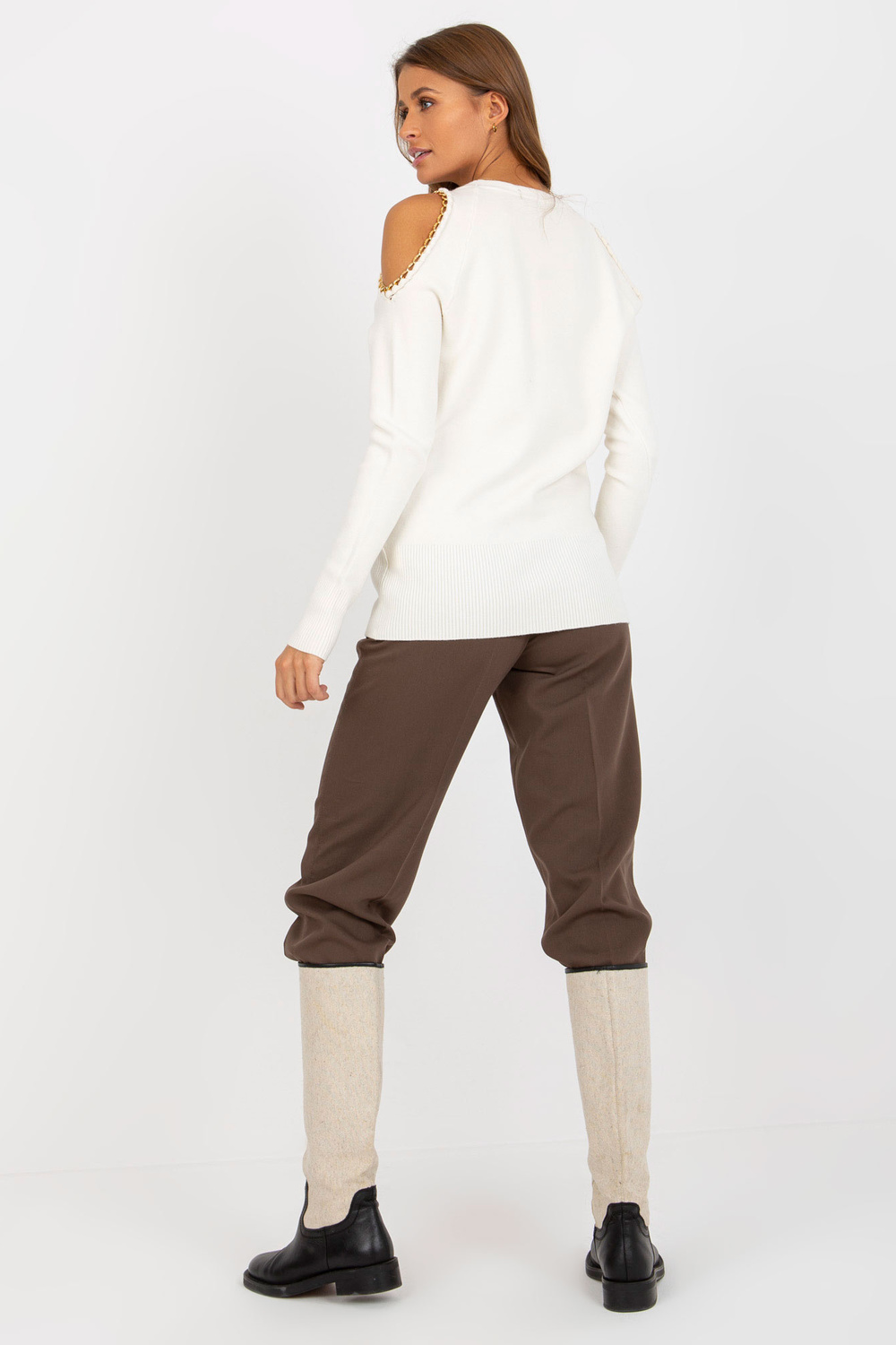 Ecrufarbener Pullover ar nackten Schulttern und Rundhalsausschnitt. Produkta kods: EM-SW-J51835.60P dominantes Muster: glatt Stils: lässig Anlass: lässig, für ein Date, für einen Spaziergang, zur Arbeit Das Model trägt eine Einheitsgröße. Maße des Models: H