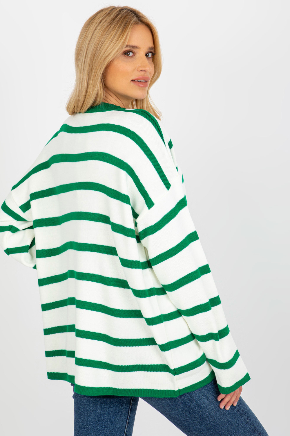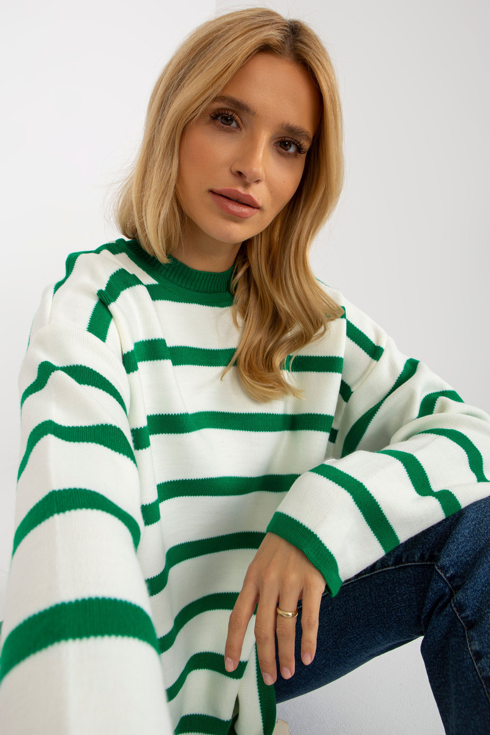 Tumši zaļš un ekru svītrains liela izmēra džemperis ar stāvapkakli RUE PARIS.