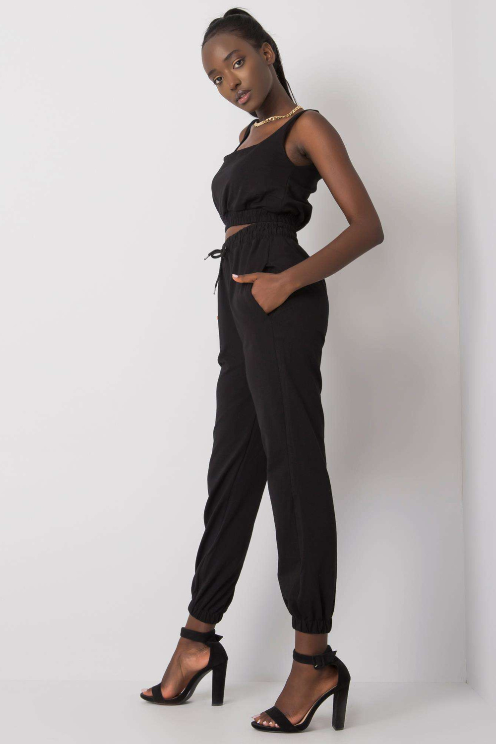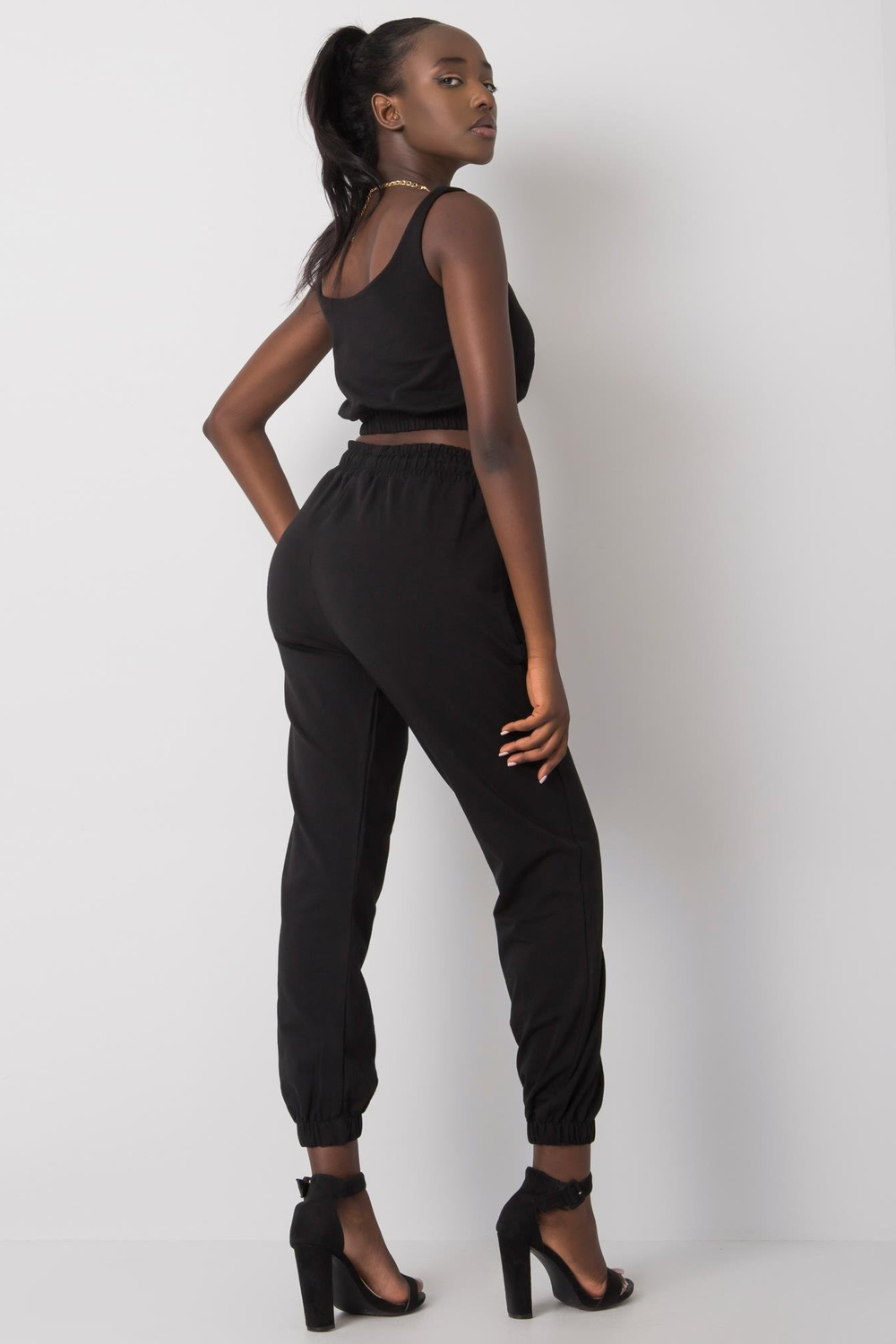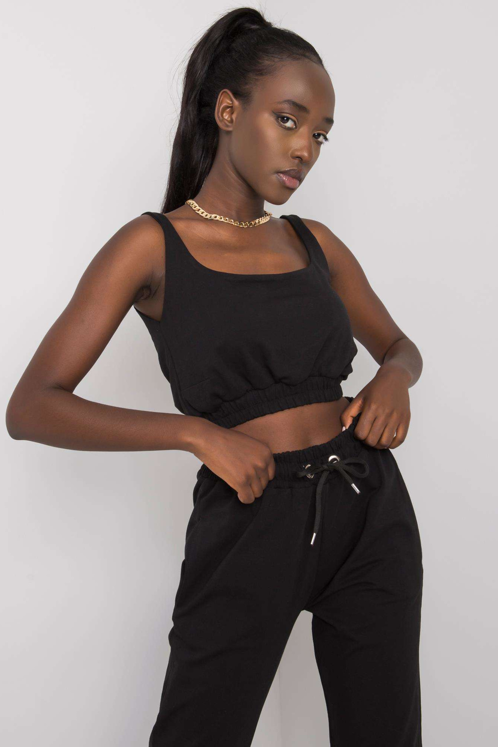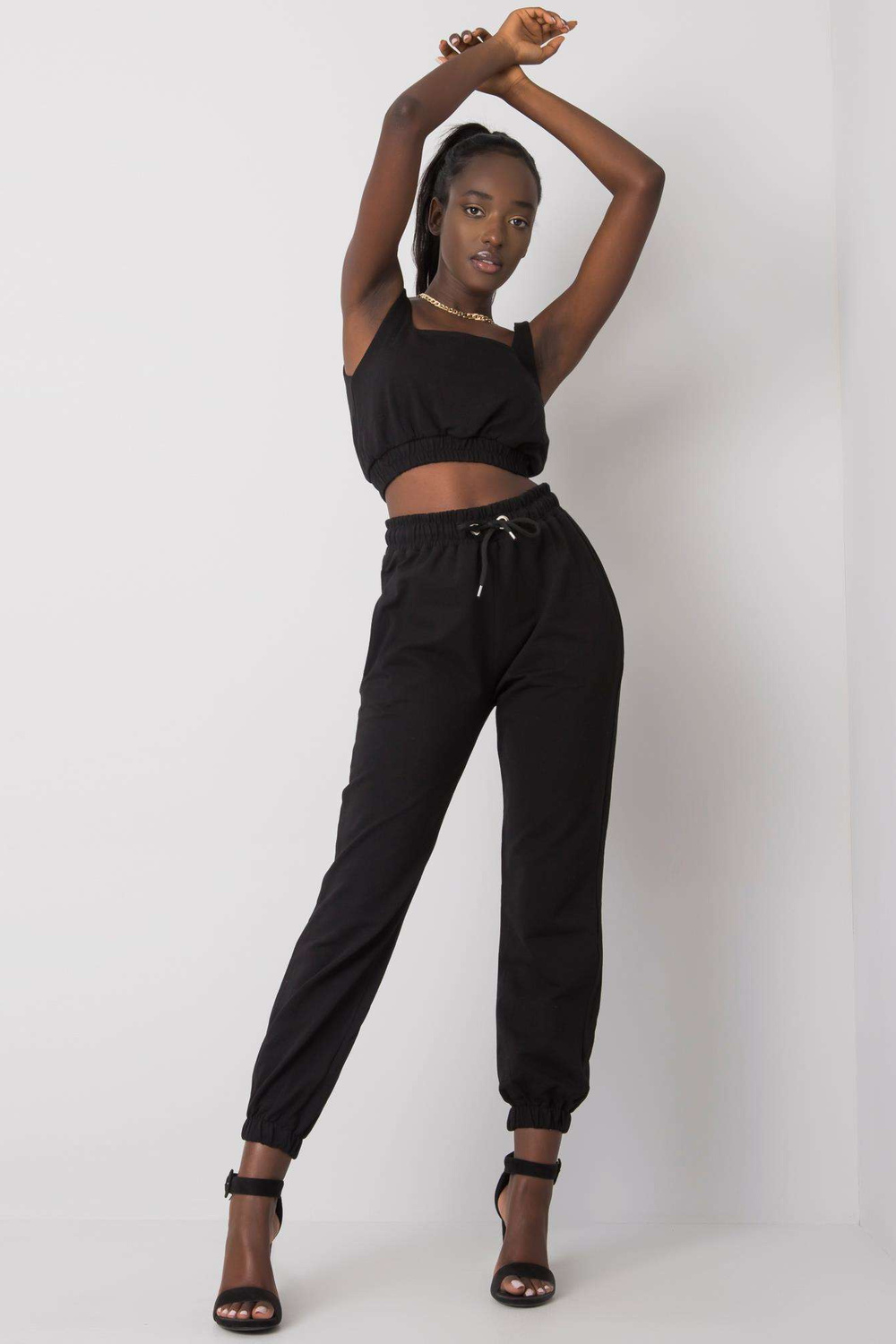 Melnā sporta tērpa komplekts Irini. komplektā ietilpst: tops, bikšu materiālssastāvs: 90% kokvilna, 10% elastāns mazgāšanas metode: veļas mašīna 30°C Modelis valkā S izmēru. Modeļa izmēri: augstums 170 cm, krūtis 84 cm, viduklis 60 cm, gurni 93 cm. Izmēri