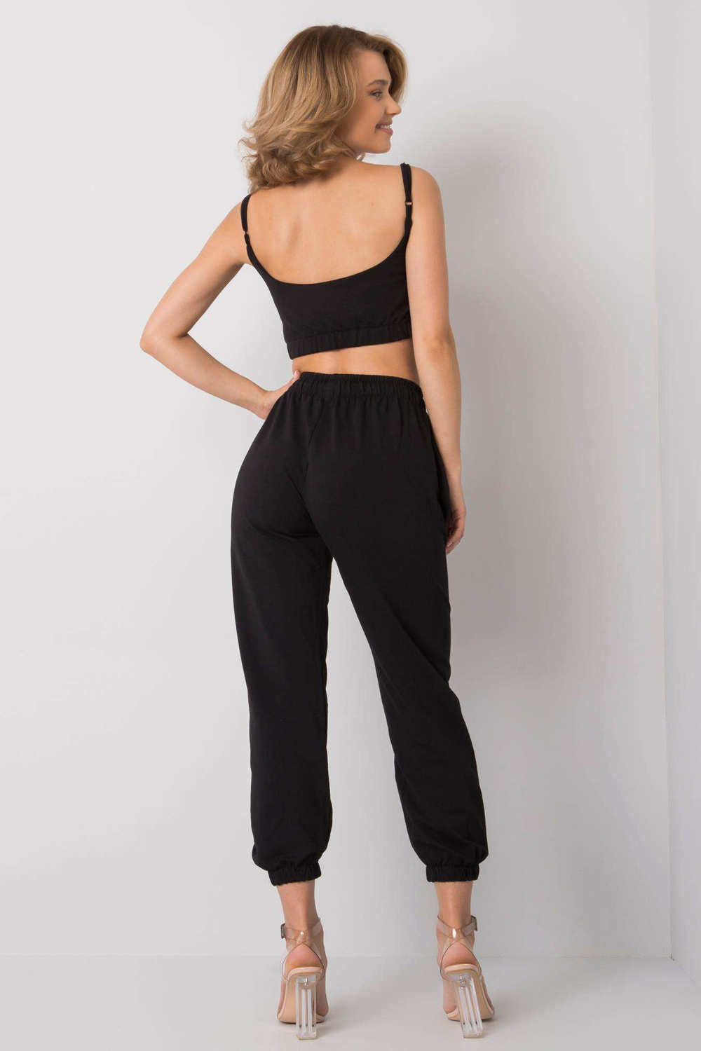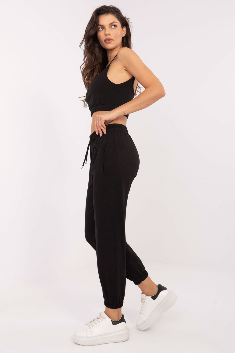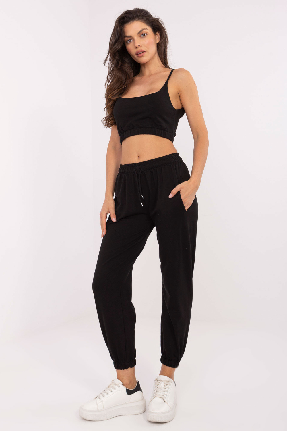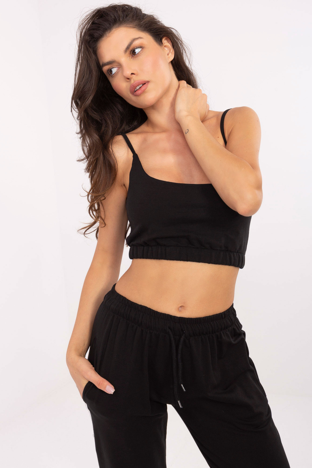 Melns divdaļīgs komplekts Mado. aksesuāri: regulējamas siksnas komplektā ietilpst: bikses, augšējais materiālssastāvs: 72% kokvilna, 22% poliesters, 6% elastāns mazgāšanas metode: veļas mašīna 30°C Modelis valkā S izmēru. Modeļa izmēri: augstums 170 cm, krūšu kurvis 89