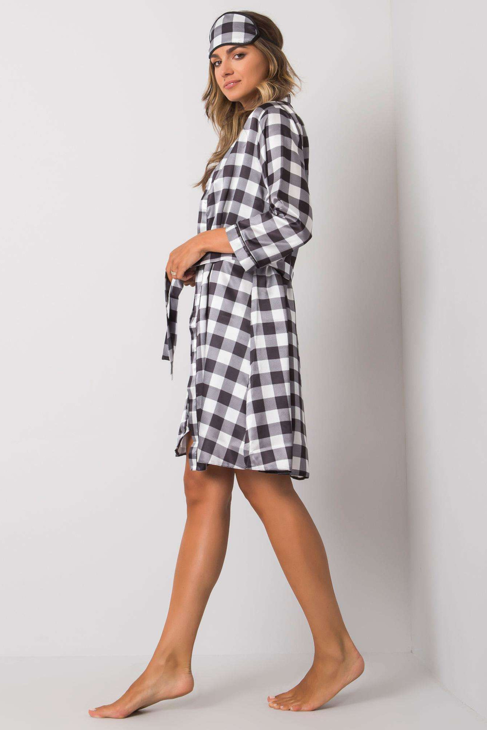 Balts un melns trīsdaļīgs rūtains nakts komplekts. komplektā ietilpst: naktskrekls, peldmētelis, aizsietas acis Materiāls: 100% poliestera mazgāšanas metode: veļas mašīna 30°C Modelis valkā S izmēru. Modeļa izmēri: augstums 175 cm, krūtis 85 cm, viduklis 65 c