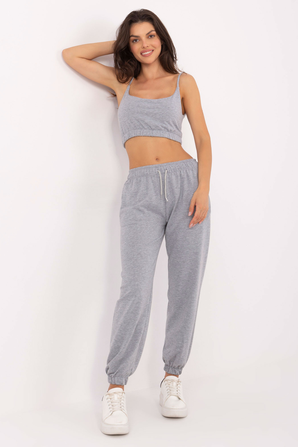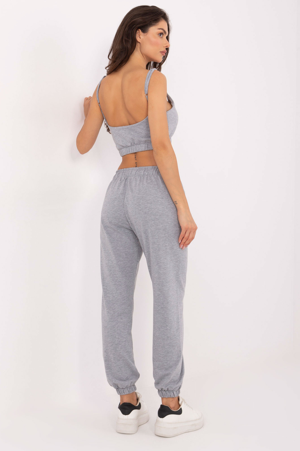 Pelēks Divdaļīgs komplekts Mado. aksesuāri: regulējamas siksnas komplektā ietilpst: bikses, augšējais materiālssastāvs: 72% kokvilna, 22% poliesters, 6% elastāns mazgāšanas metode: veļas mašīna 30°C Modelis valkā S izmēru. Modeļa izmēri: augstums 170 cm, krūšu kurvis 89
