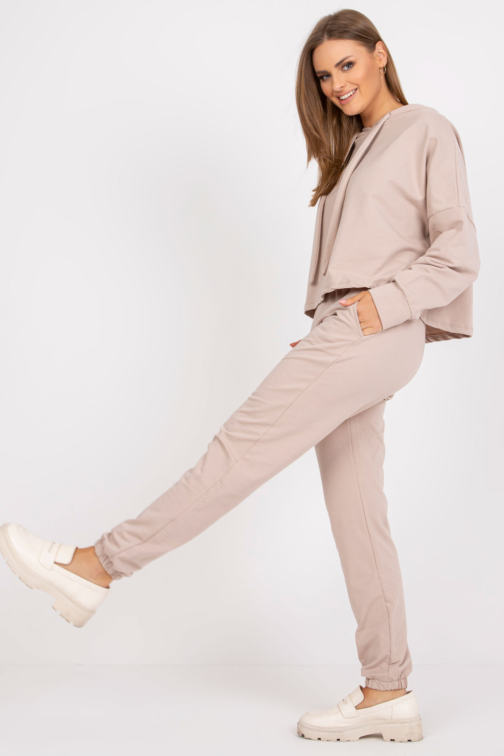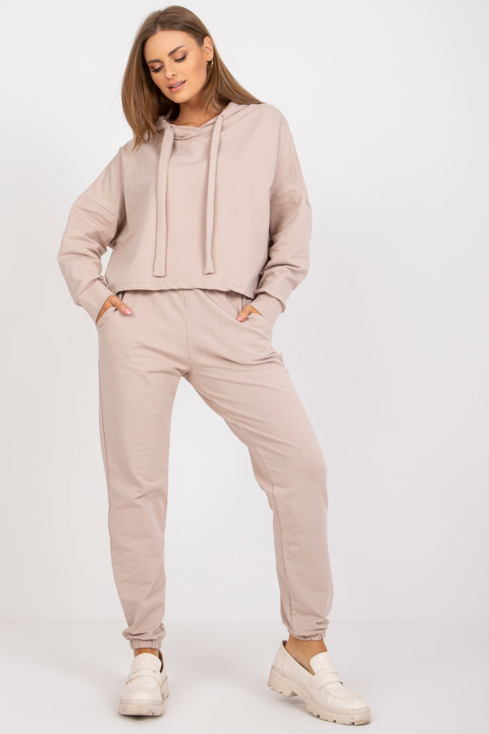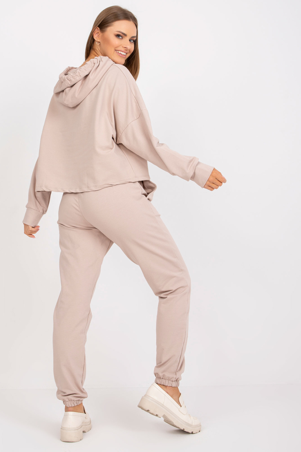 Bezs divdaļīgs sporta tērpa komplekts ar kapuci.