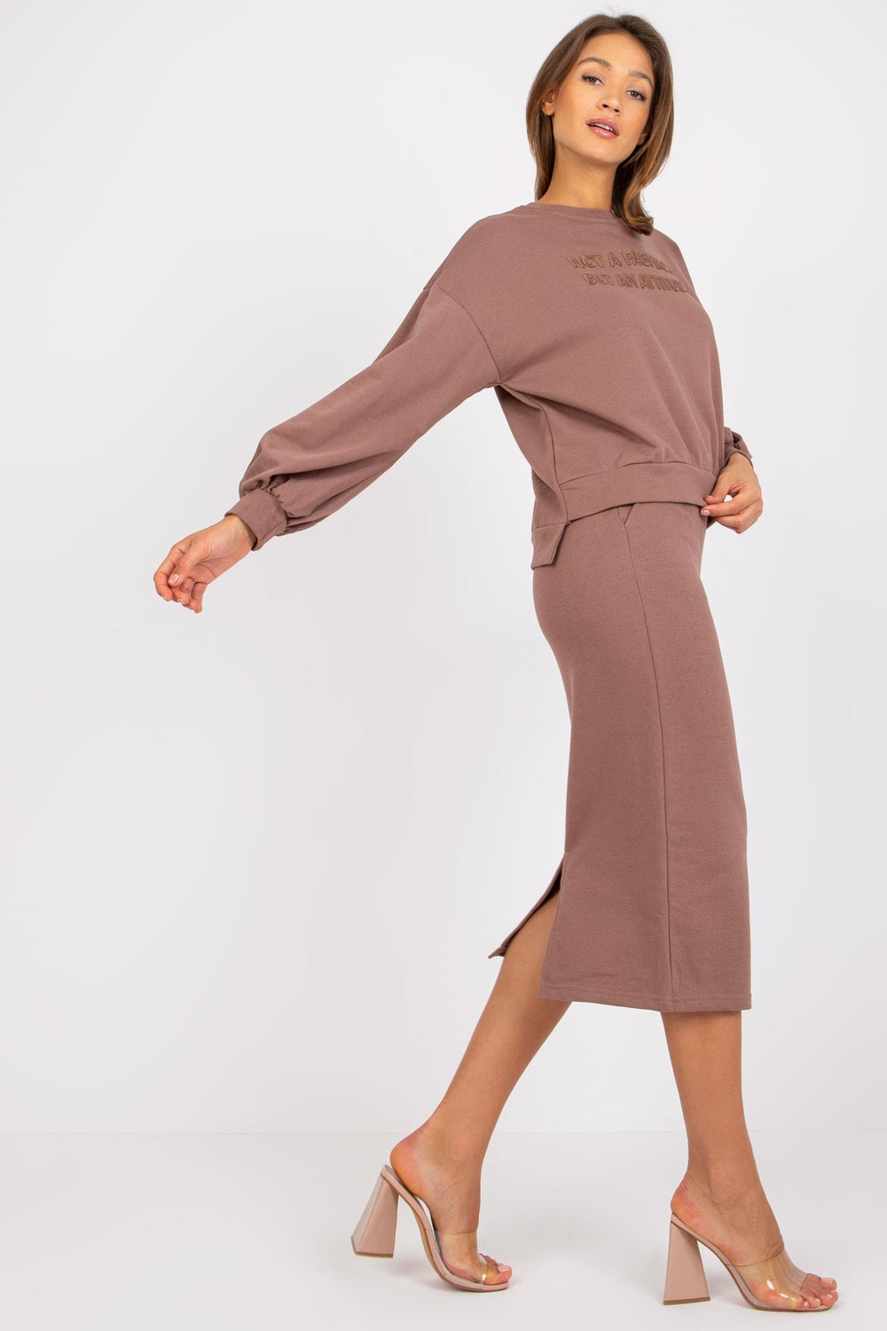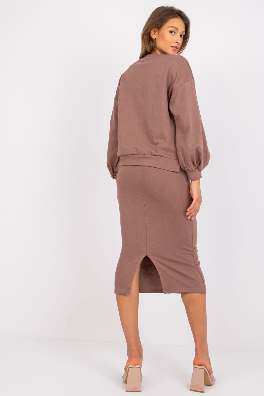 Brūna sporta tērpa komplekts ar Louis midi svārkiem .