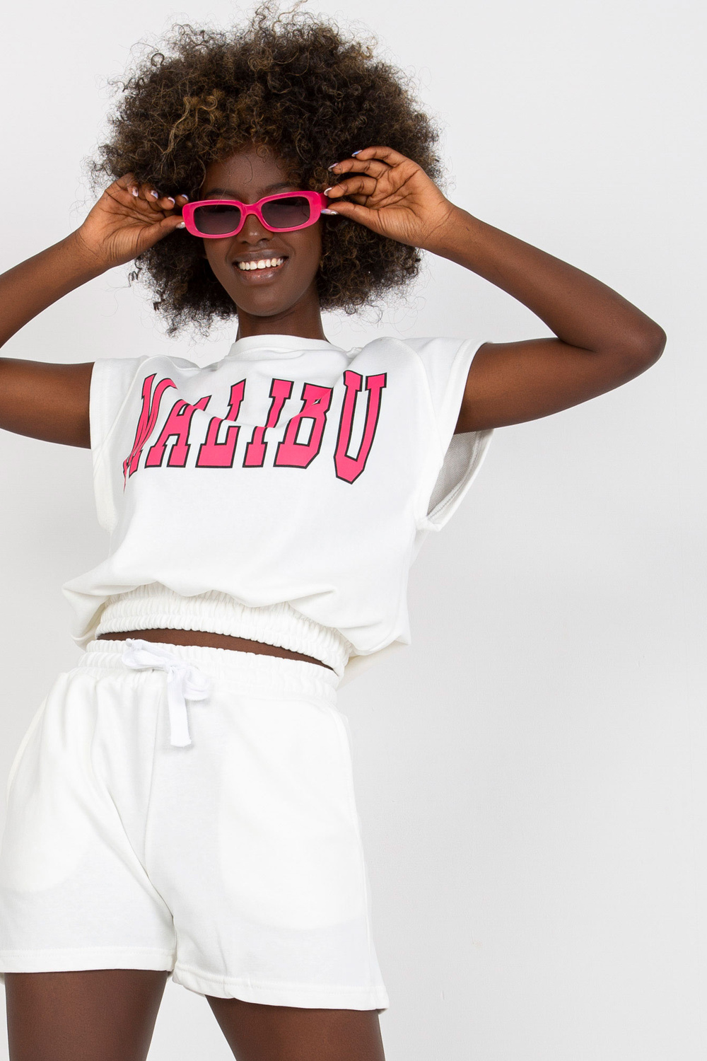 Komplekta izmēri vienā izmērā mērot plakanu: blūzes platums zem padusēm - 48 cm, blūzes garums - 52 cm, šortu platums jostasvietā - 34 cm, stāvokļa augstums - 30 cm, šortu garums - 38 cm.