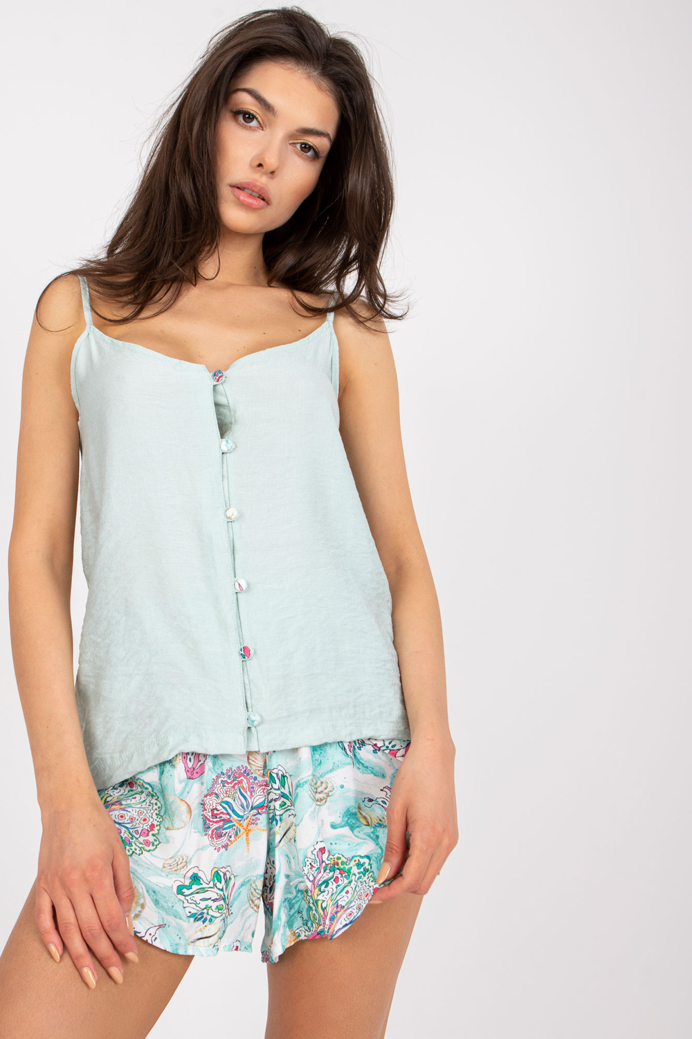 Tirkīza divdaļīga pidžama ar šortiem . piederumi: regulējamas siksnas komplektā ietilpst: augšdaļa, šortu materiālssastāvs: augšdaļa - 90% viskoze, 10% poliamīds, šorti - 69% organiskā viskoze, 31% viskoze mazgāšanas metode: veļas mašīna 30°C Produkta kods: BR-KMPL-90