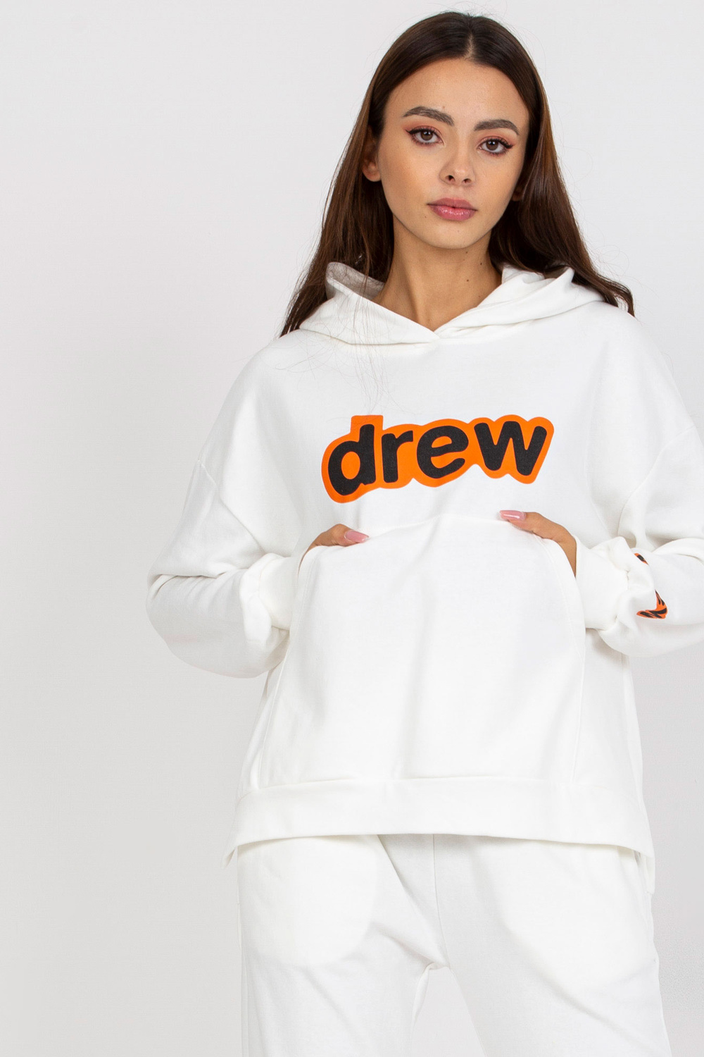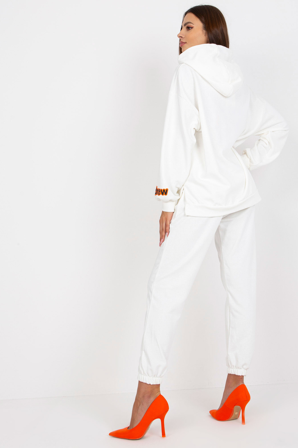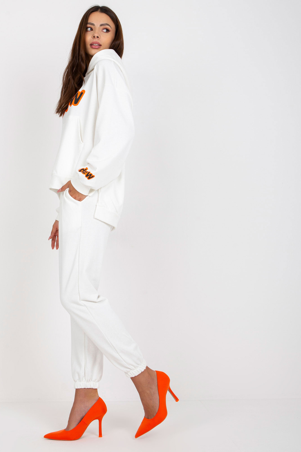 Baltā džempera komplekts ar biksēm ar augstu jostasvietu.