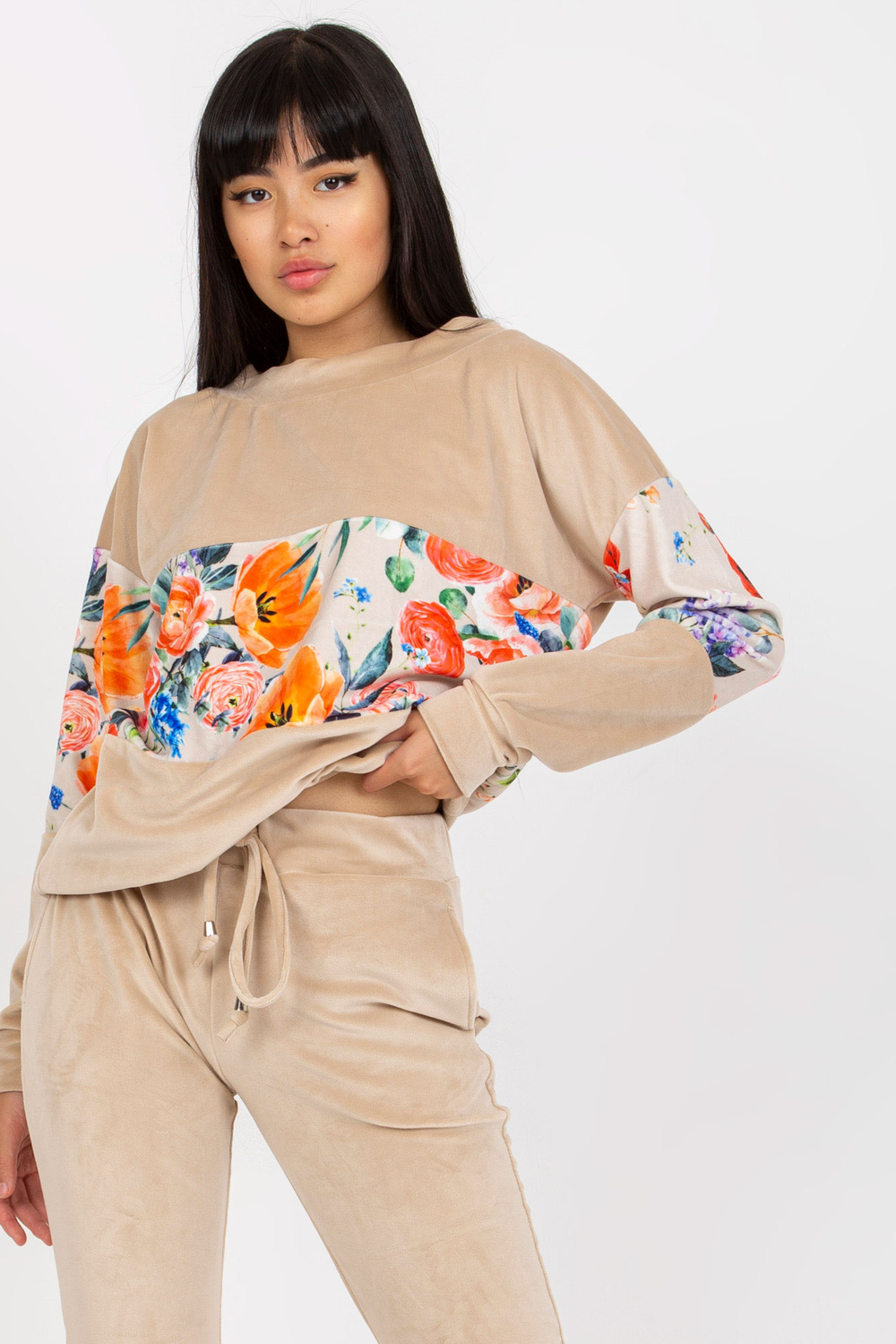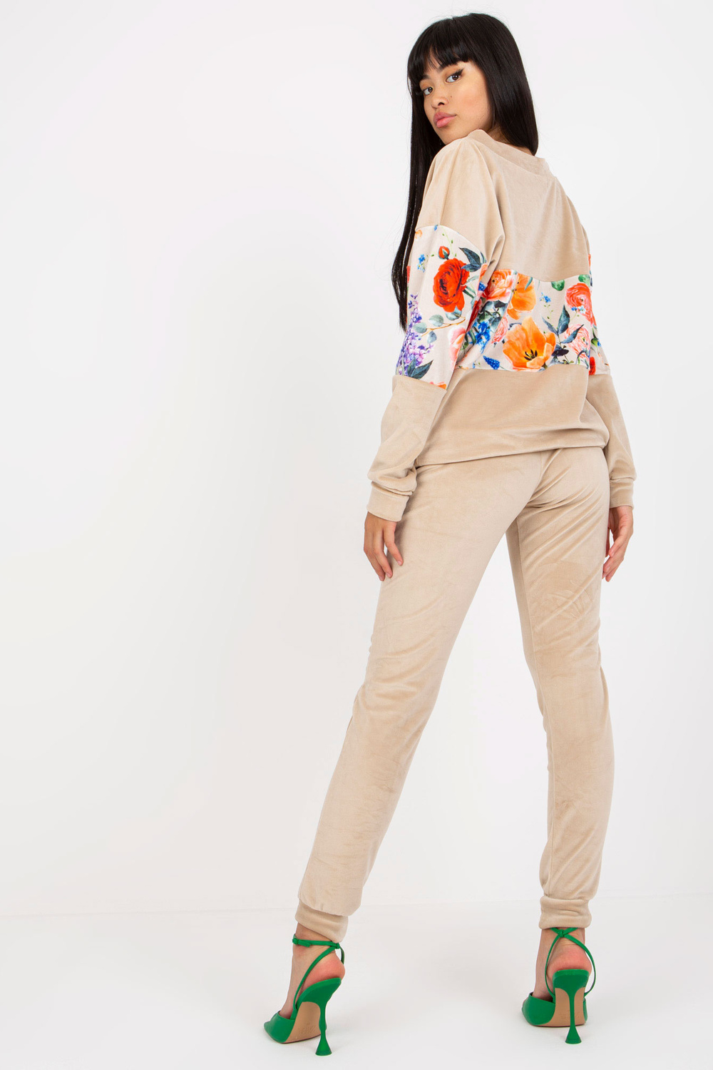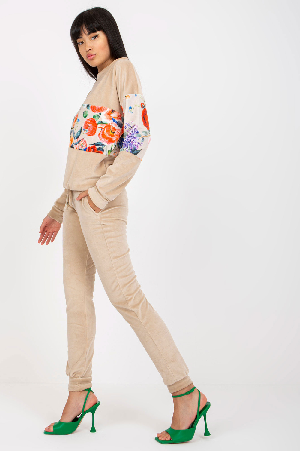 Bēšs divdaļīgs velūra komplekts ar RUE PARIS apdruku.