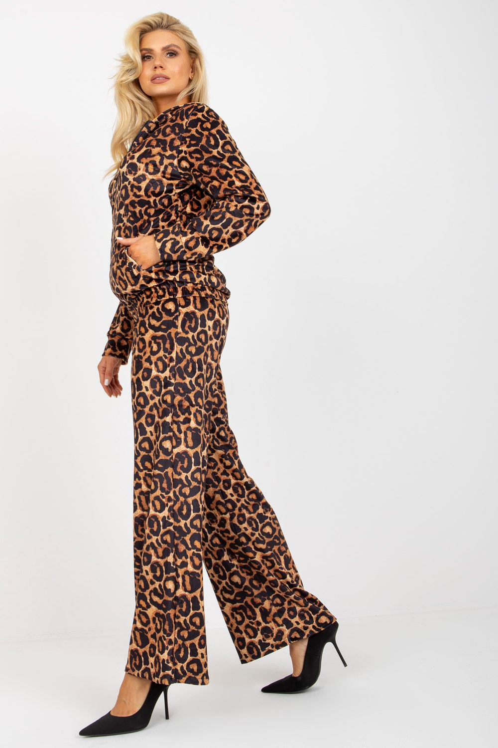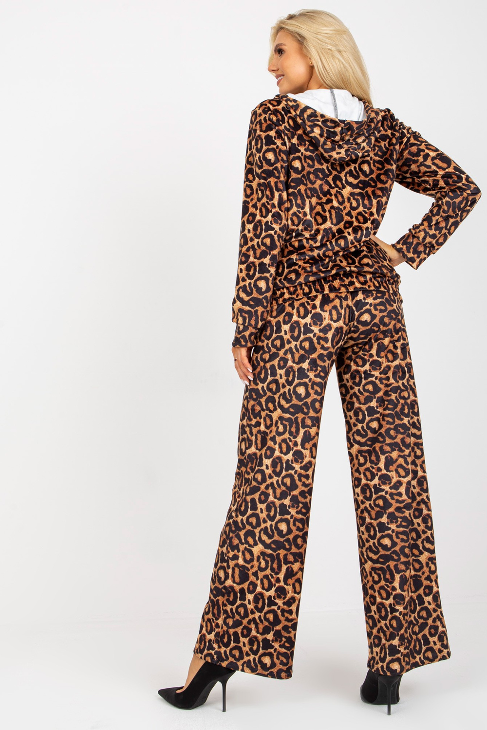 Bēšs un melns divdaļīgs leoparda krāsas velūra komplekts.
