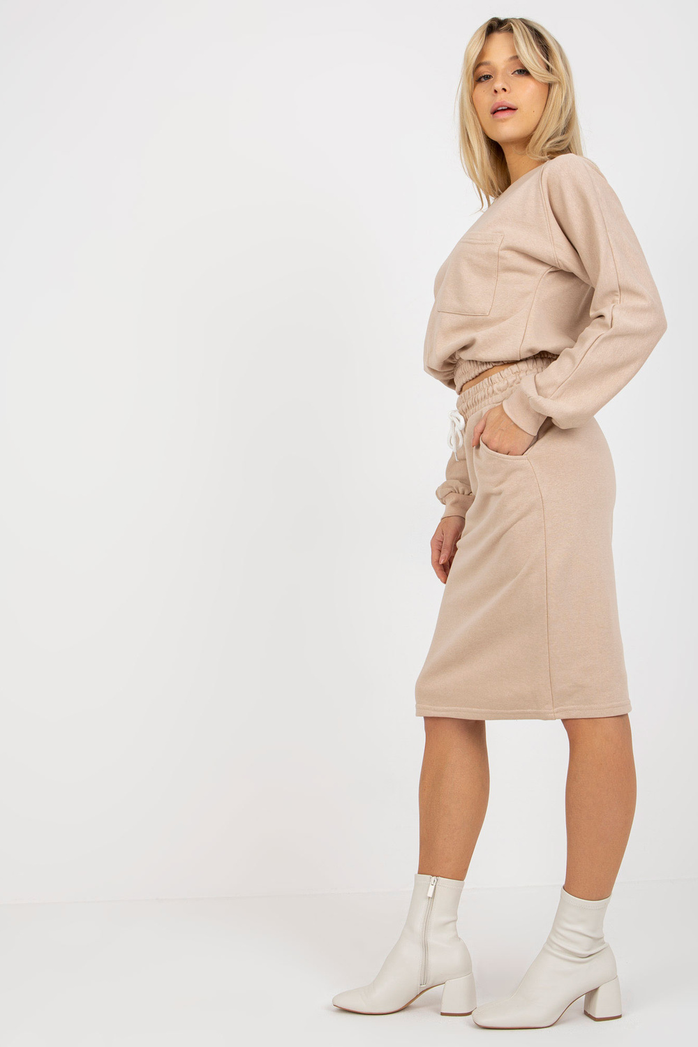 Bēšs ikdienas pamata komplekts ar svārkiem.