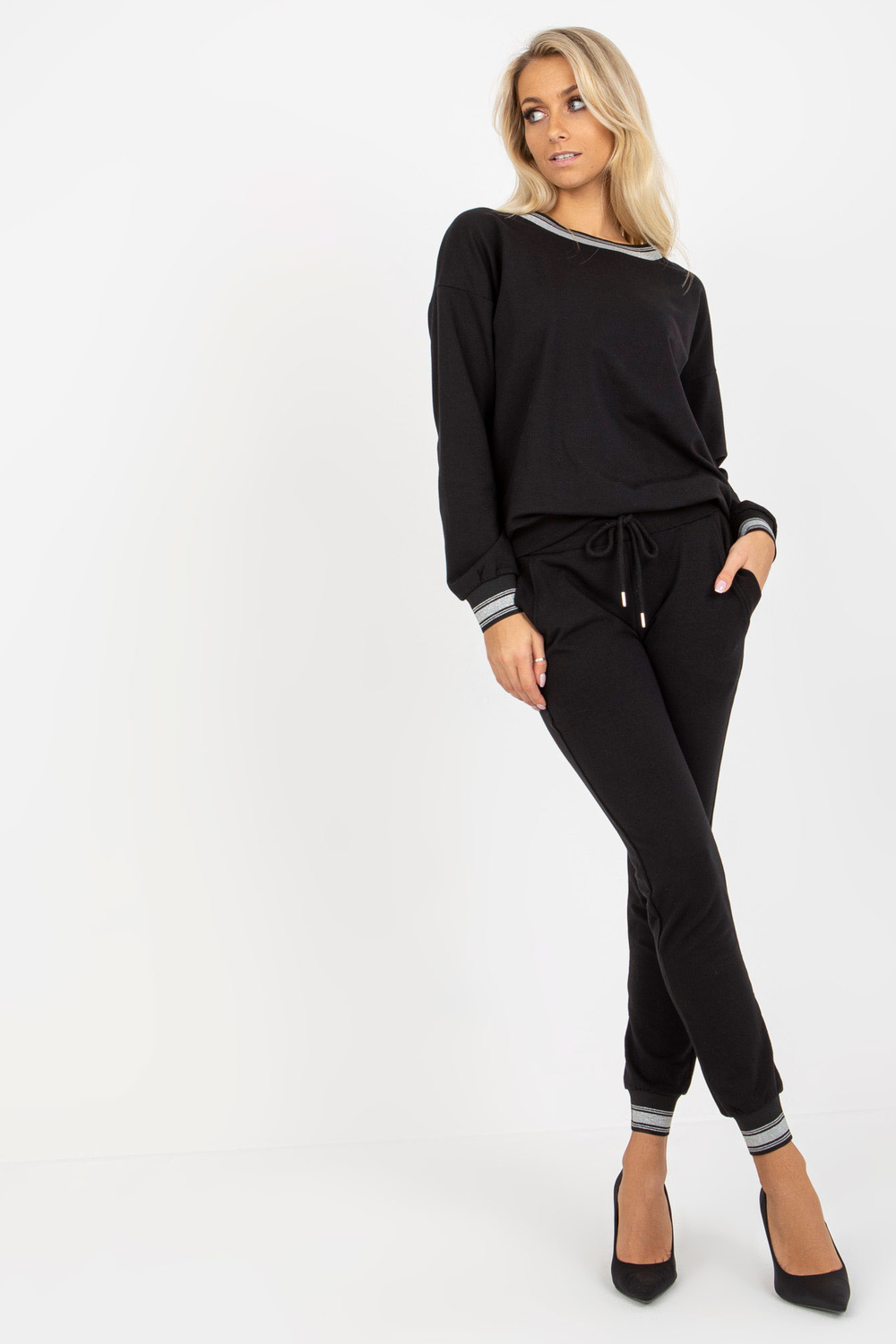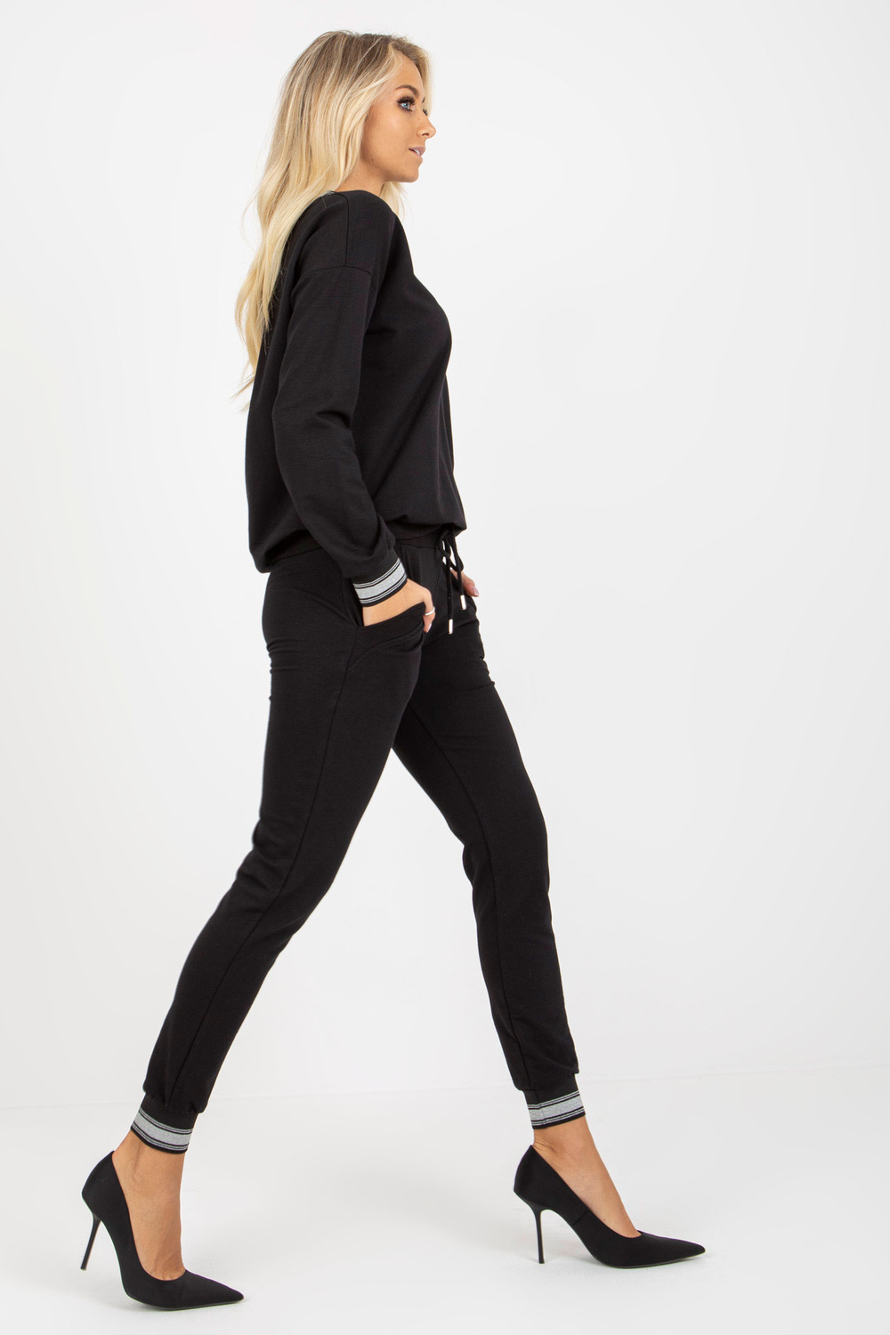Schwarzes zweiteiliges skriešanas komplekts ar šļūteni.