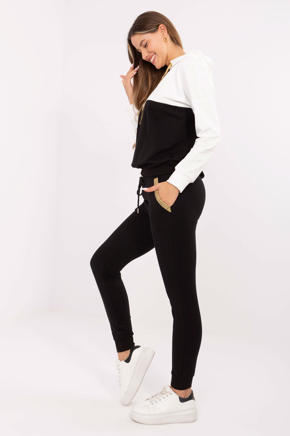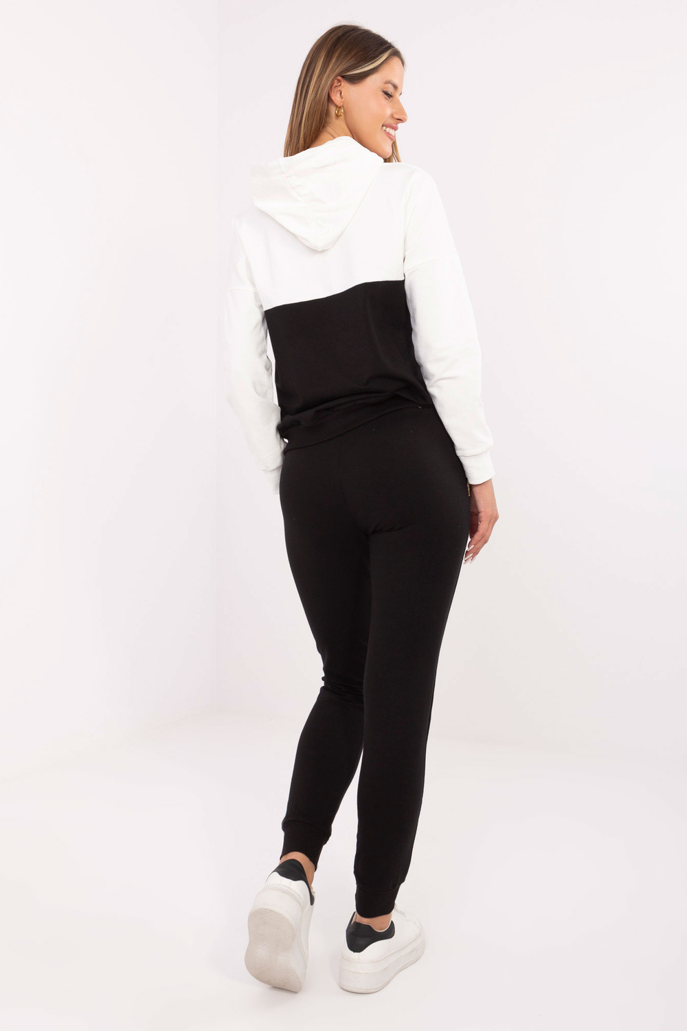 Ekruli melns sieviešu sporta kreklu komplekts ar kapuci.