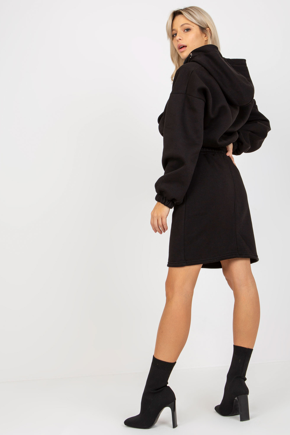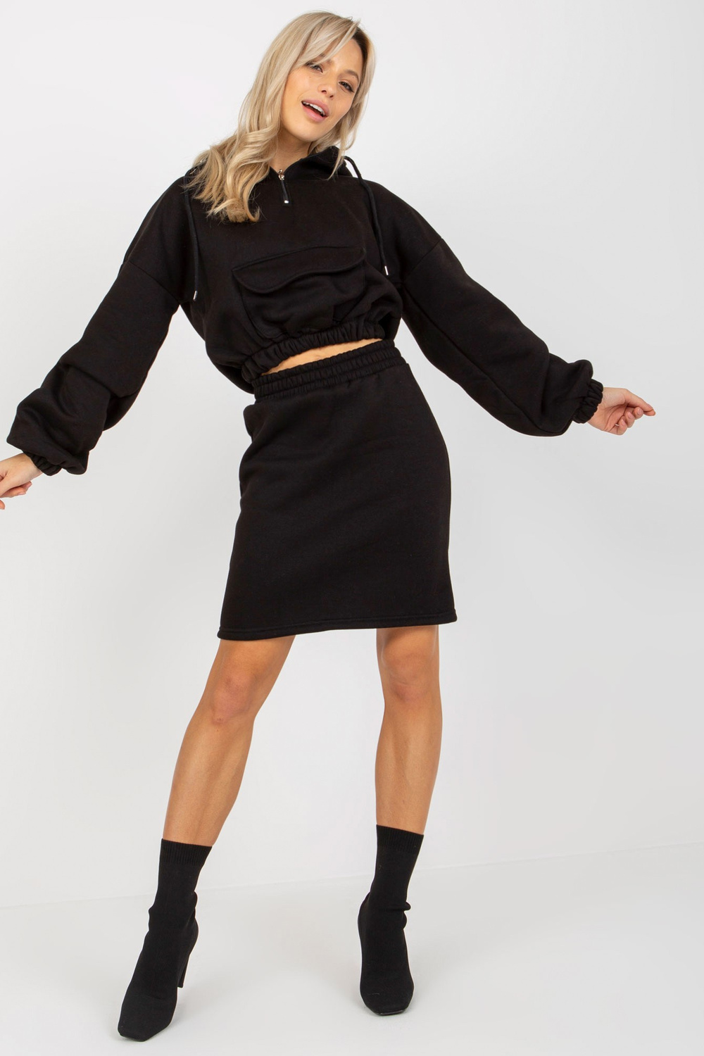 Komplekta izmēri viena izmēra izmērā, mērot plakani: platums zem padusēm - 58 cm, sporta krekla garums - 47 cm, piedurknes garums - 58 cm, vidukļa platums - 36 cm, svārku garums - 48 cm.