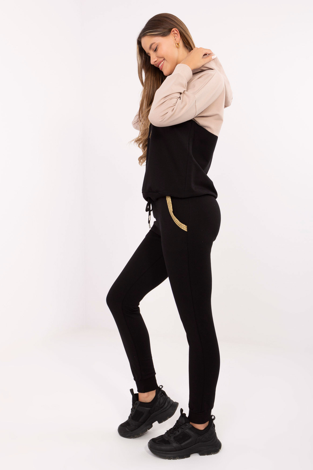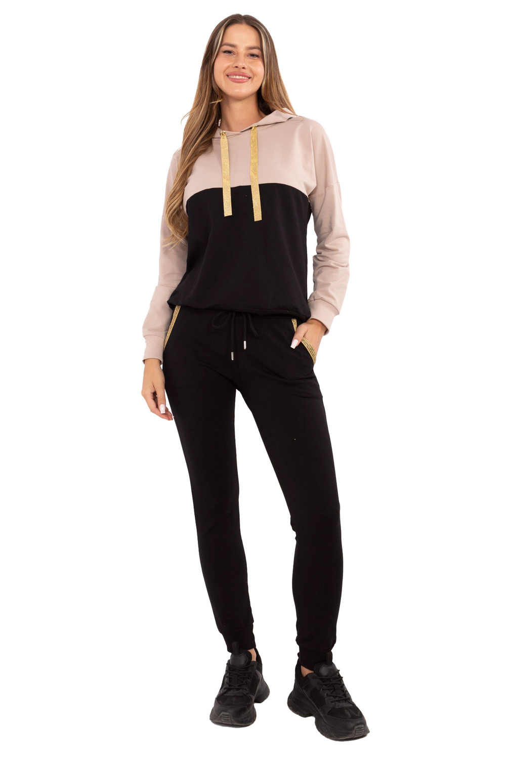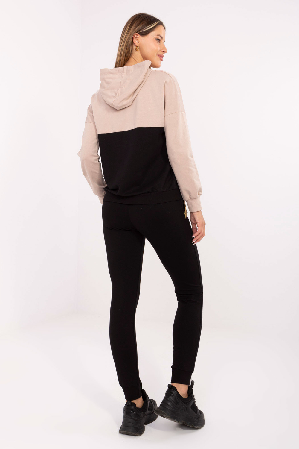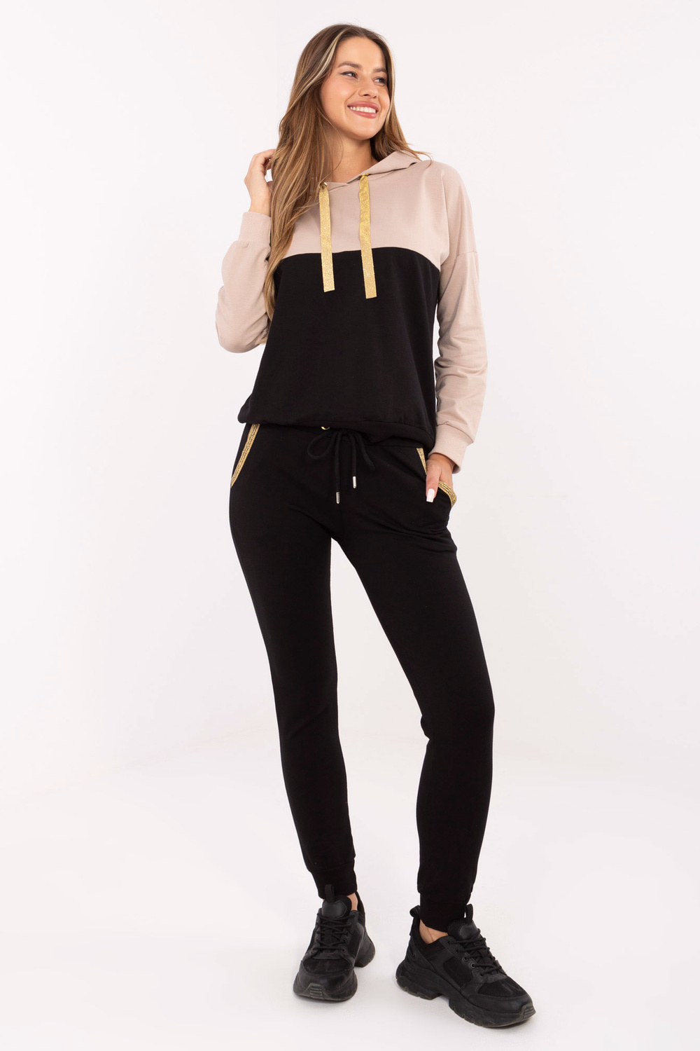 Bēšs un melns sieviešu sporta kreklu komplekts ar kapuci.