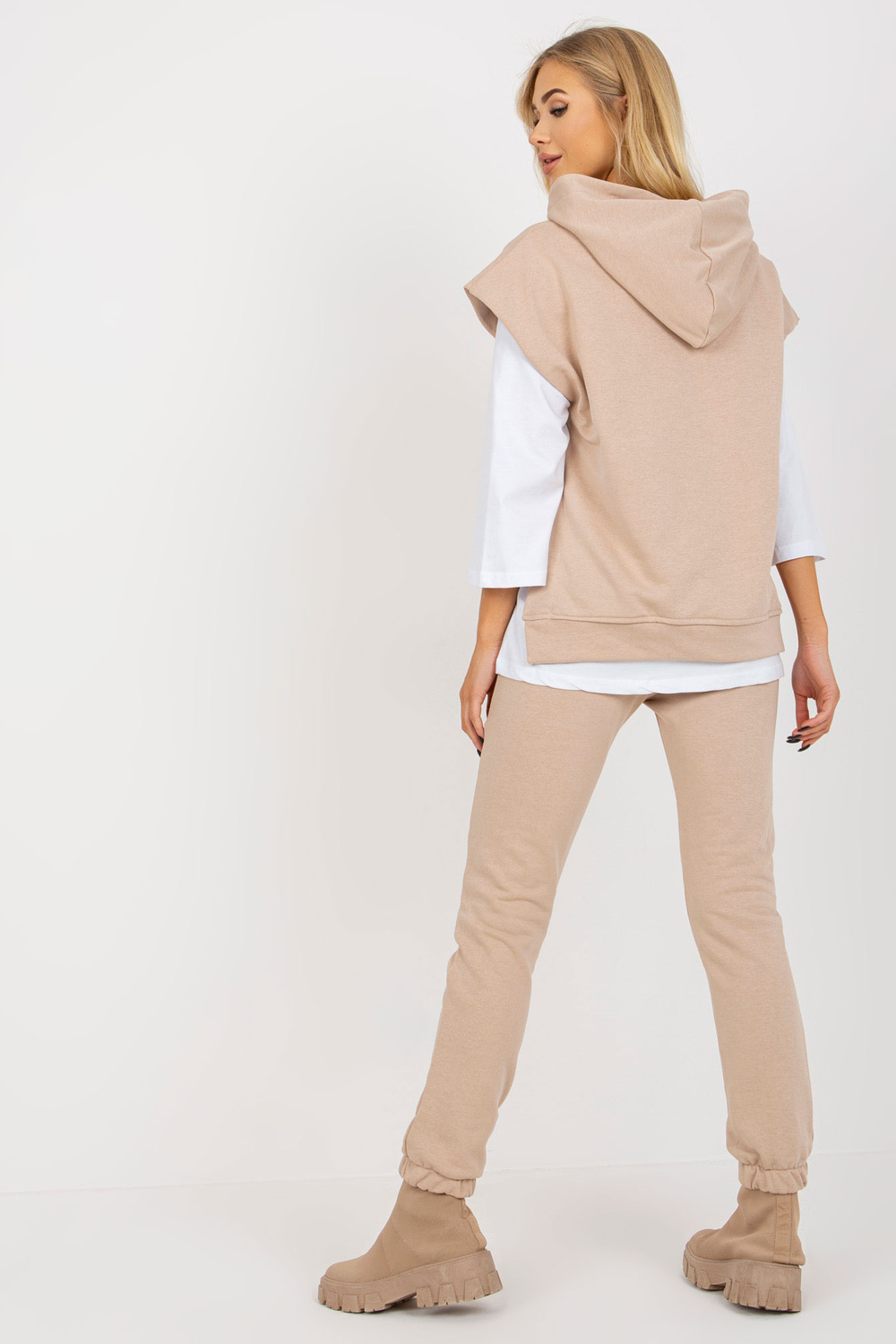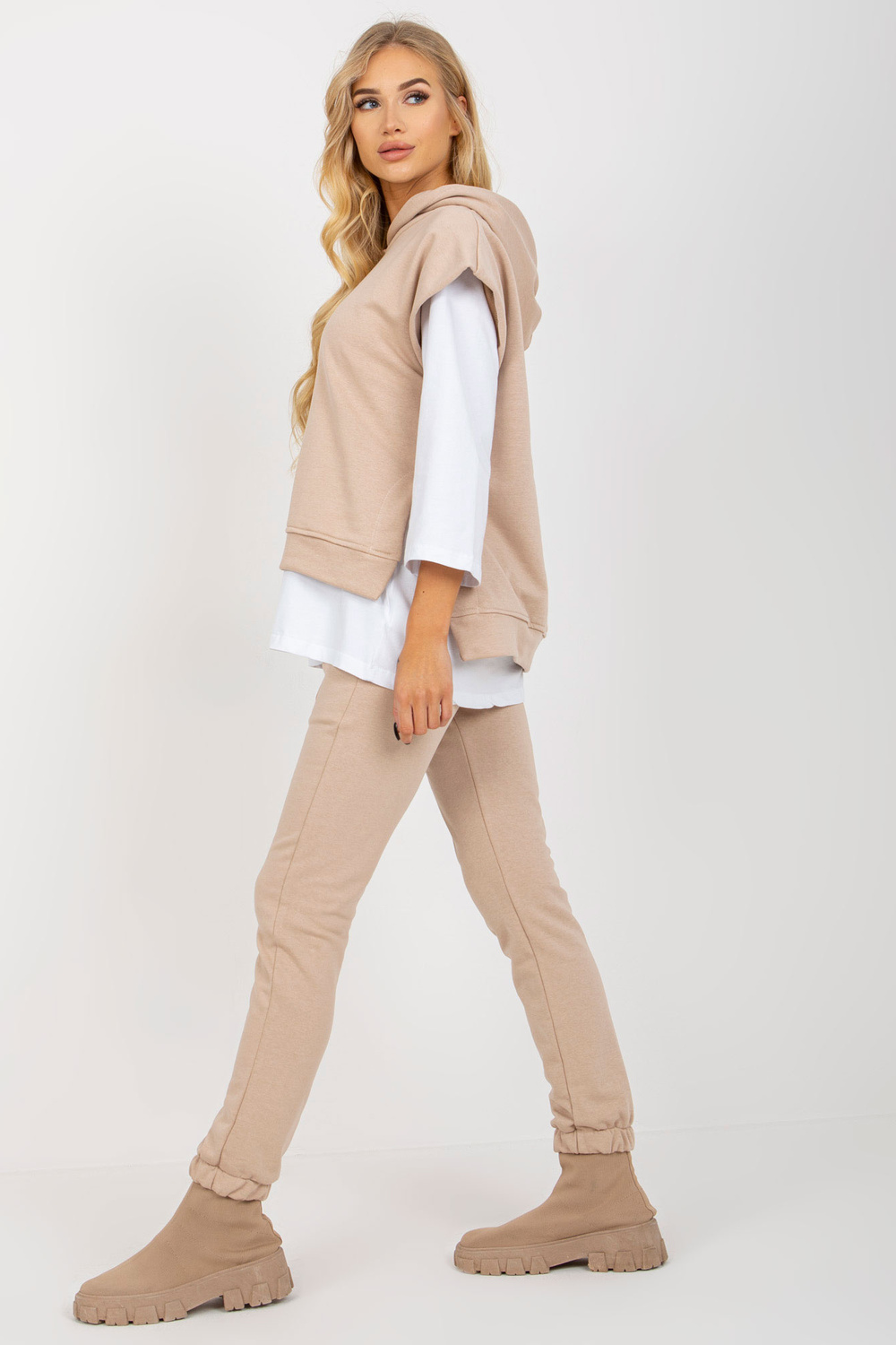 Bēšs trīsdaļīgs ikdienas komplekts ar biksēm.