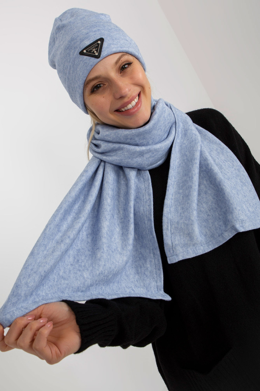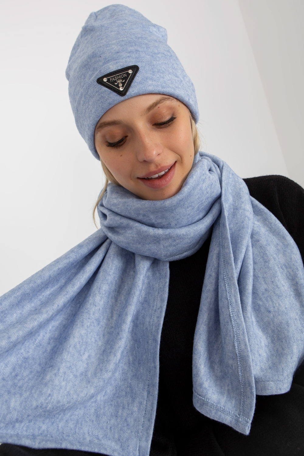 Zils divdaļīgs ziemas komplekts ar šalli.