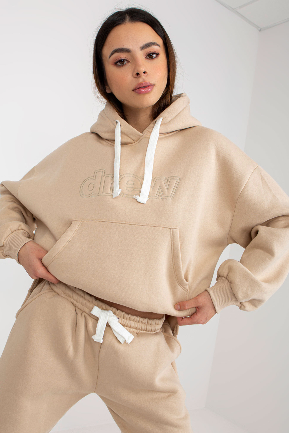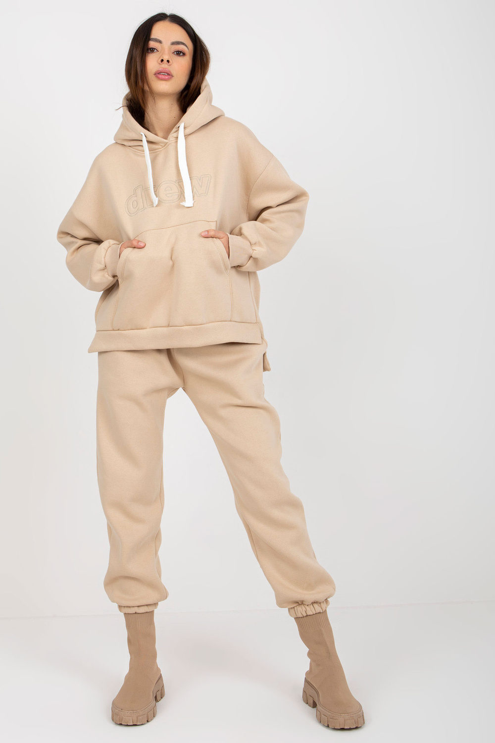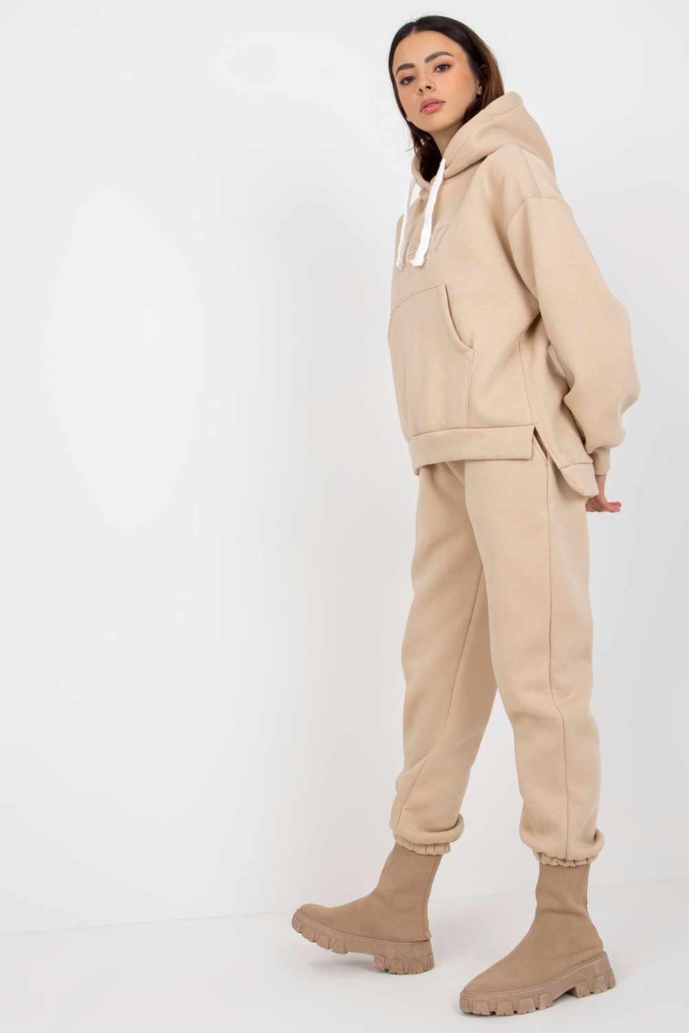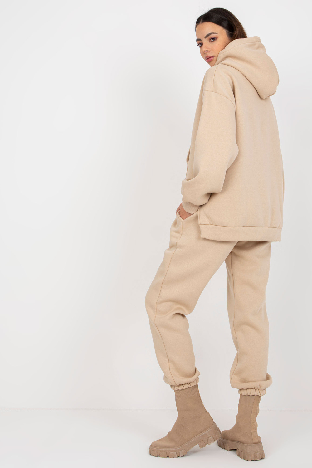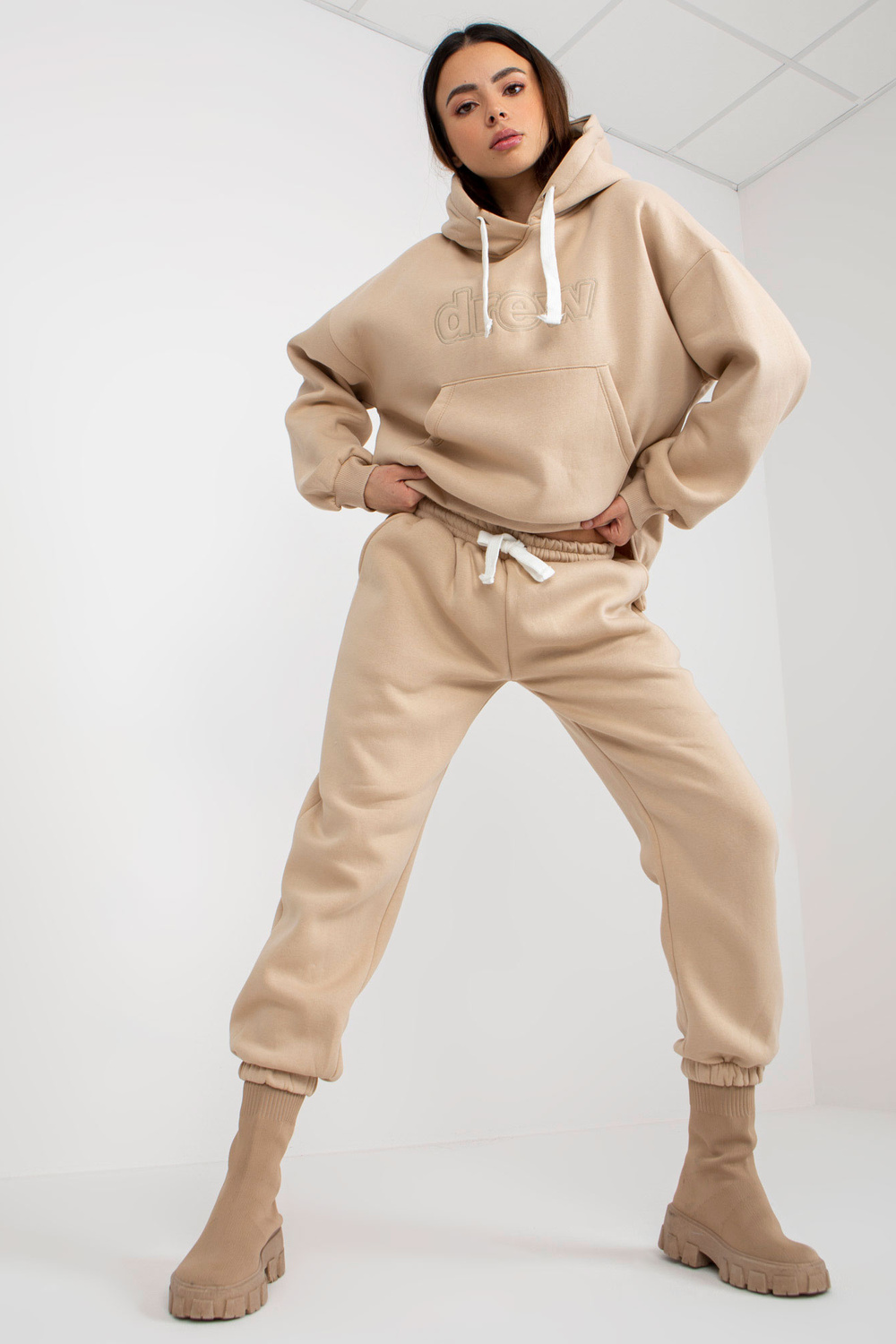 Bēšs divdaļīgs sporta krekla komplekts ar kapuci.