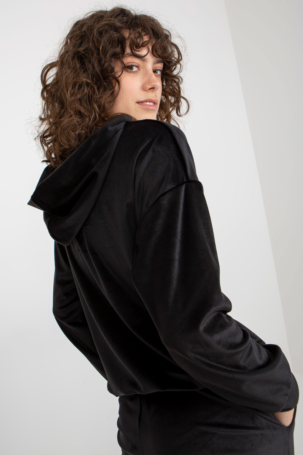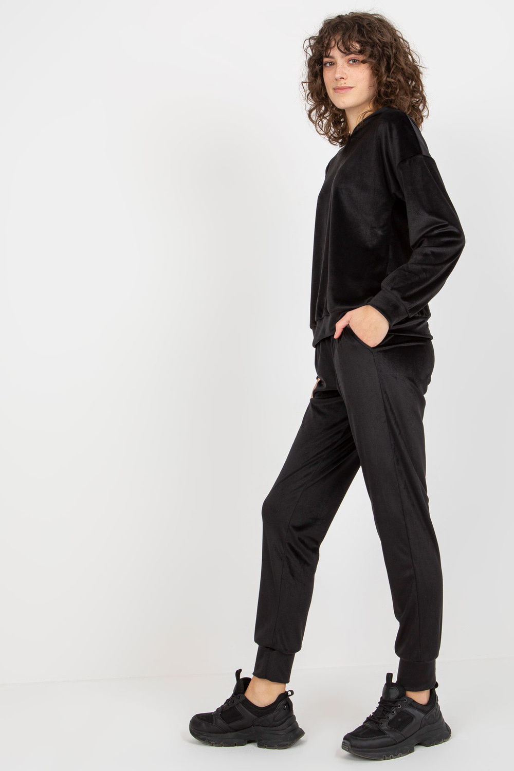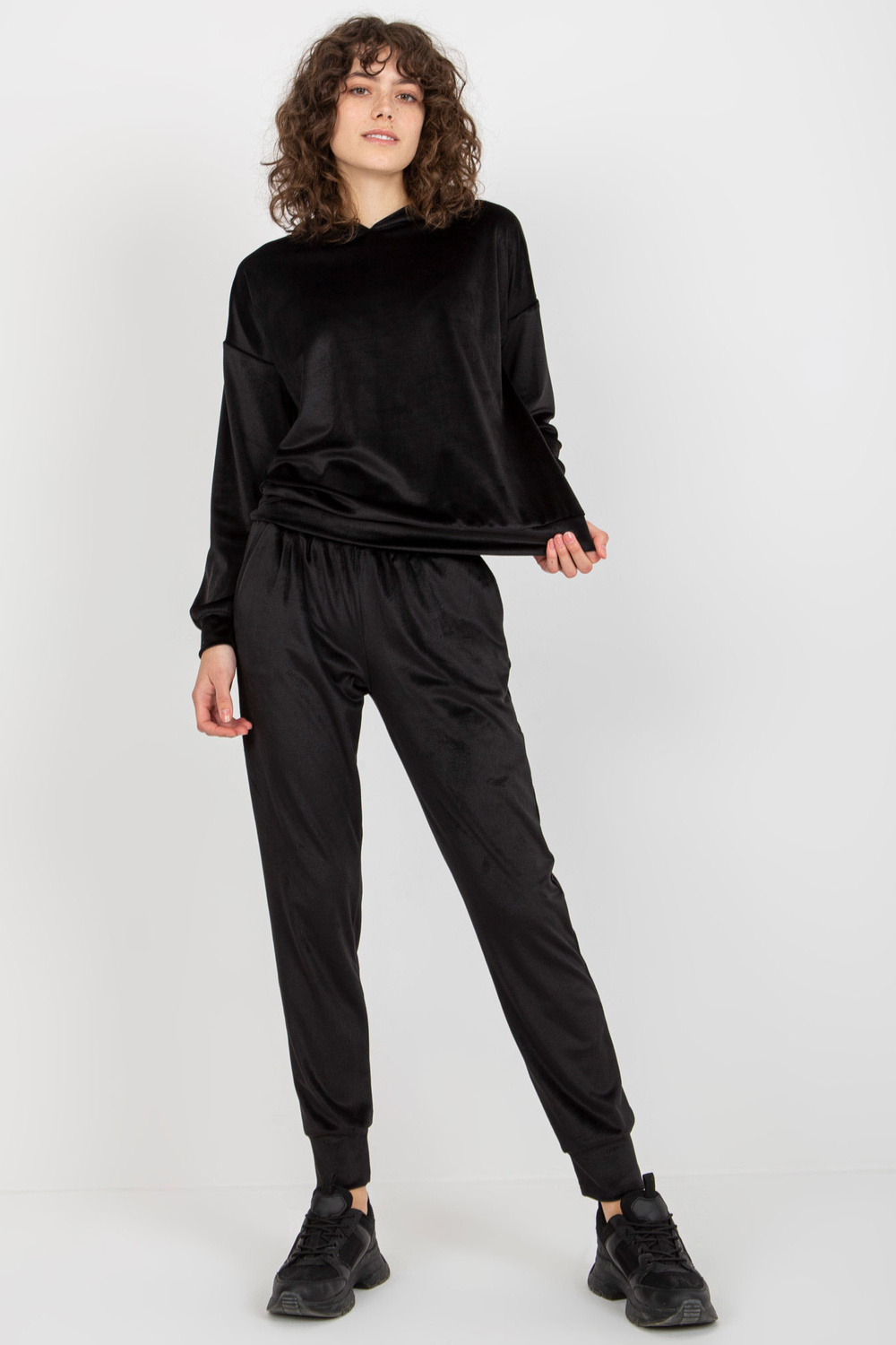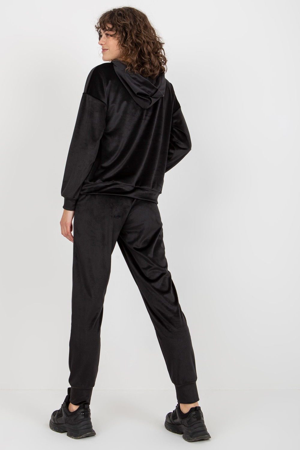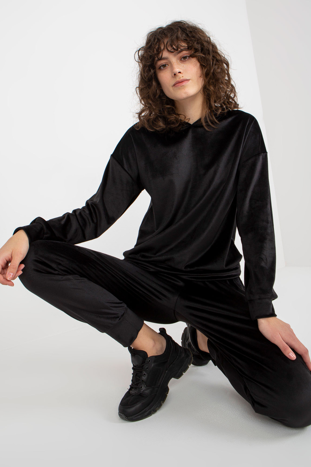 Melns sieviešu velūra komplekts ar sporta kreklu un biksēm.