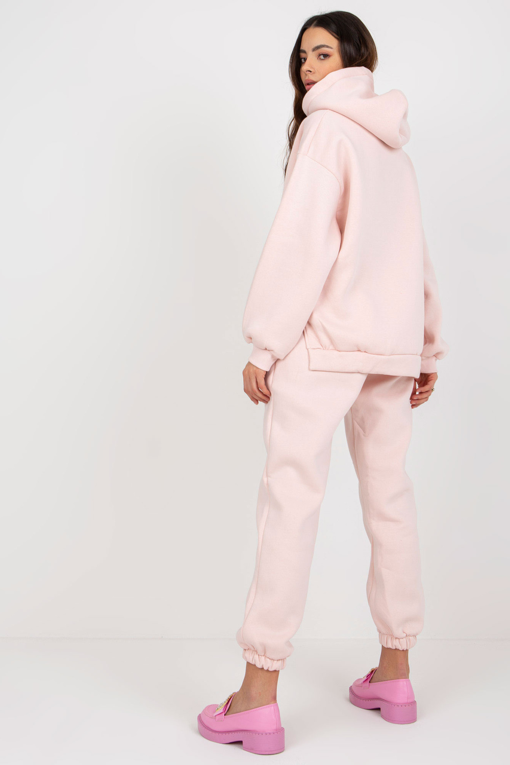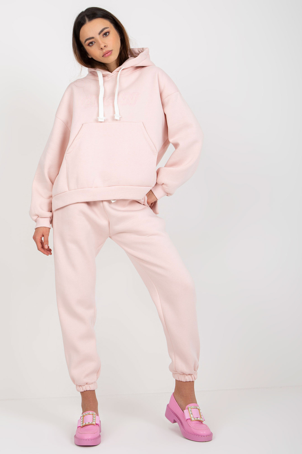 Gaiši rozā divdaļīgs treniņtērpa komplekts ar uzrakstu.
