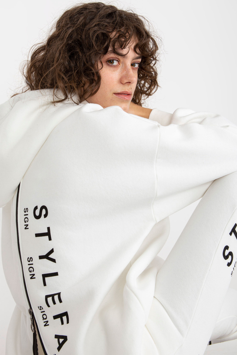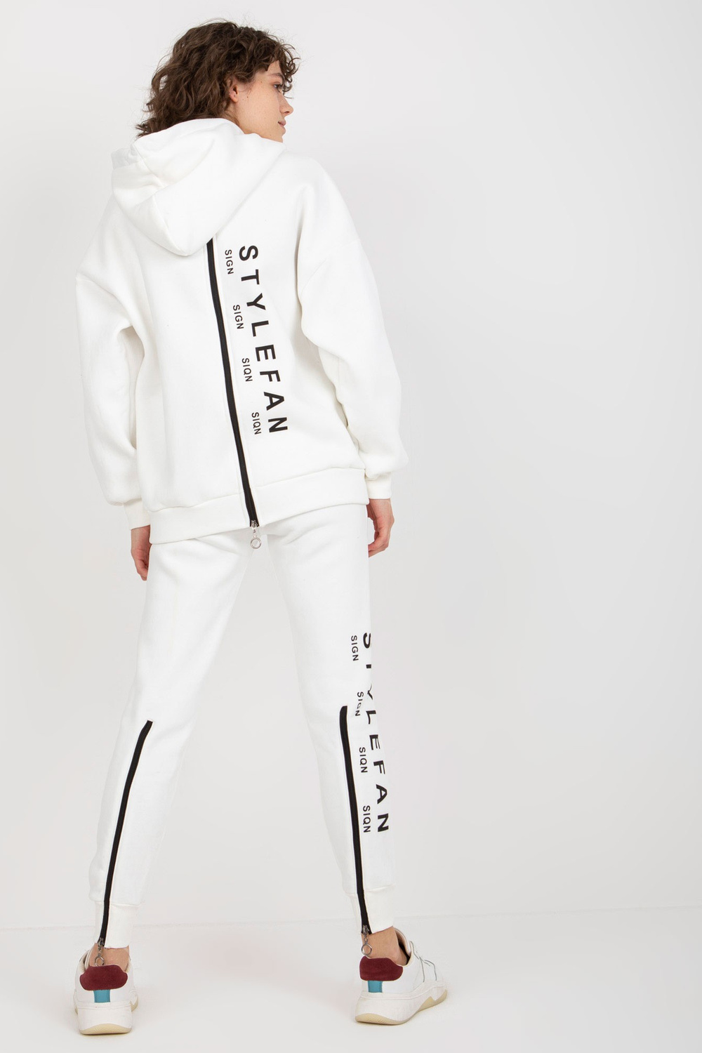 Ecru divdaļīgs treniņtērpa komplekts ar rāvējslēdzējiem un uzrakstiem.