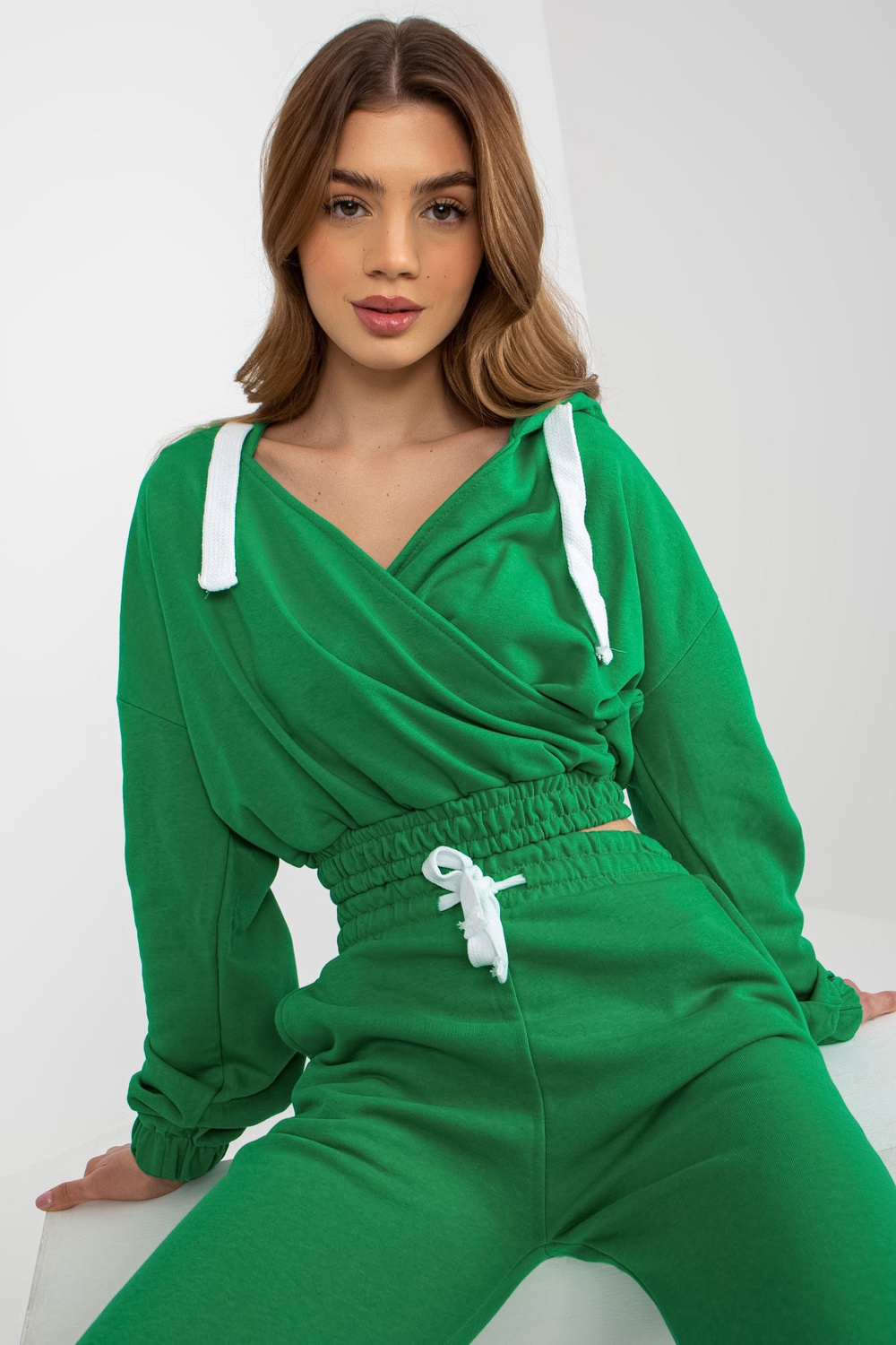 Zaļš sieviešu sporta kreklu komplekts ar īsu sporta kreklu. produkta kods: EM-KMPL-747.06P dominējošais raksts: gluds Stils: ikdienišķs gadījums: ikdienišķs, ārpus pilsētas, pastaigāties Modele valkā viena izmēra izmēru. Modeļa izmēri: augums 173 cm, krūtis 78 cm