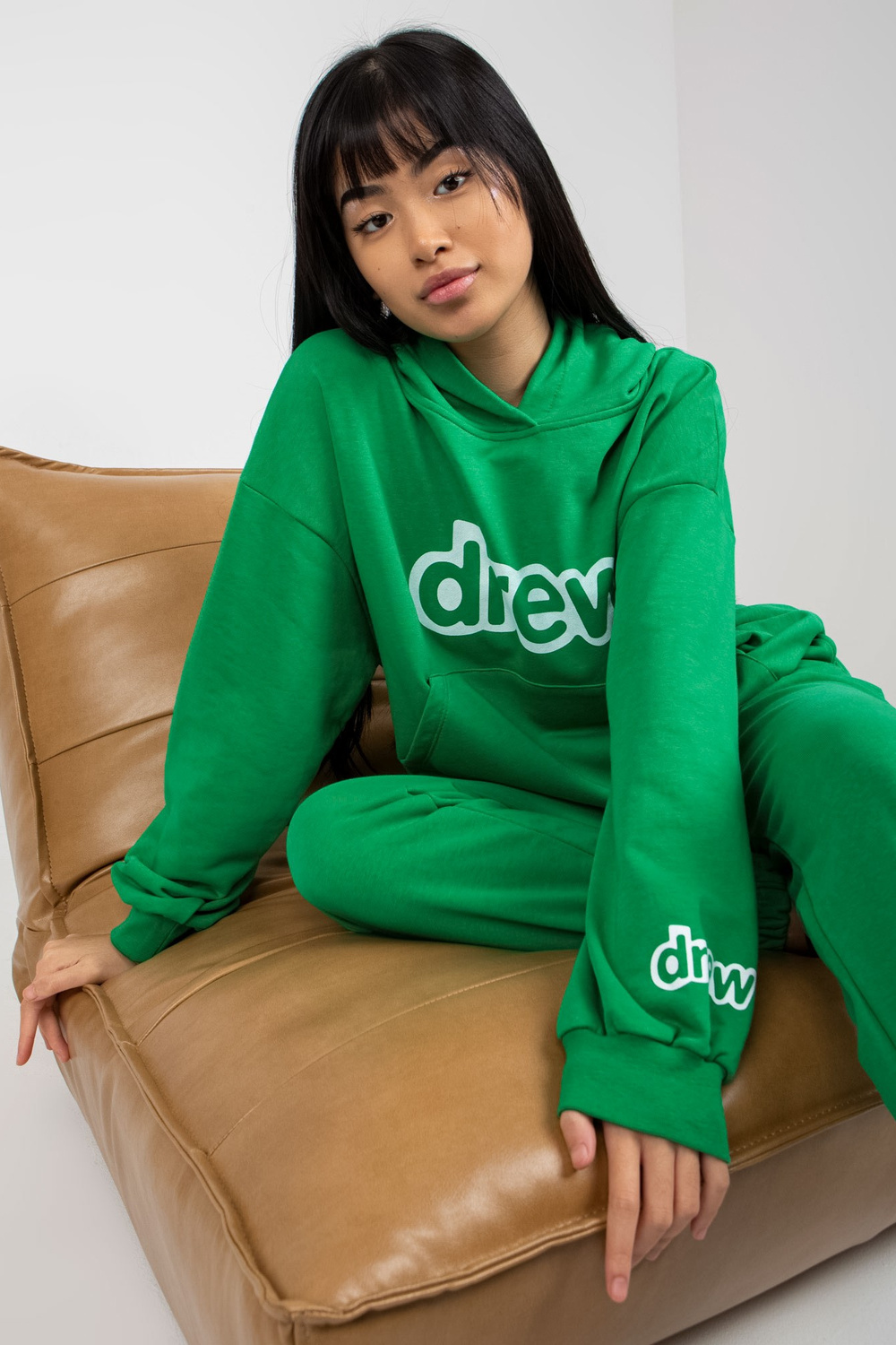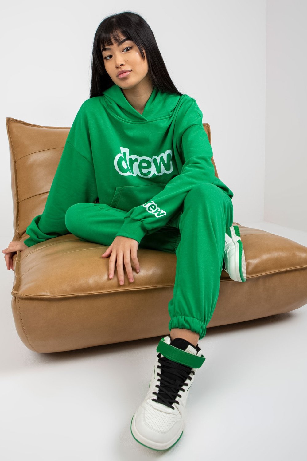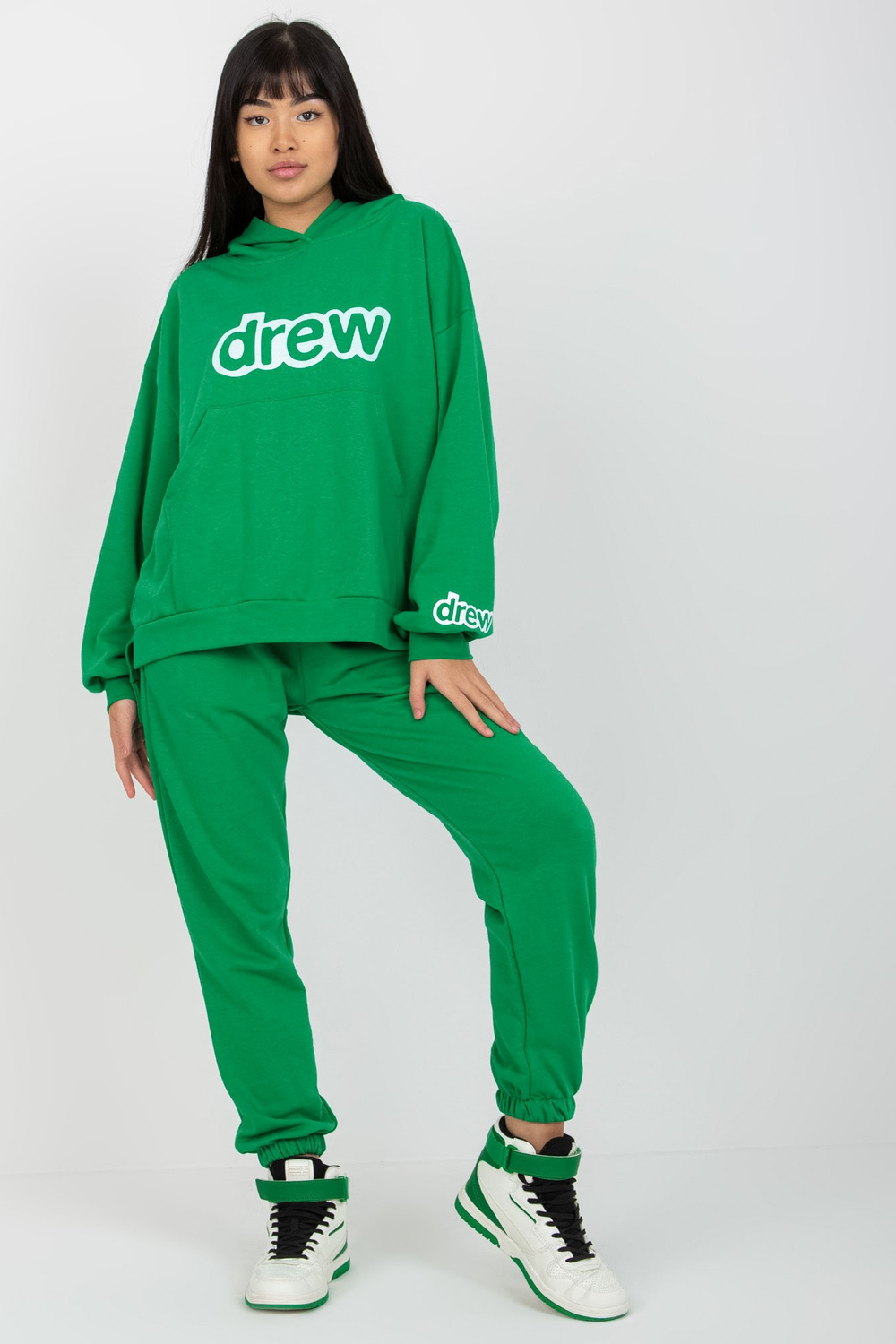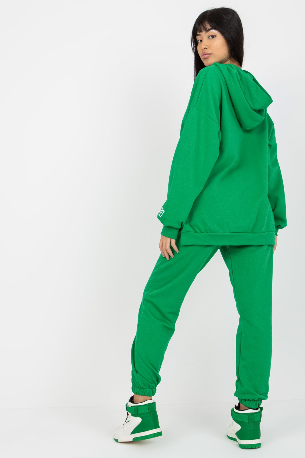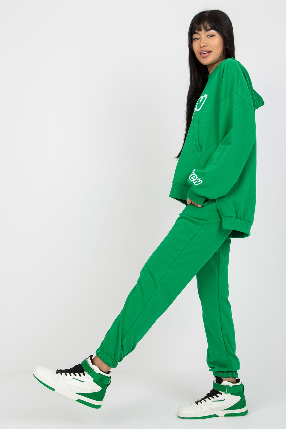 Zaļš divdaļīgs treniņtērpa komplekts ar uzrakstiem.