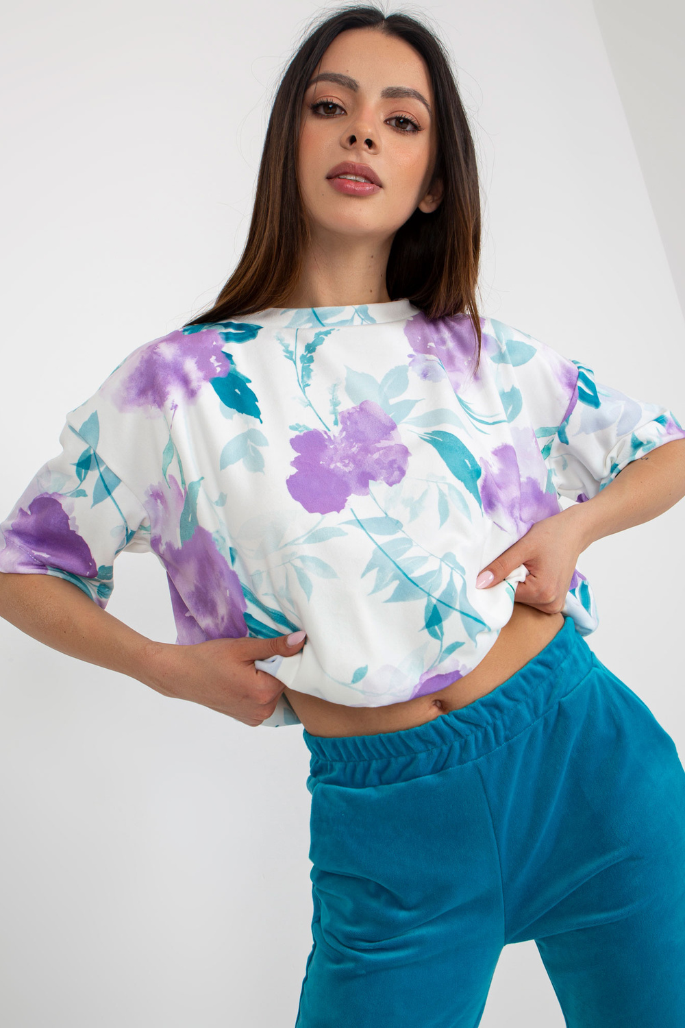 Komplekta izmēri S izmērā mēra uz plakanas: blūzes platums zem padusēm - 64 cm, blūzes garums - 60 cm, bikšu platums jostasvietā - 33 cm, vidukļa augstums - 28 cm, bikšu garums - 98 cm.