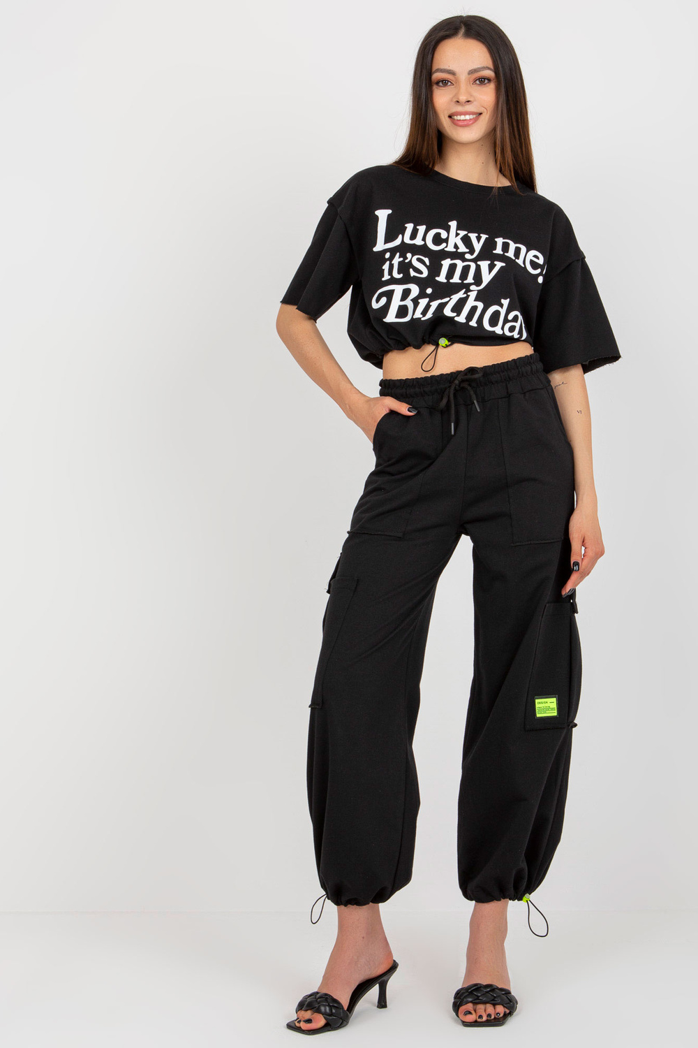 Komplekta izmēri S izmēram mēra uz plakanas: blūzes platums zem rokām - 57 cm, blūzes garums - 48 cm, bikšu platums jostasvietā - 35 cm, vidukļa augstums - 33 cm, bikšu garums - 99 cm.