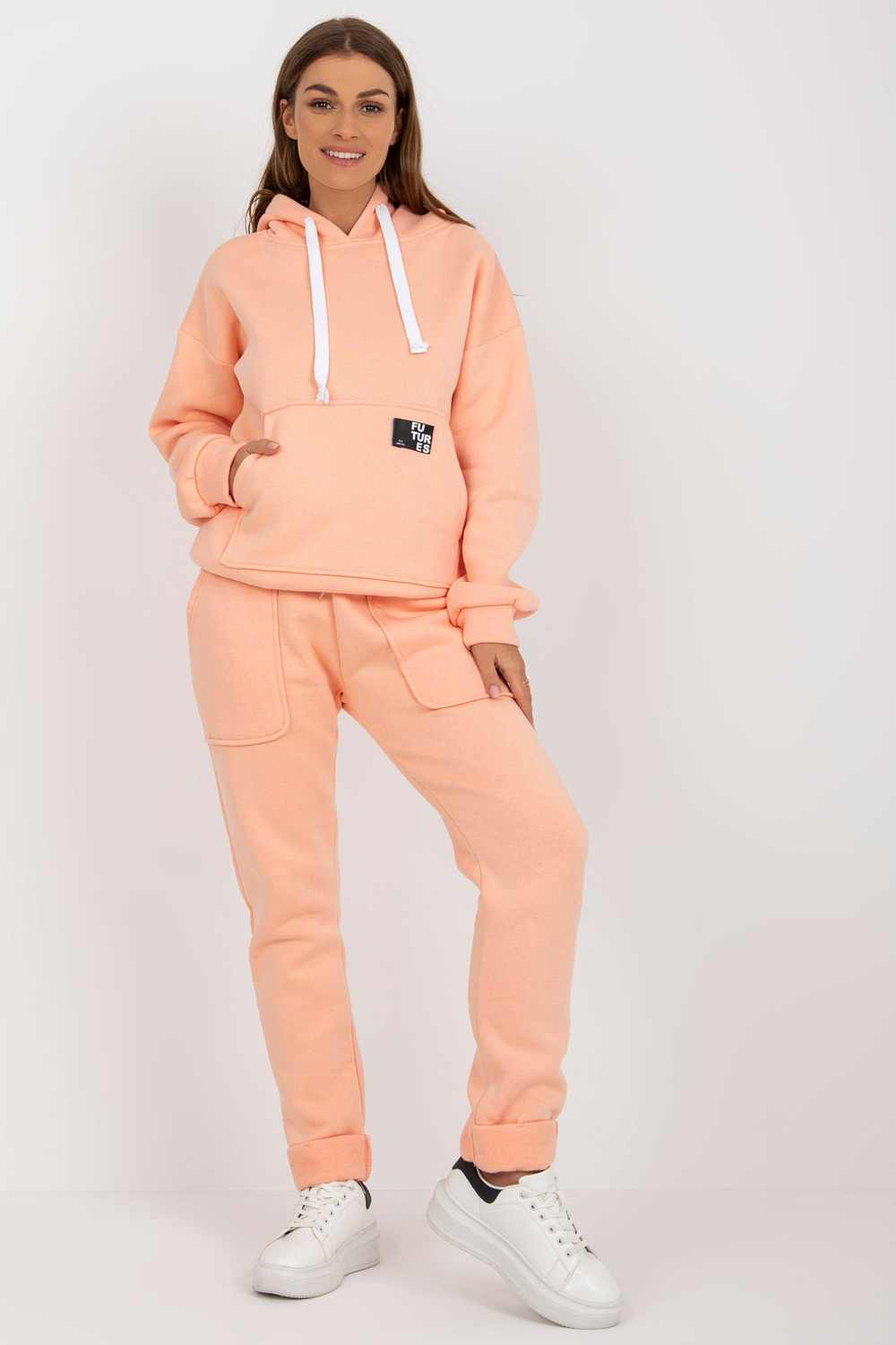 Persiku krāsas sieviešu sporta tērpa komplekts ar sildīšanu.