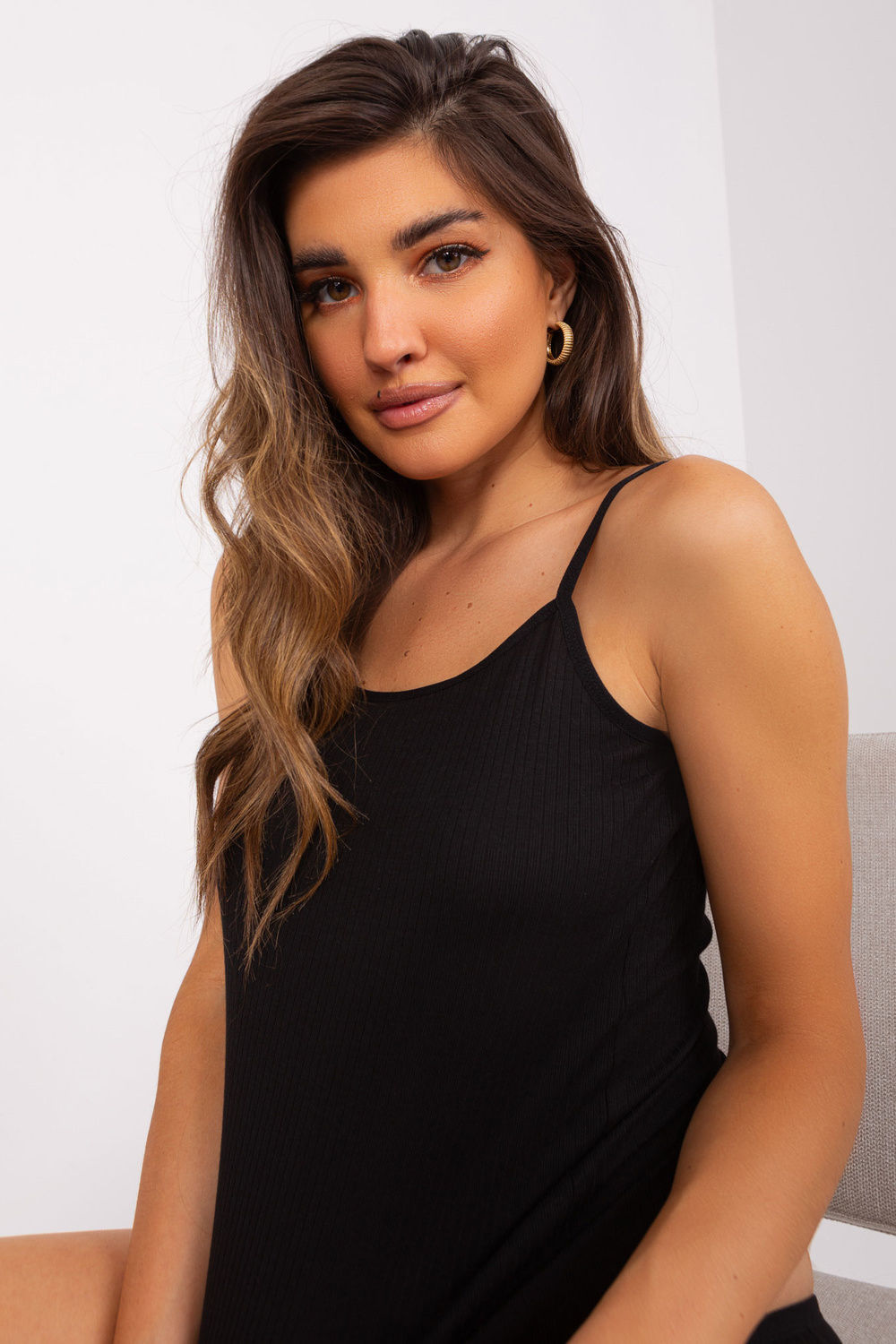 Iesniegtais komplekts sastāv no augšas un biksītes . Izgatavots elegantā melnā krāsā un izgatavots no rievota materiāla, kas piešķir tai neatkārtojamu šarmu. Klasiskais, apaļais kakla izgriezums lieliski izceļ krūtis, un dominējošais gludais raksts padara komplektu ārkārtīgi stilīgu.