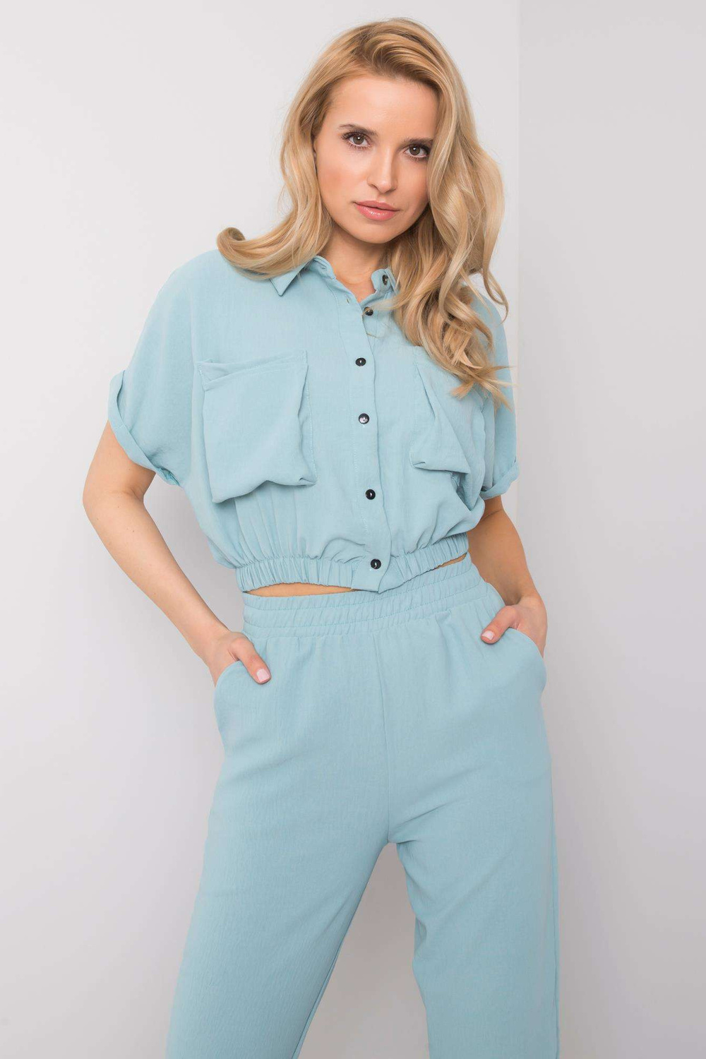 Komplekta izmēri S izmērā, mērot plakani: platums zem padusēm - 53 cm, blūzes garums - 40 cm, platums jostasvietā - 33 cm, bikšu garums - 89 cm