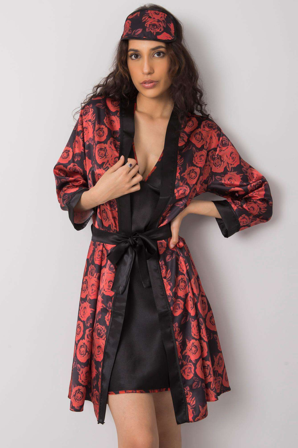Melnās gultas komplekts ar ziediem. komplektā ietilpst: naktskrekls, peldmētelis, aizsietas acis Materiāls: 100% poliestera mazgāšanas metode: veļas mašīna 30°C Modelis valkā S izmēru. Modeļa izmēri: augums 171 cm, krūštura 83 cm, viduklis 59 cm, gurni 86 cm.