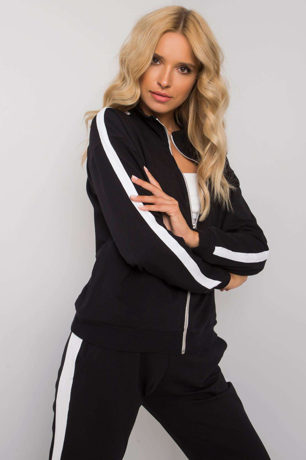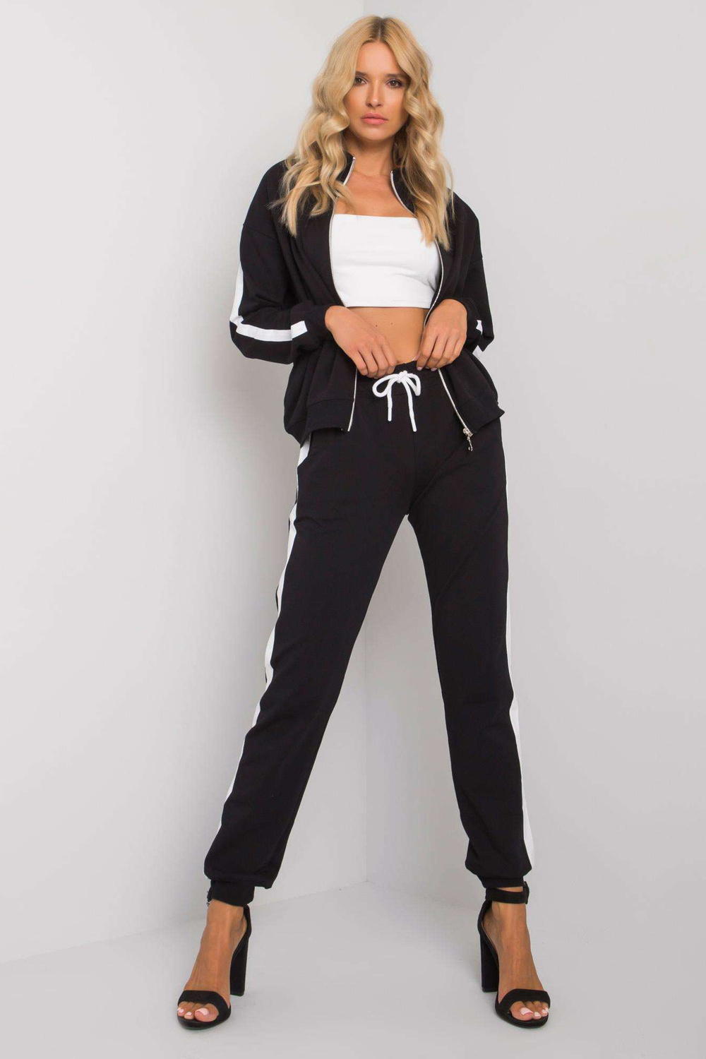 Melnsieviešu komplekts ar Aliana svītrām. Komplektā ietilpst: sporta krekls, bikšu materiālssastāvs: 90% kokvilna, 10% elastāns mazgāšanas metode: veļas mašīna 30°C. Modelis valkā S/M izmēru. Modeļa izmēri: augums 175 cm, krūtis 84 cm, viduklis 65 cm, gurni 92