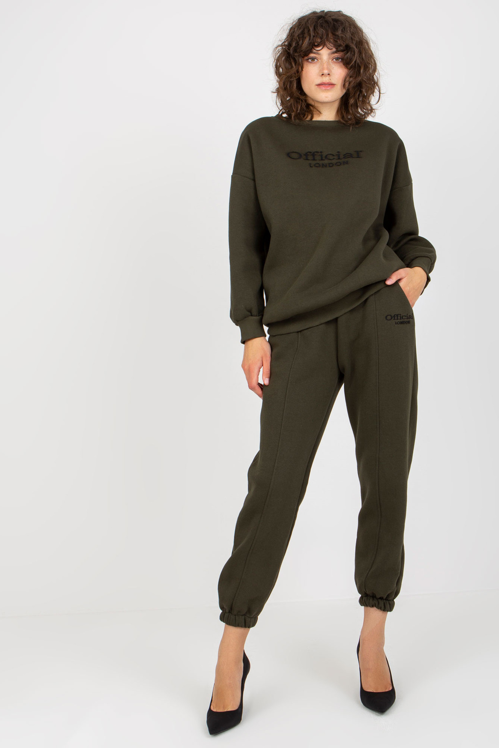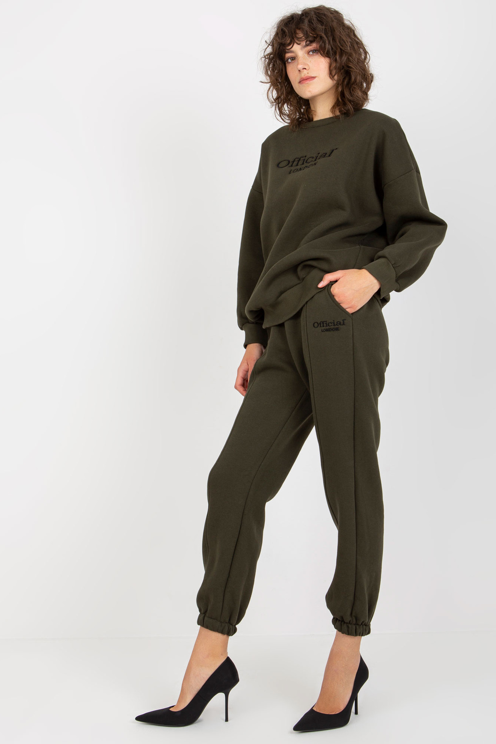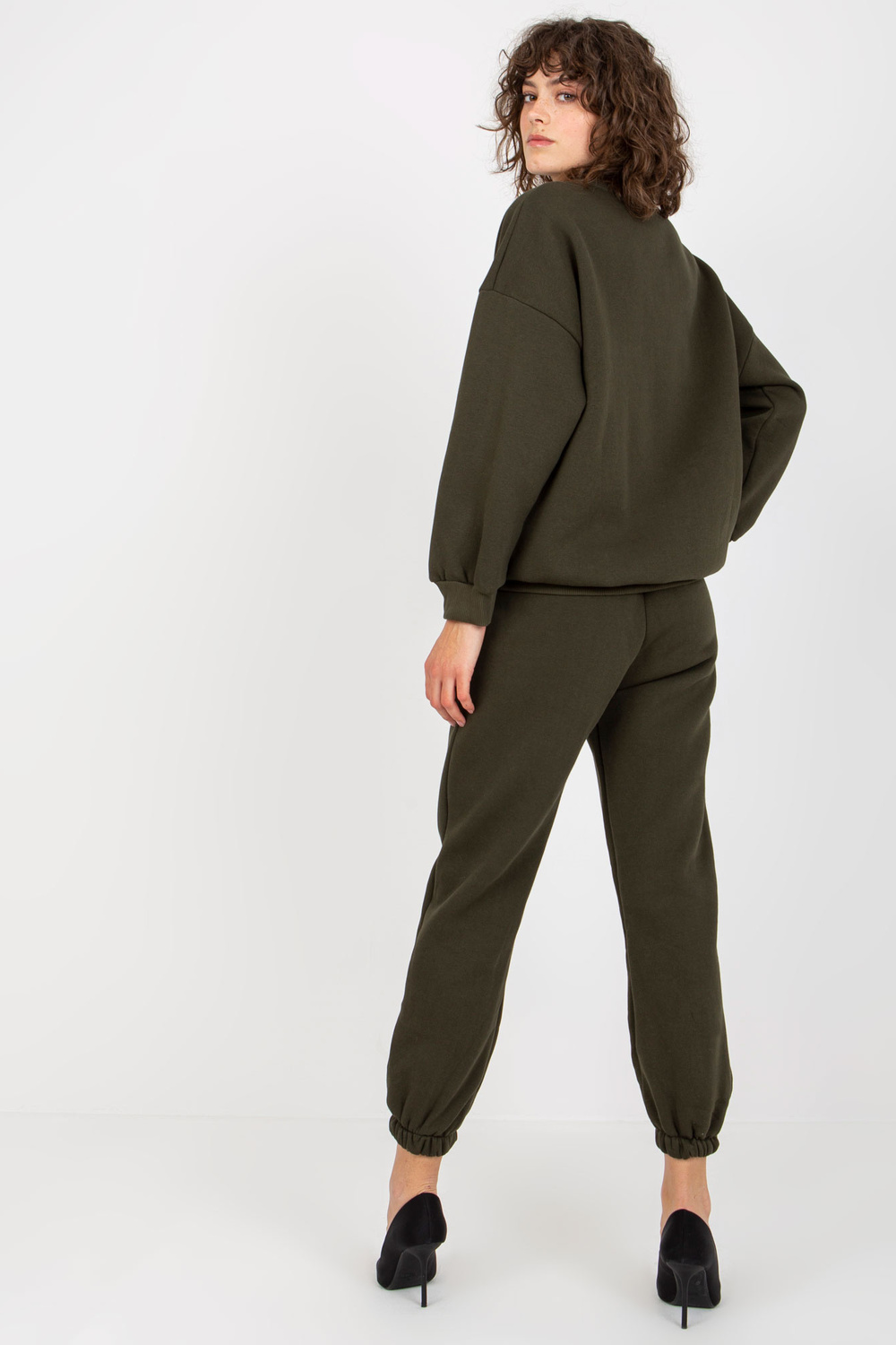 Khaki krāsas divdaļīgs treniņtērpa komplekts ar svītrām.