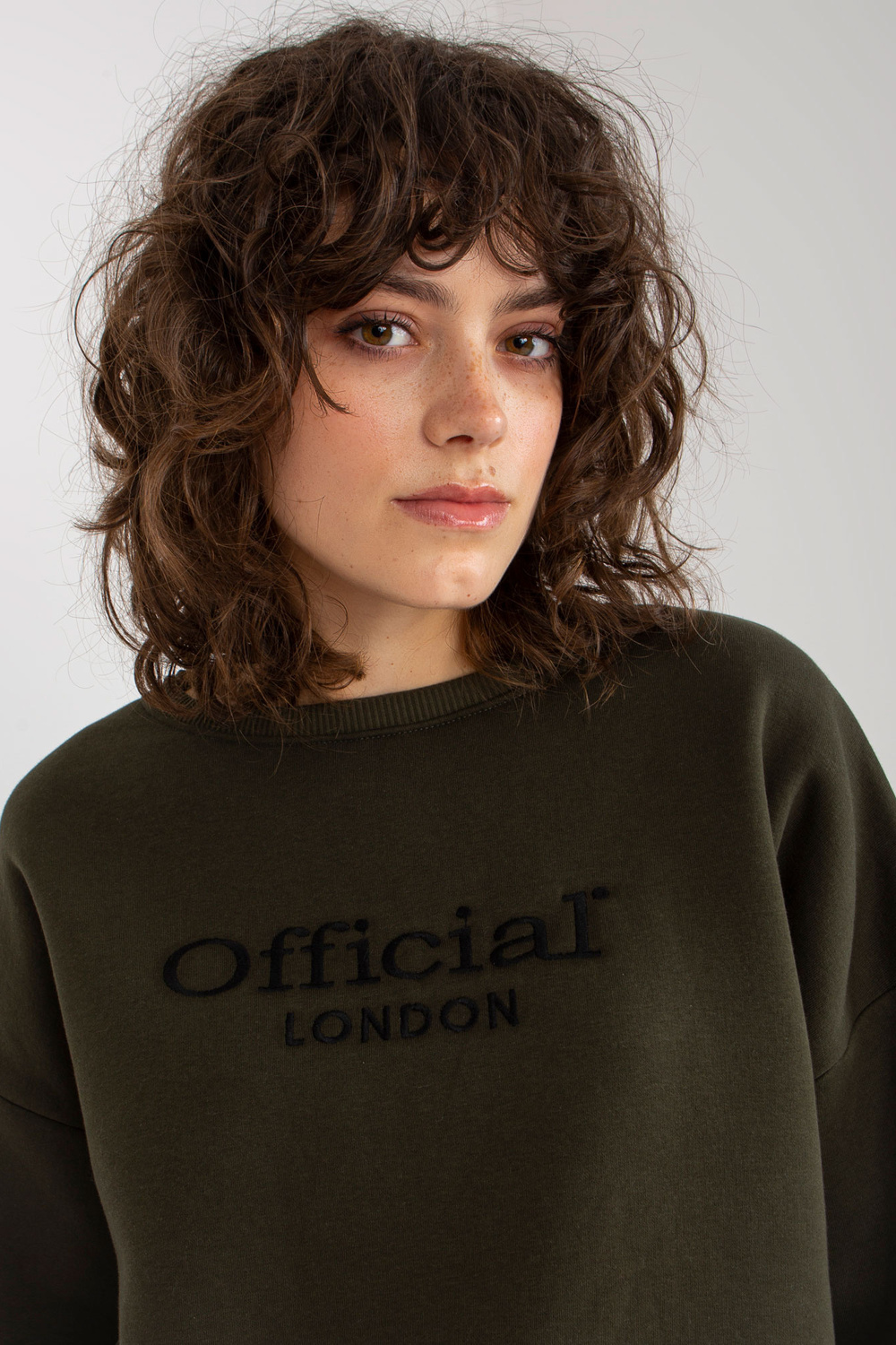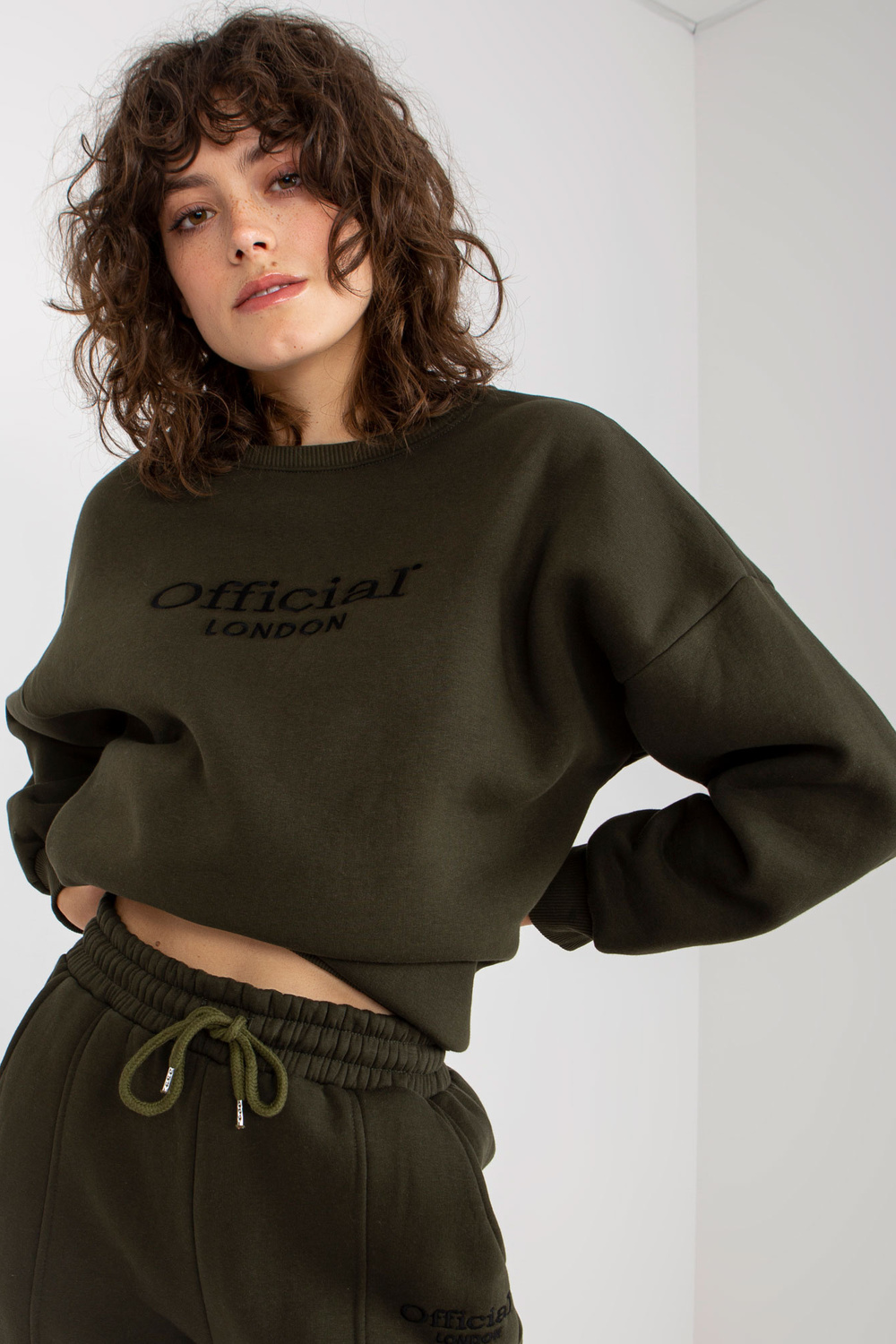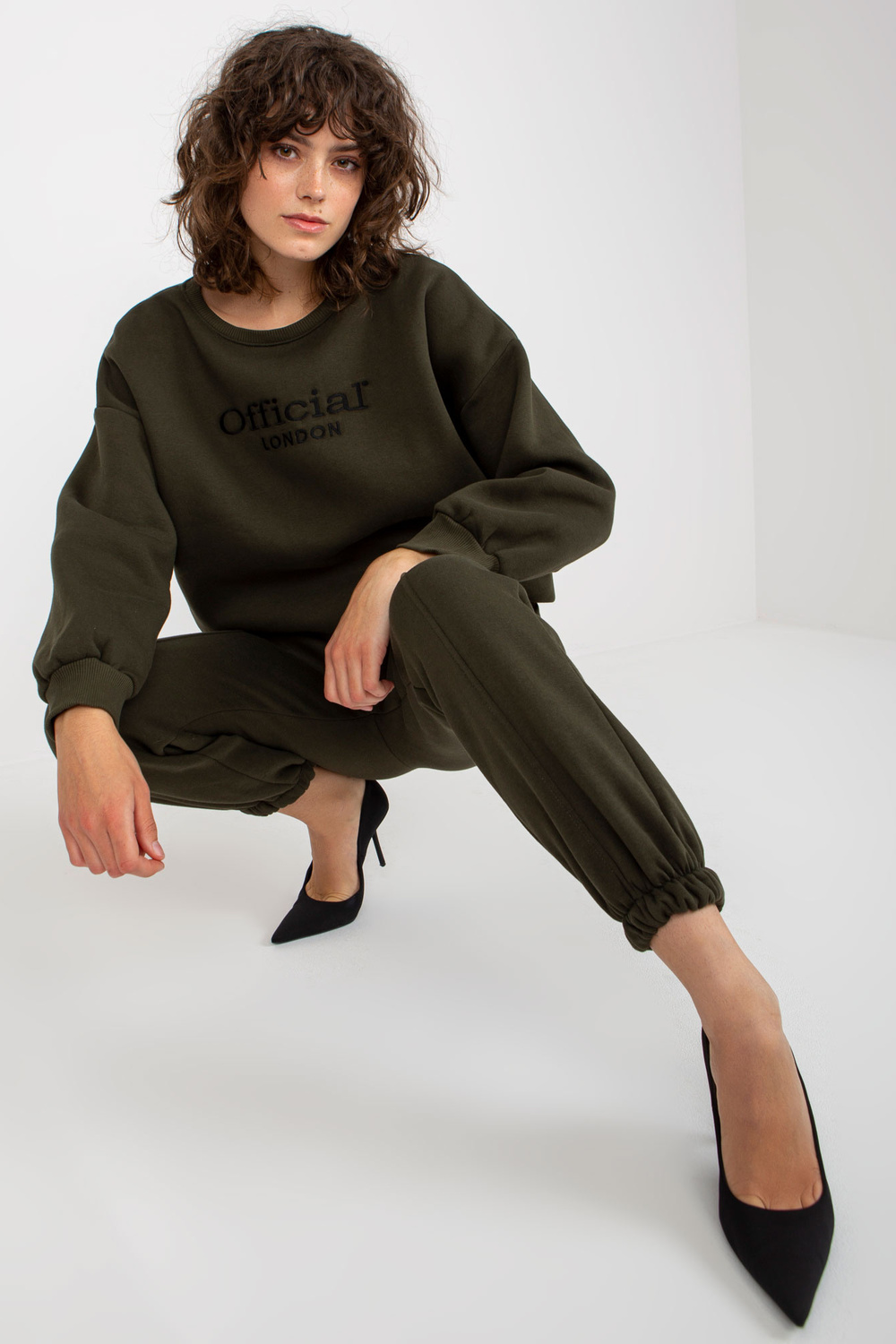 Khaki krāsas divdaļīgs treniņtērpa komplekts ar svītrām.